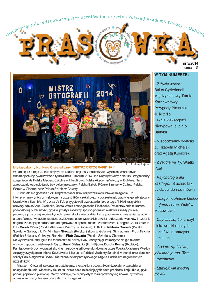 Dw u mi czn esię ik owany redag p r ze z u c z n i ów i n a u c z yc i e l i Po l s k i e j Ak a d e m ii Wie dz yw Du bli n nr 3/2014 cena 1 € W TYM NUMERZE: - Z życia szkoły: Bal w Cyrkolandii, Międzyklasowy Turniej Karnawałowy, Przygody Plastusia i Julki z 1b, Lekcja kleksografii, Nietypowa lekcja o Bałtyku - Niecodzienny wywiad z... Izabelą Michalak oraz Agatą Kumorek fot. Andrzej Lejman Międzyszkolny Konkurs Ortograficzny “MISTRZ ORTOGRAFII” 2014 W sobotę 15 lutego 2014 r. przybyli do Dublina najlepsi z najlepszych- wyłonieni w szkolnych eliminacjach- by rywalizować o tytuł Mistrza Ortografii 2014. Ten Międzyszkolny Konkurs Ortograficzny zorganizowała Polska Macierz Szkolna w Irlandii oraz Polska Akademia Wiedzy w Dublinie. Na ich zaproszenie odpowiedziały trzy polonijne szkoły: Polska Szkoła Równe Szanse w Carlow, Polska Szkoła w Clonmel oraz Polska Szkoła w Galway. Punktualnie o godzinie 12.00 reprezentanci szkół rozpoczęli konkursowe zmagania. Po intensywnym wysiłku umysłowym na uczestników czekał pyszny poczęstunek oraz występ artystyczny. Uczniowie z klas: IVa, IV b oraz Va i Vb przygotowali przedstawienie o ortografii. Nad wszystkim czuwały panie: Anna Siecińska, Beata Wanic oraz Agnieszka Piechocka. Przedstawienie to bardzo podobało się publiczności, gdyż w prosty i zabawny sposób pokazało niełatwe zasady polskiej pisowni, a przy okazji można było otrzymać słodką niespodziankę za poprawne rozwiązanie zagadki ortograficznej. I wreszcie nadeszła oczekiwana przez wszystkich chwila- ogłoszenie wyników i rozdanie nagród. Komisja po skrupulatnym sprawdzeniu prac ustaliła, że Mistrzami Ortografii 2014 zostali: kl.I - Sarah Pióro (Polska Akademia Wiedzy w Dublinie), kl.II- III - Wiktoria Buczek (Polska Szkoła w Galway), kl.IV- VI - Igor Głuszek (Polska Szkoła w Galway), Gimnazjum - Piotr Sekuła (Polska Szkoła w Galway), Rodzice - Piotr Zawada (Polska Szkoła w Clonmel) Na wyróżnienie zasługują też reprezentanci szkoły PAK, którzy zajęli zaszczytne drugie miejsce w swoich grupach wiekowych. Są to: Karol Bielaszka (kl. II-III) oraz Dorota Kenny (Rodzice). Pamiątkowe dyplomy oraz atrakcyjne nagrody książkowe ufundowane przez Polską Akademię Wiedzy wręczyły zwycięzcom: Marta Szutkowska-Kiszkiel z Polskiej Macierzy Szkolnej w Irlandii oraz dyrektor szkoły PAK Małgorzata Rosek. Nie zabrakło też pamiątkowego zdjęcia z udziałem nagrodzonych uczestników. Mistrzom Ortografii serdecznie gratulujemy, a wszystkim uczestnikom dziękujemy za udział w naszym konkursie. Cieszymy się, że tak wiele osób mieszkających poza granicami kraju dba o język polski i poprawną pisownię. Mamy nadzieję, że w przyszłym roku spotkamy się znowu, by w miłej atmosferze ruszyć tropem ortograficznych zagadek. - Z religią na Ty: Wielki Post - Psychologia dla każdego: Słuchać tak, by dzieci do nas mówiły - Zakątki w Polsce bliskie mojemu sercu: Ostrów Mazowiecka - Czy wiecie, że..., czyli ciekawostki naszych uczniów i o naszych uczniach - Coś na ząbki dwa, jeśli ktoś je ma- Tort urodzinowy - Łamigłówki mądrej główki ie Z ŻYCIA SZKOŁY BAL W CYRKOLANDII stycznia 2014r. odbył się w szkole PAK bal karnawałowy dla przedszkolaków i uczniów klas 1-3 pod hasłem “Cyrk wita Was!” Sala gimnastyczna zamieniła się w Cyrkolandię. Kolorowy namiot cyrkowy udekorowany balonami, serpentynami i plakatami zachęcał do karnawałowej zabawy. W szkole zaroiło się od cyrkowych zwierzątek: tygrysów, pająków, kotków, królików, motyli, biedronek, zebr. Atrakcją balu byli kolorowi Klauni: Linoskoczek, Żongler, Siłacz, Wesołek, Treser. Umilali dzieciom czas w trakcie trwania zabawy. Nie zabrakło pokazu żonglowania, tańca z szarfą, sztuczki z hula hop oraz przeciągania liny. Dzieci wraz z Klaunami bawiły się przy rytmach cyrkowej muzyki, tworząc koła, wężyki i pary. Wszyscy bawili się znakomicie, bo humor dopisywał zarówno dzieciom jak i wychowawcom. Były niespodzianki i słodkie prezenty. Jednym słowem zabawa na 102!!! Mamy nadzieją, że bal przebierańców w przyszłym roku będzie równie udany jak tegoroczny. 18 MIĘDZYKLASOWY TURNIEJ KARNAWAŁOWY Uczniowie klas IV -VI i gimnazjum postanowili troszkę odejść od karnawałowych zwyczajów i zamiast tradycyjnego balu urządzili 25 stycznia Międzyklasowy Turniej Karnawałowy. Polegał on na współzawodnictwie między klasami w szeregu konkurencjach sportowych o główną nagrodę, czyli brak zadania domowego na najbliższą sobotę. Wszystkie klasy spisały się doskonale. Zawody zakończyły się zwycięstwem dwóch drużyn: zielonej, czyli klasy Va i żółtej, czyli klasy VI i gimnazjum. Dzieci z ogromnym zaangażowaniem brały udział we wszystkich konkurencjach. Był na przykład slalom z woreczkiem na głowie, slalom na jednej nodze czy wyścig par z balonem trzymanym policzkami. Najwięcej emocji i śmiechu wzbudziła ostatnia konkurencja, która polegała na stworzeniu stroju karnawałowego przy użyciu jednej rolki papieru toaletowego i jednej rolki folii kuchennej. Dzieci wykazały się niezwykłą kreatywnością i dużą dozą humoru. fot. Andrzej Lejman NIETYPOWA LEKCJA O BAŁTYKU Jakie ryby pływają w Morzu Bałtyckim? Co to jest plankton? Jak powstają bursztyny? Jak należy zachować się nad wodą? Na te i wiele innych pytań odpowiedzi szukali uczniowie klasy 5a i 5b. Na zajęciach Wiedzy o Polsce postanowiliśmy opracować informator 2 o Bałtyku. Na początku każdy przedstawił przygotowane przez siebie wiadomości, a następnie rozpoczęliśmy przyjemniejszą część lekcji, czyli wyklejanie i malowanie. Każdy pracował w pocie czoła, by na koniec móc podziwiać piękny i pełen ciekawych wiadomości przewodnik. Efekty naszej pracy można zobaczyć na zdjęciach. Z ŻYCIA SZKOŁY LEKCJA KLEKSOGRAFII Na lekcjach języka polskiego w klasie 4b omawialiśmy nasza drugą lekturę szkolną pod tytułem “Akade