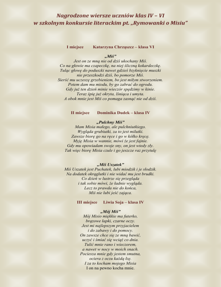 Nagrodzone wiersze uczniów klas IV – VI w szkolnym konkursie literackim pt. „Rymowanki o Misiu” I miejsce Katarzyna Chrząszcz – klasa VI „Miś” Jest on ze mną nie od dziś ukochany Miś. Co na głowie ma czapeczkę, na niej śliczną kokardeczkę. Tuląc głowę do poduszki nawet gdzieś bzyknięcie muszki nie przeszkodzi dziś, bo pomorze Miś. Sierść mu uczeszę grzebieniem, bo jest miłym stworzeniem. Potem dam mu miodu, by go zabrać do ogrodu. Gdy już ten dzień minie wieczór spędzimy w kinie. Teraz śpię już okryta, lśniąca i umyta. A obok mnie jest Miś co pomaga zasnąć nie od dziś. II miejsce Dominika Dudek – klasa IV „Pulchny Miś” Mam Misia małego, ale pulchniutkiego. Wygląda grubiutki, za to jest milutki. Zawsze biorę go na ręce i go w kółko kręcę. Myję Misia w wannie, mówi że jest fajnie. Gdy mu opowiadam swoje sny, on jest wtedy zły. Tak więc biorę Misia czule i go jeszcze raz przytulę „Miś Uszatek” Miś Uszatek jest Puchatek, lubi miodzik i je słodzik. Na dodatek okrąglutki i nie widać mu jest brudki. Co dzień w lustrze się przegląda i tak sobie mówi, że ładnie wygląda. Lecz to prawda nie do końca, Miś nie lubi jeść zająca. III miejsce Liwia Soja – klasa IV „Mój Miś” Mój Misio miękkie ma futerko, brązowe łapki, czarne oczy. Jest mi najlepszym przyjacielem i do zabawy i do pomocy. On zawsze chce się ze mną bawić, uczyć i śmiać się wciąż co dnia. Tulić mnie rano i wieczorem, a nawet w nocy w moich snach. Pociesza mnie gdy jestem smutna, ociera z oczu każdą łzę. I za to kocham mojego Misia I on na pewno kocha mnie.