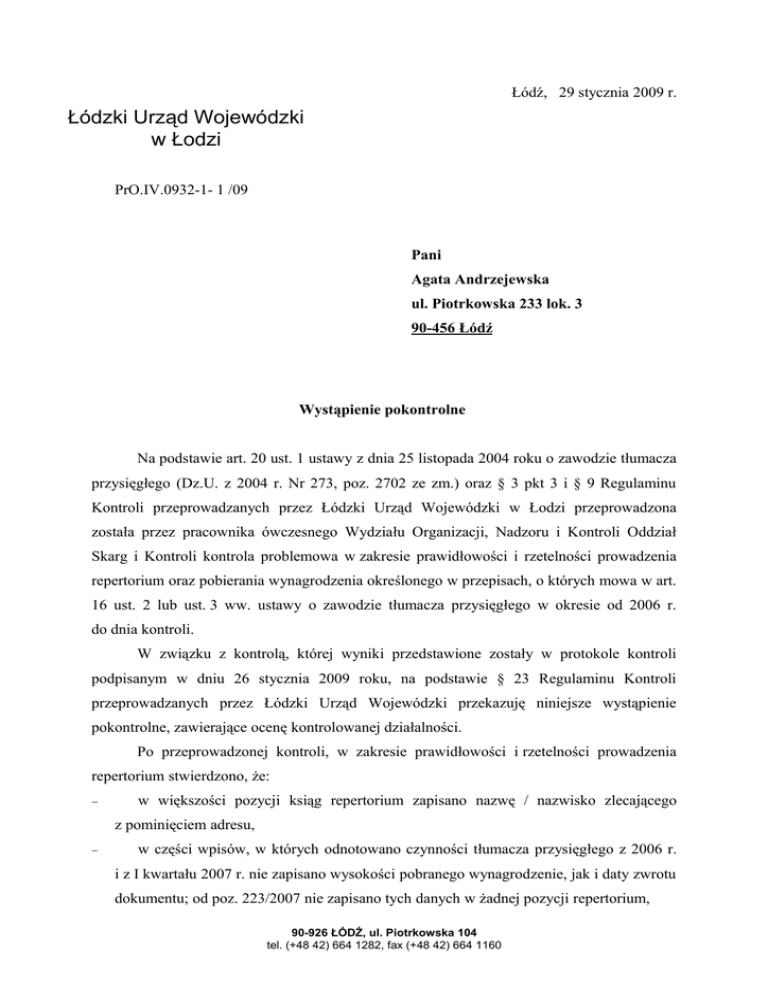 Łódź, 29 stycznia 2009 r. Łódzki Urząd Wojewódzki w Łodzi PrO.IV.0932-1- 1 /09 Pani Agata Andrzejewska ul. Piotrkowska 233 lok. 3 90-456 Łódź Wystąpienie pokontrolne Na podstawie art. 20 ust. 1 ustawy z dnia 25 listopada 2004 roku o zawodzie tłumacza przysięgłego (Dz.U. z 2004 r. Nr 273, poz. 2702 ze zm.) oraz § 3 pkt 3 i § 9 Regulaminu Kontroli przeprowadzanych przez Łódzki Urząd Wojewódzki w Łodzi przeprowadzona została przez pracownika ówczesnego Wydziału Organizacji, Nadzoru i Kontroli Oddział Skarg i Kontroli kontrola problemowa w zakresie prawidłowości i rzetelności prowadzenia repertorium oraz pobierania wynagrodzenia określonego w przepisach, o których mowa w art. 16 ust. 2 lub ust. 3 ww. ustawy o zawodzie tłumacza przysięgłego w okresie od 2006 r. do dnia kontroli. W związku z kontrolą, której wyniki przedstawione zostały w protokole kontroli podpisanym w dniu 26 stycznia 2009 roku, na podstawie § 23 Regulaminu Kontroli przeprowadzanych przez Łódzki Urząd Wojewódzki przekazuję niniejsze wystąpienie pokontrolne, zawierające ocenę kontrolowanej działalności. Po przeprowadzonej kontroli, w zakresie prawidłowości i rzetelności prowadzenia repertorium stwierdzono, że: − w większości pozycji ksiąg repertorium zapisano nazwę / nazwisko zlecającego z pominięciem adresu, − w części wpisów, w których odnotowano czynności tłumacza przysięgłego z 2006 r. i z I kwartału 2007 r. nie zapisano wysokości pobranego wynagrodzenie, jak i daty zwrotu dokumentu; od poz. 223/2007 nie zapisano tych danych w żadnej pozycji repertorium, 90-926 ŁÓDŹ, ul. Piotrkowska 104 tel. (+48 42) 664 1282, fax (+48 42) 664 1160 − w poz. 459/2006 odnotowano czynność tłumacza przysięgłego dla zleceniodawcy prywatnego, a powyżej tego wpisu zamieszczono zapis o treści: „z tym samym n-rem zaświadczenie o niekaralności ...”, − w niektórych przypadkach, gdy zleceniodawca żądał wykonania tłumaczenia kilku dokumentów, data zwrotu dokumentu i wysokość pobranego wynagrodzenia zostało zapisane łącznie dla tych kilku dokumentów, po oznaczeniu klamrą wpisów, których to dotyczy (poz. 2 - 6/2007), − w niektórych pozycjach poza datą zlecenia, nazwą / nazwiskiem zleceniodawcy nie odnotowano we wpisach pozostałych informacji wymaganych w art. 17 ustawy o zawodzie tłumacza przysięgłego: opisu tłumaczonego dokumentu, oznaczenia czynności, wysokości pobranego wynagrodzenia, daty zwrotu dokumentu (pozycje 73 – 80/2007 – zleceniodawca: sąd; pozycje 372 – 374/2007 – zleceniodawca prywatny), − pozycje 646 – 650/2007 nie zostały wypełnione wpisami o czynnościach tłumacza przysięgłego, a rubryki: „data zlecenia”, „zleceniodawca lub zamawiający Nazwisko (Nazwa) i adres”, „opis tłumaczonego dokumentu”, „oznaczenie czynności” zostały przekreślone; u góry tej strony repertorium zapisano: „pomyłka o numeracji – Agata Andrzejewska”, − w poz. 278/2007 odnotowano wpis o tłumaczeniu wypełniając rubryki: „zleceniodawca lub zamawiający Nazwisko (Nazwa) i adres”, „opis tłumaczonego dokumentu”, „oznaczenie czynności”, a w kolejnych pozycjach 279 – 286/2007 w kolumnach rubryk: „zleceniodawca lub zamawiający Nazwisko (Nazwa) i adres”, opis tłumaczonego dokumentu”, „oznaczenie czynności” zamieszczono zapis o treści: „j.w.”; w poz. 278 – 286/2007 zapisano także datę zlecenia: „10.05.07.”, ilość tron tłumaczenia”: „1”, ilość egz.”: „1”, w podobny sposób jak opisany wyżej, odnotowano wpisy w pozycjach 460 – 464/2006 oraz w pozycjach 548 – 561/2008, − w poz. 447/2007 nie oznaczono zleceniodawcy albo zamawiającego, − w poz. 718/2006 w rubryce: „tłumaczenie ustne” w polu „data – miejsce”, „zakres”, „czas” oraz w rubryce „pobrane wynagrodzenie” - dokonane są wpisy o wykonaniu tłumaczenia ustnego; w pozycji tej zamieszczono również zapis w rubryce: „odmowa wykonania tłumaczenia” - w polu: „data”, „organ żądający tłumaczenia”, − w niektórych pozycjach, gdzie uzupełniono rubryki: „data zlecenia”, „opis tłumaczonego dokumentu”, „oznaczenie czynności”, zamieszczono również w rubryce: 2 „tłumaczenie ustne” niektóre z wpisów wskazujących datę, miejsce, zakres, czas trwania tłumaczenia, − w repertorium znajdują się dwie pozycje o numerze 246 w 2007 r., w których odnotowano tłumaczenie dla różnych zleceniodawców, − nie stwierdzono pozycji o numerze 277 w 2007 r. (bezpośrednio pod pozycją 276 znajduje się pozycja oznaczona numerem 278. W pierwszej z czterech okazanych ksiąg repertorium rubryki w dużej części zostały uzupełnione zgodnie z wymogami art. 17 ustawy o zawodzie tłumacza przysięgłego. Jak wyjaśniła Pani ustnie podczas prowadzonej kontroli, na poświadczonych tłumaczeniach, które wydaje tłumacz przysięgły, wymieniona jest pozycja, pod którą tłumaczenie jest odnotowane w repertorium, a także widnieje stwierdzenie: „Zaświadczam zgodność powyższego tłumaczenia z okazanym dokumentem”, zarówno w przypadku tłumaczenia z oryginału, jak i ze skanu, z faksu czy też z kserokopii poświadczonej bądź niepoświadczonej dokumentu, bez informacji, czy kopia jest poświadczona i przez kogo. W zakresie pobierania wynagrodzenia za czynności tłumacza przysięgłego wykonane na żądanie sądu, prokuratora, Policji oraz organów administracji publicznej stwierdzono: − w poz. 688 z dnia 9.10.2006 r. język, w którym dokument sporządzono: „pol”, oznaczenie czynności: „tłum. na j. ang.”, 1 strona, 1 egzemplarz, pobrane wynagrodzenie: „30”, Rozporządzenie Ministra Sprawiedliwości z dnia 24 stycznia 2005 r. w sprawie wynagrodzenia za czynności tłumacza przysięgłego (Dz. U. z 2005 r. Nr 15, poz. 131 ze zm.) przewiduje: 30,07 zł, − w poz. 2 z dnia 09.01.2007 r. język, w którym dokument sporządzono: „p