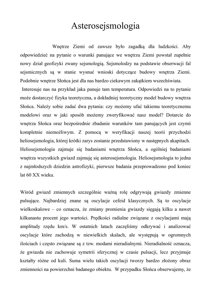 Asterosejsmologia Wnętrze Ziemi od zawsze było zagadką dla ludzkości. Aby odpowiedzieć na pytanie o warunki panujące we wnętrzu Ziemi powstał zupełnie nowy dział geofizyki zwany sejsmologią. Sejsmolodzy na podstawie obserwacji fal sejsmicznych są w stanie wysnuć wnioski dotyczące budowy wnętrza Ziemi. Podobnie wnętrze Słońca jest dla nas bardzo ciekawym zakątkiem wszechświata. Interesuje nas na przykład jaka panuje tam temperatura. Odpowiedzi na to pytanie może dostarczyć fizyka teoretyczna, a dokładniej teoretyczny model budowy wnętrza Słońca. Należy sobie zadać dwa pytania: czy możemy ufać takiemu teoretycznemu modelowi oraz w jaki sposób możemy zweryfikować nasz model? Dotarcie do wnętrza Słońca oraz bezpośrednie zbadanie warunków tam panujących jest czymś kompletnie niemożliwym. Z pomocą w weryfikacji naszej teorii przychodzi heliosejsmologia, której krótki zarys zostanie przedstawiony w następnych akapitach. Heliosejsmologia zajmuje się badaniami wnętrza Słońca, a ogólniej badaniami wnętrza wszystkich gwiazd zajmuję się asterosejsmologia. Heliosejsmologia to jedna z najmłodszych dziedzin astrofizyki, pierwsze badania przeprowadzono pod koniec lat 60 XX wieku. Wśród gwiazd zmiennych szczególnie ważną rolę odgrywają gwiazdy zmienne pulsujące. Najbardziej znane są oscylacje cefeid klasycznych. Są to oscylacje wielkoskalowe – co oznacza, że zmiany promienia gwiazdy sięgają kilku a nawet kilkunastu procent jego wartości. Prędkości radialne związane z oscylacjami mają amplitudy rzędu km/s. W ostatnich latach zaczęliśmy odkrywać i analizować oscylacje które zachodzą w niewielkich skalach, ale występują w ogromnych ilościach i często związane są z tzw. modami nieradialnymi. Nieradialność oznacza, że gwiazda nie zachowuje symetrii sferycznej w czasie pulsacji, lecz przyjmuje kształty różne od kuli. Suma wielu takich oscylacji tworzy bardzo złożony obraz zmienności na powierzchni badanego obiektu. W przypadku Słońca obserwujemy, że niewielkie fragmenty tarczy zbliżają się lub oddają się od nas z prędkościami rzędu kilku cm/s. Pulsacje gwiazd wygodnie jest opisywać jako dźwiękowe fale stojące, analogicznie do dźwiękowych fal stojących powstających w instrumentach muzycznych takich jak flet. Jak wiadomo za pomocą fletu nie uzyskamy dźwięku o dowolnych częstotliwościach, lecz tylko o ściśle określonych. Tak samo sprawa wygląda z gwiazdami, tylko ściśle określone drgania – tak zwane mody pulsacji są możliwe. Najprostszym modelem pulsacji są pulsacje radialne. Gwiazda kurczy się i rozszerza, zachowując symetrię sferyczną. W gwiazdach jesteśmy w stanie zaobserwować wiele różnych modów pulsacji. Astrofizycy do opisu modów używają trzech liczb: n , l , m. Pozwala to klasyfikować i rozróżniać mody pulsacji. • Liczba n to radialny rząd modu, mówi ile powierzchni węzłowych znajduje się we wnętrzu gwiazdy. Powierzchnie węzłowe nie biorą udziału w ruchu, oddzielają warstwy w których gaz porusza się w przeciwnych kierunkach • Liczba l mówi o liczbie linii węzłowych. Linie węzłowe dzielą powierzchnie gwiazdy na obszary w których warunki fizyczne zmieniają się w wyniku pulsacji, ale dzieje się to w przeciwnych fazach. Tak więc gdy w jednym z obszarów np. jasność wzrasta w obszarze sąsiadującym jasność musi maleć. • Liczba m informuje nas ile linii węzłowych przechodzi przez bieguny gwiazdy. Rys. 1 Ilustracja modów nieradialnych. Linie węzłowe zostały przedstawione za pomocą linii przerywanych. Obszary „czerwone” i „czarne” są w przeciwfazie – jeśli obszar „czerwony” wznosi się to „czarny” opada. Pulsacje gwiazd możemy obserwować zarówno spektroskopowo jak i fotometrycznie. Spektroskopowo obserwujemy przesuwanie się linii widmowych, co odpowiada zmianom prędkości radialnych na powierzchni gwiazdy. Fotometrczynie obserwujemy zmieniającą się jasność gwiazdy. Dźwiękowa fala stojąca odpowiadająca danemu modowi powstaje dzięki nakładania się fal. Fale rozchodzące się z jakiegoś punktu wewnątrz gwiazdy ulegają odbiciu od powierzchni granicznych (np. od powierzchni gwiazdy) i zawracają w kierunku wnętrza gwiazdy. Fale biegnące w przeciwnych kierunkach dodają się i mogą ulec wzmocnieniu lub wygaszeniu. Częstotliwość fali zależy od prędkości dźwięku wzdłuż jej trajektorii. Natomiast prędkość rozchodzenia się dali dźwiękowej w ośrodku gazowym, zależy przede wszystkim od temperatury i składu gazu. Musimy jednak pamiętać, że warunki panujące we wnętrzu gwiazdy silnie zależą od odległości od jej powierzchni. Zmienia się temperatura, gęstość, stan jonizacji oraz skład gazu. Zatem w różnych warstwach gwiazdy prędkość dźwięku jest różna. Ten fakt prowadzi do występowania ważnego efektu. Trajektoria fali dźwiękowej rozchodzącej się w gwieździe nie jest linią prostą, lecz ulega zaginaniu. Odpowiada to zjawisku załamania promieni świetlnych znanemu z optyki. Promień światła ulega załamaniu na granicy ośrodków, w których światło rozchodzi się z różną prędkością. „Zaginanie” fal we wnętrzu gwiazdy zostało przedstawione na rysunku 2 [1]. Rys. 2 Różne mody pulsacji docierają do różnych warstw gwiazdy Na rysunku 2 wyraźnie widać, że niektóre fale poruszają się głęboko pod powierzchnią gwiazdy, a niektóre płytko. Decyduje o tym wspomniana wcześniej liczba l. Gdy wartość liczby l jest duża fala podróżuje płytko pod powierzchnią gwiazdy. Tak więc o częstotliwości modu o wysokim l decyduje struktura tylko zewnętrznych warstw gwiazdy. Sytuacja wygląda odwrotnie gdy mamy do czynienia z modami o niskim l: fala podróżuje głęboko wewnątrz gwiazdy. Na częstotliwość takich modów ma wpływ również budowa głębszych warstw gwiazdy. [1] Rysunek 2 zwraca uwagę na jeszcze jeden bardzo istotny f