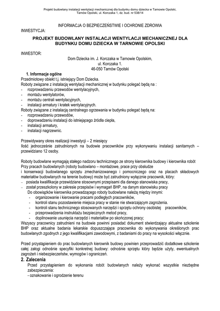 Projekt budowlany instalacji wentylacji mechanicznej dla budynku domu dziecka w Tarnowie Opolski, Tarnów Opolski, ul. Korczaka 1, dz. bud. nr 538/14 INFORMACJA O BEZPIECZEŃSTWIE I OCHRONIE ZDROWIA INWESTYCJA: PROJEKT BUDOWLANY INSTALACJI WENTYLACJI MECHANICZNEJ DLA BUDYNKU DOMU DZIECKA W TARNOWIE OPOLSKI INWESTOR: Dom Dziecka im. J. Korczaka w Tarnowie Opolskim, ul. Korczaka 1. 46-050 Tarnów Opolski 1. Informacje ogólne Przedmiotowy obiekt t.j. istniejący Dom Dziecka. Roboty związane z instalacją wentylacji mechanicznej w budynku polegać będą na : - rozprowadzeniu przewodów wentylacyjnych, - montażu wentylatorów, - montażu centrali wentylacyjnych, - instalacji armatury i kratek wentylacyjnych. Roboty związane z instalacją centralnego ogrzewania w budynku polegać będą na: - rozprowadzeniu przewodów, - doprowadzeniu instalacji do istniejącego źródła ciepła, - instalacji armatury, - instalacji nagrzewnic. Przewidywany okres realizacji inwestycji – 2 miesięcy Ilość jednocześnie zatrudnionych na budowie pracowników przy wykonywaniu instalacji sanitarnych – przewidziano 12 osoby. Roboty budowlane wymagają stałego nadzoru technicznego ze strony kierownika budowy i kierownika robót Przy pracach budowlanych (roboty budowlano – montażowe, prace przy obsłudze i konserwacji budowlanego sprzętu zmechanizowanego i pomocniczego oraz na placach składowych materiałów budowlanych na terenie budowy) może być zatrudniony wyłącznie pracownik, który: − posiada kwalifikacje przewidziane stosownymi przepisami dla danego stanowiska pracy, − został przeszkolony w zakresie przepisów i wymagań BHP, na danym stanowisku pracy Do obowiązków kierownika prowadzącego roboty budowlane należą między innymi: - organizowanie i kierowanie pracami podległych pracowników, - kontroli stanu pozostawienie miejsca pracy w stanie nie stwarzającym zagrożenia. - kontroli stanu technicznego stosowanych narzędzi i sprzętu ochrony osobistej pracowników, - przeprowadzenia instruktażu bezpiecznych metod pracy, - dopilnowanie usunięcia narzędzi i materiałów po skończonej pracy; Wszyscy pracownicy zatrudnieni na budowie powinni posiadać dokument stwierdzający aktualne szkolenie BHP oraz aktualne badania lekarskie dopuszczające pracownika do wykonywania określonych prac budowlanych zgodnych z jego kwalifikacjami zawodowymi, z badaniami do pracy na wysokości włącznie. Przed przystąpieniem do prac budowlanych kierownik budowy powinien przeprowadzić dodatkowe szkolenie całej załogi odnośnie specyfiki konkretnej budowy: odnośnie sprzętu który będzie użyty, ewentualnych zagrożeń i niebezpieczeństw, wymogów i ograniczeń. 2. Zalecenia Przed przystąpieniem do wykonania robót budowlanych należy wykonać wszystkie niezbędne zabezpieczenia: - oznakowanie i ogrodzenie terenu Projekt budowlany instalacji wentylacji mechanicznej dla budynku domu dziecka w Tarnowie Opolski, Tarnów Opolski, ul. Korczaka 1, dz. bud. nr 538/14 - zgromadzenie potrzebnych narzędzi i sprzętu - zainstalowanie niezbędnych urządzeń. Nie można wykonywać prac bez odpowiedniego zabezpieczenia osoby wykonującej te prace. Miejsca i powierzchnię wykonywania przedmiotowych robót należy zabezpieczyć pod względem wysokości oraz bezpośredniego sąsiedztwa kabli energetycznych i elektroenergetycznych. Roboty budowlane należy prowadzić zgodnie z Rozporządzeniem Ministra Infrastruktury z dnia 06 luty 2003 r. w sprawie bezpieczeństwa i higieny pracy przy wykonywaniu robót budowlanych (Dz.U. Nr 47 poz. 401). Przed dopuszczeniem pracownika do pracy, zakład zobowiązany jest zaopatrzyć go w odzież ochronną i roboczą, zgodnie z obowiązującymi w tym zakresie przepisami oraz okulary ochronne, rękawice, obuwie ochronne, pasy bezpieczeństwa przy pracy na wysokości i inne. Sprzęt ochronny oraz narzędzia powinny posiadać aktualne atesty oraz instrukcje określające sposób ich użytkowania. Wszystkie przejścia i przejazdy powinny być drożne, pozbawione jakichkolwiek przeszkód (deski, gruz itp.). Wszystkie prace należy prowadzić pod nadzorem osoby posiadającej uprawnienia budowlane do kierowania pracami budowlanymi, po uprzednim wydaniu pracownikom środków zabezpieczających i przeprowadzeniu instruktażu obejmującego podział prac, kolejność wykonywanych zadać, wymogów bezpieczeństwa i higieny pracy. Przy obsłudze urządzeń transportu zmechanizowanego mogą być zatrudnione tylko osoby o kwalifikacjach właściwych do obsługi określonego urządzenia. Plac budowy powinien być zaopatrzony w podstawowe urządzenia gaśnicze w postaci gaśnic proszkowych, koców p.poż, piasku, szpadli. Drogi ewakuacyjne prowadzące bezpośrednio na teren otwartej przestrzeni powinny być drożne nie zablokowane żadnymi urządzeniami czy materiałami budowlanymi. Pracownicy narażeni na urazy mechaniczne, porażenia prądem, upadki z wysokości, oparzenia, zatrucia, wibrację oraz inne szkodliwe czynniki i zagrożenia związane z wykonywaną pracą, powinni być zaopatrzeni w sprzęt ochrony osobistej. Sprzęt ten winien posiadać stosowne atesty i certyfikaty. Na budowie powinien być urządzony punkt pierwszej pomocy obsługiwany przez wyszkolonych w tym zakresie pracowników. Na budowie powinna być umieszczona tablica informacyjna z wykazem ważnych telefonów takich jak: Pogotowie Ratunkowe, Straż Pożarna, Policja. 3. Warunki techniczne wykonania robót budowlanych Wszystkie roboty budowlano – montażowe należy wykonać: − zgodnie z projektem budowlanym, zatwierdzonym w odpowiednich urzędach i instytucjach, − zgodnie z przepisami Prawa Budowlanego, − zgodnie z przepisami BHP, − pod nadzorem i kierunkiem osób z odpowiednimi uprawnieniami budowlanymi. Opracował: mgr inż. Łukasz Mirczak
