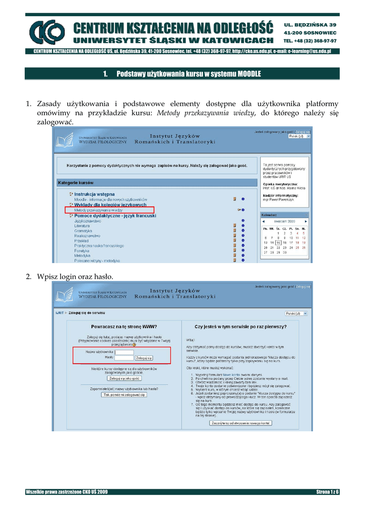 CENTRUM KSZTAŁCENIA NA ODLEGŁOŚĆ UNIWERSYTET ŚLĄSKI W KATOWICACH UL . BĘDZIŃS KA 3 9 4 1 - 2 0 0 SO S N O W I E C TEL. +48 (32) 368-97-97 CENTRUM KSZTAŁCENIA NA ODLEGŁOŚĆ UŚ, ul. Będzińska 39, 41-200 Sosnowiec, tel. +48 (32) 368-97-97, http://cko.us.edu.pl, e-mail: [email protected] 1. Podstawy użytkowania kursu w systemu MOODLE 1. Zasady użytkowania i podstawowe elementy dostępne dla użytkownika platformy omówimy na przykładzie kursu: Metody przekazywania wiedzy, do którego należy się zalogować. 2. Wpisz login oraz hasło. Wszelkie prawa zastrzeżone CKO UŚ 2009 Strona 1 z 6 CENTRUM KSZTAŁCENIA NA ODLEGŁOŚĆ UNIWERSYTET ŚLĄSKI W KATOWICACH UL . BĘDZIŃS KA 3 9 4 1 - 2 0 0 SO S N O W I E C TEL. +48 (32) 368-97-97 CENTRUM KSZTAŁCENIA NA ODLEGŁOŚĆ UŚ, ul. Będzińska 39, 41-200 Sosnowiec, tel. +48 (32) 368-97-97, http://cko.us.edu.pl, e-mail: [email protected] 3. Główna część kursu, zwana blokiem głównym jest widoczna w środkowej części strony i zawiera wszystkie elementy podzielone na tematy. 4. W każdym temacie znajdują się składowe. W naszym kursie są dwie składowe: prezentacja multimedialna i quiz zawierający pytania dotyczące danej prezentacji. 5. Klikając na nazwę prezentacji multimedialnej przechodzimy do okienka umożliwiającego odtworzenie filmu, następnie naciskamy przycisk play, aby obejrzeć prezentację. Wszelkie prawa zastrzeżone CKO UŚ 2009 Strona 2 z 6 CENTRUM KSZTAŁCENIA NA ODLEGŁOŚĆ UNIWERSYTET ŚLĄSKI W KATOWICACH UL . BĘDZIŃS KA 3 9 4 1 - 2 0 0 SO S N O W I E C TEL. +48 (32) 368-97-97 CENTRUM KSZTAŁCENIA NA ODLEGŁOŚĆ UŚ, ul. Będzińska 39, 41-200 Sosnowiec, tel. +48 (32) 368-97-97, http://cko.us.edu.pl, e-mail: [email protected] 6. W dolnej części okna prezentacji multimedialnej znajdują się elementy sterowania: a) lewy dolny róg pozwala na uruchamianie i zatrzymywanie filmu; b) w środkowej części znajduje się informacja na temat aktualnie pobranej ilości danych tzn. bufor (jeśli wskaźnik odtwarzania będzie pokrywał się z buforem, wtedy film zostanie na czas dopełnienia chwilowo zatrzymany); c) następnie pokazana jest długość trwania całego filmu; d) oraz ikona przełączająca na tryb pełnoekranowy; e) z prawej strony mamy jeszcze możliwość regulacji głośności. 7. Aby wrócić do głównego menu należy: a) w dolnej części okienka kliknąć na skróconą nazwę kursu – w naszym przypadku skrót MPW (Metody przekazywania wiedzy); b) w górnej lewej części okienka również widoczny jest skrót MPW. Wszelkie prawa zastrzeżone CKO UŚ 2009 Strona 3 z 6 CENTRUM KSZTAŁCENIA NA ODLEGŁOŚĆ UNIWERSYTET ŚLĄSKI W KATOWICACH UL . BĘDZIŃS KA 3 9 4 1 - 2 0 0 SO S N O W I E C TEL. +48 (32) 368-97-97 CENTRUM KSZTAŁCENIA NA ODLEGŁOŚĆ UŚ, ul. Będzińska 39, 41-200 Sosnowiec, tel. +48 (32) 368-97-97, http://cko.us.edu.pl, e-mail: [email protected] 8. Aby rozwiązać quiz klikamy na nazwę quizu, np. Quiz - podstawy fotografii, a następnie Spróbuj teraz rozwiązać quiz. 9. W wybranym quizie widzimy pytania i po 3 odpowiedzi do nich. Zaznaczamy rozwiązania przez kliknięcie na daną odpowiedź. 10. Po zaznaczeniu odpowiedzi na dole ekranu klikamy na Zatwierdź wszystkie i zakończ. Wszelkie prawa zastrzeżone CKO UŚ 2009 Strona 4 z 6 CENTRUM KSZTAŁCENIA NA ODLEGŁOŚĆ UNIWERSYTET ŚLĄSKI W KATOWICACH UL . BĘDZIŃS KA 3 9 4 1 - 2 0 0 SO S N O W I E C TEL. +48 (32) 368-97-97 CENTRUM KSZTAŁCENIA NA ODLEGŁOŚĆ UŚ, ul. Będzińska 39, 41-200 Sosnowiec, tel. +48 (32) 368-97-97, http://cko.us.edu.pl, e-mail: [email protected] 11. Aby zakończyć podejście należy kliknąć OK w pojawiającym się okienku. 12. Zostanie wyświetlone okno z uzyskanym wynikiem i informacją na temat zdobytej i maksymalnej ilości punktów w quizie. Jeżeli autor zestawu pytań umożliwił wielokrotne odpowiadanie na pytania – dostępny jest przycisk Ponownie rozwiąż quiz. W przypadku wielu podejść istotna jest metoda oceniania, czyli jaka ocena zostanie uznana za końcową, w naszym przypadku najwyższa uzyskana ocena z wszystkich podejść, czyli każde kolejne podejście będzie umożliwiało poprawienie noty końcowej. 13. Klikamy na MPW na dole strony, aby powrócić do głównego okienka naszego kursu. 14. Pozostałe bloki widoczne w naszym kursie to z lewej strony: a) Osoby – a w nim Uczestnicy, umożliwiające na przejrzenie listy uczestników biorących udział w kursie, ewentualnie wysłanie do nich wiadomości; b) Aktywności – (Fora dyskusyjne, Quizy i Zasoby) pozwalające na dostęp do tematycznie pogrupowanych elementów kursu. Wszelkie prawa zastrzeżone CKO UŚ 2009 Strona 5 z 6 CENTRUM KSZTAŁCENIA NA ODLEGŁOŚĆ UNIWERSYTET ŚLĄSKI W KATOWICACH UL . BĘDZIŃS KA 3 9 4 1 - 2 0 0 SO S N O W I E C TEL. +48 (32) 368-97-97 CENTRUM KSZTAŁCENIA NA ODLEGŁOŚĆ UŚ, ul. Będzińska 39, 41-200 Sosnowiec, tel. +48 (32) 368-97-97, http://cko.us.edu.pl, e-mail: [email protected] Gdy klikniemy np. na Quizy zobaczymy listę wszystkich dostępnych quizów w poszczególnych tematach oraz będziemy widzieli naszą ocenę, jeżeli braliśmy już udział w jakimś quizie. c) Administracja – a w nim: Oceny, Profil. Możemy obejrzeć tutaj swoje oceny oraz zmienić informacje, które podawaliśmy przy zakładaniu konta. 15. Bloki widoczne to z prawej strony: a) Kalendarz – pokazuje odpowiednio oznaczone wydarzenia w naszym kursie, np. nadchodzące terminy ukończenia wykonania zadań (dla grupy, bądź konkretnego użytkownika). b) Nadchodzące terminy – przypominają o tym, co w kalendarzu jest zaznaczone kolorami. Wszelkie prawa zastrzeżone CKO UŚ 2009 Strona 6 z 6