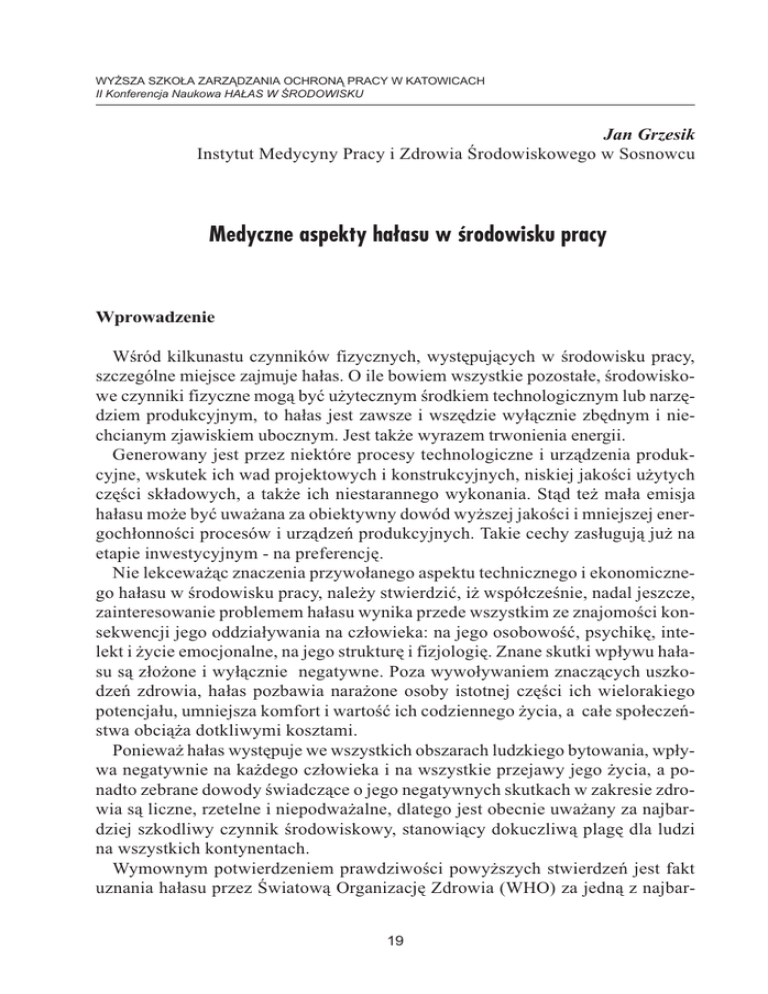 WYŻSZA SZKOŁA ZARZĄDZANIA OCHRONĄ PRACY W KATOWICACH II Konferencja Naukowa HAŁAS W ŚRODOWISKU Jan Grzesik Instytut Medycyny Pracy i Zdrowia Środowiskowego w Sosnowcu Medyczne aspekty ha³asu w œrodowisku pracy Wprowadzenie Wśród kilkunastu czynników fizycznych, występujących w środowisku pracy, szczególne miejsce zajmuje hałas. O ile bowiem wszystkie pozostałe, środowiskowe czynniki fizyczne mogą być użytecznym środkiem technologicznym lub narzędziem produkcyjnym, to hałas jest zawsze i wszędzie wyłącznie zbędnym i niechcianym zjawiskiem ubocznym. Jest także wyrazem trwonienia energii. Generowany jest przez niektóre procesy technologiczne i urządzenia produkcyjne, wskutek ich wad projektowych i konstrukcyjnych, niskiej jakości użytych części składowych, a także ich niestarannego wykonania. Stąd też mała emisja hałasu może być uważana za obiektywny dowód wyższej jakości i mniejszej energochłonności procesów i urządzeń produkcyjnych. Takie cechy zasługują już na etapie inwestycyjnym - na preferencję. Nie lekceważąc znaczenia przywołanego aspektu technicznego i ekonomicznego hałasu w środowisku pracy, należy stwierdzić, iż współcześnie, nadal jeszcze, zainteresowanie problemem hałasu wynika przede wszystkim ze znajomości konsekwencji jego oddziaływania na człowieka: na jego osobowość, psychikę, intelekt i życie emocjonalne, na jego strukturę i fizjologię. Znane skutki wpływu hałasu są złożone i wyłącznie negatywne. Poza wywoływaniem znaczących uszkodzeń zdrowia, hałas pozbawia narażone osoby istotnej części ich wielorakiego potencjału, umniejsza komfort i wartość ich codziennego życia, a całe społeczeństwa obciąża dotkliwymi kosztami. Ponieważ hałas występuje we wszystkich obszarach ludzkiego bytowania, wpływa negatywnie na każdego człowieka i na wszystkie przejawy jego życia, a ponadto zebrane dowody świadczące o jego negatywnych skutkach w zakresie zdrowia są liczne, rzetelne i niepodważalne, dlatego jest obecnie uważany za najbardziej szkodliwy czynnik środowiskowy, stanowiący dokuczliwą plagę dla ludzi na wszystkich kontynentach. Wymownym potwierdzeniem prawdziwości powyższych stwierdzeń jest fakt uznania hałasu przez Światową Organizację Zdrowia (WHO) za jedną z najbar19 Jan Grzesik dziej istotnych szkodliwości środowiska życia i pracy człowieka, oraz zaliczenia go do priorytetowych problemów zdrowia publicznego i środowiskowego [11,12]. W konsekwencji przyjęcia tego poglądu, WHO inicjuje i koordynuje w skali globalnej międzynarodowe działania, podejmowane w celu istotnego ograniczenia obszarów występowania hałasu, znacznego zmniejszenia jego intensywności, a dzięki temu zminimalizowania ryzyka doznania przez populację generalną uszczerbków zdrowia. Również instytucje zarządzające Unią Europejską dostrzegły w tym czynniku i w kompleksowych skutkach jego działania jeden z głównych problemów zdrowia środowiskowego i publicznego. Zgodnie z tą oceną, wydały one kilka dyrektyw i wiele innych dokumentów, które uzasadniają potrzebę i precyzują zakres działań chroniących zdrowie jednostek i całych społeczeństw przed szkodliwym działaniem hałasu [2, 7]. Znaczenie hałasu dla zdrowia pracowników Problem zdrowotnych skutków hałasu jest problemem globalnym, ogólnoludzkim, dotyczącym populacji generalnej. Największą, z kilku frakcji tej populacji, stanowią osoby pracujące. Scenariusz narażenia osób, których środowisko zawodowe charakteryzuje się intensywniejszym hałasem, różni się istotnie od warunków narażenia niepracujących członków ogółu ludności. Ci ostatni podlegają najczęściej tylko wpływowi hałasu komunalnego. Jego znamienną cechą jest przypadkowość, mała przewidywalność oraz duża zmienność poziomu natężenia i pozostałych parametrów akustycznych. Pracujący - poza tym, że przez większość czasu dnia są także eksponowani na hałas komunalny - są przede wszystkim przez około 40 godzin w tygodniu, w okresie wielu lat, narażeni na hałas zdeterminowany przez specyfikę uprawianego zawodu, materialne cechy i oprzyrządowanie miejsca pracy oraz przez organizację obowiązującą na danym stanowisku pracy. Charakterystyczną cechą zawodowego narażenia na hałas jest jego związek z miejscem i czasem pracy, sprzężenie z określoną czynnością, technologią lub fazą produkcyjną, jego powtarzalność, długotrwałość, do pewnego stopnia - przymusowość, oraz względna stabilność warunków narażenia. Te właściwości są w znacznej mierze odpowiedzialne za jakość i rozmiar skutków zdrowotnych postrzeganych u osób zawodowo narażonych na hałas, a także za odmienność zmian zdrowotnych, w porównaniu ze skutkami wywoływanymi u ogółu ludności przez hałas komunalny. Dla populacji generalnej, istotne znaczenie mają przede wszystkim takie skutki, jak subiektywnie odczuwana dokuczliwość hałasu - wywołująca szereg wtór20 Medyczne aspekty hałasu w środowisku pracy nych reakcji całego organizmu, zaburzenia snu, zmiany w zakresie zdrowia psychicznego, zaburzenia sprawności, zakłócenia odbioru i rozumienia mowy, niekorzystne zmiany zachowań społecznych, a także do pewnego stopnia zmiany w zakresie zdrowia fizycznego - polegające na patologicznych reakcjach układu krążenia, układu pokarmowego, układu gruczołów o wydzielaniu dokrewnym, chemicznego składu krwi - rozwijające się ostatecznie do etapu określonych chorób cywilizacyjnych [6, 9]. Za szczególnie niepokojący skutek hałasu komunalnego uważa się rozwój u osób narażonych stanu hiperstresu, z jego groźnymi następstwami ogólnoustrojowymi. Stresogenność hałasu komunalnego ma swoją przyczynę między innymi w nikłej możliwości indywidualnego wpływania na jego emisję, małym oswojeniu z jego źródłami, a przede wszystkim w jego znamiennej charakterystyce fizykalnej i na