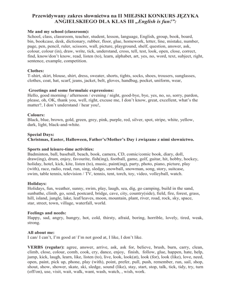 Przewidywany zakres słownictwa na II MIEJSKI KONKURS JĘZYKA ANGIELSKIEGO DLA KLAS III „English is fun!”: Me and my school (classroom): School, class, classroom, teacher, student, lesson, language, English, group, book, board, bin, bookcase, desk, dictionary, rubber, floor, glue, homework, letter, line, mistake, number, page, pen, pencil, ruler, scissors, wall, picture, playground, shelf, question, answer, ask, colour, colour (in), draw, write, tick, understand, cross, tell, test, look, open, close, correct, find, know/don’t know, read, listen (to), learn, alphabet, art, yes, no, word, text, subject, right, sentence, example, competition. Clothes: T-shirt, skirt, blouse, shirt, dress, sweater, shorts, tights, socks, shoes, trousers, sunglasses, clothes, coat, hat, scarf, jeans, jacket, belt, gloves, handbag, pocket, uniform, wear, Greetings and some formulaic expressions: Hello, good morning / afternoon / evening / night, good-bye, bye, yes, no, so, sorry, pardon, please, oh, OK, thank you, well, right, excuse me, I don’t know, great, excellent, what’s the matter?, I don’t understand / hear you!, Colours: Black, blue, brown, gold, green, grey, pink, purple, red, silver, spot, stripe, white, yellow, dark, light, black-and-white. Special Days: Christmas, Easter, Halloween, Father’s/Mother’s Day i związane z nimi slownictwo. Sports and leisure-time activities: Badminton, ball, baseball, beach, book, camera, CD, comic/comic book, diary, doll, draw(ing), drum, enjoy, favourite, fish(ing), football, game, golf, guitar, hit, hobby, hockey, holiday, hotel, kick, kite, listen (to), music, paint(ing), party, photo, piano, picture, play (with), race, radio, read, run, sing, sledge, snowball, snowman, song, story, suitcase, swim, table tennis, television / TV, tennis, tent, torch, toy, video, volleyball, watch. Holidays: Holidays, fun, weather, sunny, swim, play, laugh, sea, dig, go camping, build in the sand, sunbathe, climb, go, send, postcard, bridge, cave, city, country(side), field, fire, forest, grass, hill, island, jungle, lake, leaf/leaves, moon, mountain, plant, river, road, rock, sky, space, star, street, town, village, waterfall, world. Feelings and needs: Happy, sad, angry, hungry, hot, cold, thirsty, afraid, boring, horrible, lovely, tired, weak, strong. All about me: I can/ I can’t, I’m good at/ I’m not good at, I like, I don’t like. VERBS (regular): agree, answer, arrive, ask, ask for, believe, brush, burn, carry, clean, climb, close, colour, comb, cook, cry, dance, enjoy, finish, follow, glue, happen, hate, help, jump, kick, laugh, learn, like, listen (to), live, look, look(at), look (for), look (like), love, need, open, paint, pick up, phone, play (with), point, prefer, pull, push, remember, run, sail, shop, shout, show, shower, skate, ski, sledge, sound (like), stay, start, stop, talk, tick, tidy, try, turn (off/on), use, visit, wait, walk, want, wash, watch, , wish, work. VERBS (irregular)- oczywiście tylko forma podstawowa!: be, buy, can/cannot/can’t, catch, choose, come, do/don’t, draw, drink, eat, find, fly, get (un)dressed, get up, give, go, have (got), hurt, know, learn, put, mean, must, put on, read, ride, run, say, sing, sit (down), sleep, spell, stand (up), swim, take, take off, take pictures, throw, understand, wake up, wear, write. The alphabet: Literowanie (spelling) Numbers Ordinals: 1-100, Quantity and measuring: a few, a little, a piece of, half, many, much. The days of the week: Monday, Tuesday, Wednesday, Thursday, Friday, Saturday, Sunday. The year: January, February, March, April, May, June, July, August, September, October, November, December, spring, summer, autumn, winter. Transport: bike, boat, bus, car, fly, go, helicopter, motorbike, plane, ride, run, taxi, train, walk. The senses: feel, look, smell, taste, hear Location and position: at, behind, between, here, there, in, in front of, next to, on, under, above Adjectives: afraid, bad, beautiful, best, better, big, boring, busy, clean, clever, cold, dangerous, dark, dear, different, difficult, dirty, dry, easy, empty, famous, fast, fat, favourite, friendly, good, happy, hard, heavy, high, hot, hungry, important, interesting, kind, late, left, light, little, loud, lovely, low, new, next, nice, old, other, quick, quiet, ready, right, round, sad, single, slow, small, square, strange, strong, sure, tall, thin, thirsty, tidy, tired, ugly, warm, well, wet, young. Determiners: a/an, all, another, any, every, no, that, the, these, this, those. Prepositions: about, above, after, at , before, behind, below, between, in, in front of, inside, next to, of, on, opposite, outside, to, under. Pronouns: all, everyone, everything, nothing, someone, something. Conjunctions: because, but, than. Grammar: Czas teraźniejszy prosty, czas teraźniejszy ciągły, konstrukcja there is/there are, Saxon genitive 2 Zastrzegamy sobie prawo do używania także innego słownictwa zawartego w podstawie programowej i programach nauczania j. angielskiego dla kl.I-III, a nie wymienionego w powyższym zestawieniu. Jednocześnie informujemy, że nie wszystkie wymienione słówka muszą zostać wykorzystane w zadaniach konkursowych. Zdajemy sobie sprawę, że ilość słówek wydaje się być duża, jednak większość z nich dzieci znają lub przynajmniej słyszały i wymagają tylko utrwalenia. Niektóre z nich, jak zauważycie Państwo, powtarzają się w różnych tematykach. W rezultacie „nie taki diabeł straszny” i mam nadzieję, nie odstraszy od wzięcia udziału w naszej zabawie, a tylko ułatwi przygotowanie do niej. Bieżące informacje o konkursie zamieszczane będą także na stronie internetowej naszej szkoły [email protected] Zapraszamy. Organizatorzy: Ewa Kaszowska Małgorzata Szynk Lech Sokołowski 3