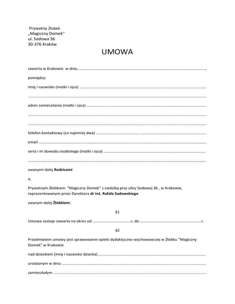 Prywatny Żłobek „Magiczny Domek” ul. Sodowa 36 30-376 Kraków UMOWA zawarta w Krakowie w dniu....................................................................................................................., pomiędzy: imię i nazwisko (matki i ojca) .................................................................................................................... ................................................................................................................................................................... adres zamieszkania (matki i ojca) ............................................................................................................. ................................................................................................................................................................... ................................................................................................................................................................... telefon kontaktowy (co najmniej dwa) ......................................, ............................................................. email ………………………………………………………………………………...........………………………………………………………… seria i nr dowodu osobistego (matki i ojca) ............................................................................................. ................................................................................................................................................................... zwanymi dalej Rodzicami a, Prywatnym Żłobkiem "Magiczny Domek" z siedzibą przy ulicy Sodowej 36 , w Krakowie, reprezentowanym przez Dyrektora dr inż. Rafała Sadowskiego zwanym dalej Żłobkiem. §1 Umowa zostaje zawarta na okres od ...................................r, do ........................................................r. §2 Przedmiotem umowy jest sprawowanie opieki dydaktyczno-wychowawczej w Żłobku "Magiczny Domek" w Krakowie nad dzieckiem (imię i nazwisko dziecka) .................................................................................................. urodzonym w dniu .................................................................................................................................... zamieszkałym ............................................................................................................................................ ................................................................................................................................................................... zameldowanym ........................................................................................................................................ ................................................................................................................................................................... PESEL dziecka ……………………………………………………………...........………………................................................. §3 Zasady organizacji żłobka oraz proces rekrutacji dzieci określa Regulamin Żłobka (do wglądu u dyrektora oraz na stronie www.magiczny-domek.pl/regulamin) §4 1. Opłata wpisowa wynosi …………… złotych. Opłata jest bezzwrotna i przeznaczona na zapewnienie dziecku: pomocy dydaktycznych, środków higienicznych, ubezpieczenia dziecka od nieszczęśliwych wypadków oraz uroczystości okolicznościowych np. Dzień Dziecka, Wizyta Mikołaja itp. Opłata wpisowa uiszczana jest przez Rodziców raz w roku i obejmuje cały roczny pobyt dziecka w żłobku „Magiczny Domek”. 2. Opłata abonamentowa wynosi ………………. złotych miesięcznie (płatne przez okres trwania umowy) i nie podlega zwrotowi w przypadku choroby lub urlopowania dziecka. W przypadku nieobecności dziecka dłużej niż 4 tygodnie Rodzicom/Opiekunom przysługuje 30% bonifikata do czesnego z wybranego pakietu w kolejnym miesiącu. Nieobecność dziecka musi być udokumentowana zaświadczeniem lekarskim. 3. Opłata abonamentowa jest ustalana na podstawie odrębnego cennika, a jej wysokość może być zmieniona w ciągu roku aneksem do umowy. 4. W ramach opłaty abonamentowej dziecko może przebywać na terenie żłobka ……………. godzin zegarowych miesięcznie (miesiąc kalendarzowy). Rodzice sami wybierają w jakich dniach i godzinach dziecko będzie uczęszczało do żłobka. 5. Za przekroczenie limitu godzin wyznaczonych na dany miesiąc, obowiązuje dopłata za każdą rozpoczętą godzinę w wysokości 15,00 złotych (słownie piętnaście złotych). 6. W ramach abonamentu dzieci uczestniczą w zajęciach edukacyjnych i artystycznych (lista zajęć do wglądu u dyrektora żłobka lub na stronie www.magiczny-domek.pl) Lista zajęć dodatkowych wchodząca w skład czesnego, jak również lista zajęć dodatkowych (dodatkowo płatnych) może ulec zmianie. 7. Opiekun w porozumieniu z dyrekcją żłobka może zadecydować, czy dziecko będzie uczestniczyć w zajęciach dodatkowych. Uzależnione jest, to od indywidualnego rozwoju dziecka i od realnej możliwości uczestniczenia dziecka w zajęciach. 8. W skład opłaty abonamentowej nie wchodzi opłata za całodzienne wyżywienie dziecka przebywającego na terenie placówki. 9. Żłobek jest otwarty codziennie od godziny 7.00 do godziny 17.00. Żłobek jest zamknięty w dni ustawowo wolne od pracy oraz dni wyznaczone przez Właścicieli Żłobka (lista podawana do wiadomości Rodziców każdorazowo na początku roku szkolnego). W przypadku odebrania dziecka po godzinie 17.00 (nie później niż do 18.00) w przypadkach losowych będzie naliczana każdorazowo opłata w wysokości 50,00 złotych (słownie pięćdziesiąt złotych). 10. Wszystkie opłaty należy uiszczać do 5 dnia każdego miesiąca, *- tylko i wyłącznie przelewem bankowym na rachunek