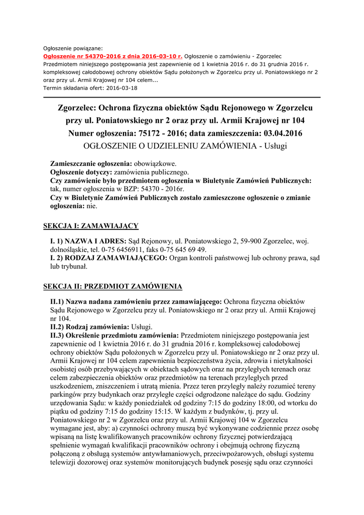 Ogłoszenie powiązane: Ogłoszenie nr 54370-2016 z dnia 2016-03-10 r. Ogłoszenie o zamówieniu - Zgorzelec Przedmiotem niniejszego postępowania jest zapewnienie od 1 kwietnia 2016 r. do 31 grudnia 2016 r. kompleksowej całodobowej ochrony obiektów Sądu położonych w Zgorzelcu przy ul. Poniatowskiego nr 2 oraz przy ul. Armii Krajowej nr 104 celem... Termin składania ofert: 2016-03-18 Zgorzelec: Ochrona fizyczna obiektów Sądu Rejonowego w Zgorzelcu przy ul. Poniatowskiego nr 2 oraz przy ul. Armii Krajowej nr 104 Numer ogłoszenia: 75172 - 2016; data zamieszczenia: 03.04.2016 OGŁOSZENIE O UDZIELENIU ZAMÓWIENIA - Usługi Zamieszczanie ogłoszenia: obowiązkowe. Ogłoszenie dotyczy: zamówienia publicznego. Czy zamówienie było przedmiotem ogłoszenia w Biuletynie Zamówień Publicznych: tak, numer ogłoszenia w BZP: 54370 - 2016r. Czy w Biuletynie Zamówień Publicznych zostało zamieszczone ogłoszenie o zmianie ogłoszenia: nie. SEKCJA I: ZAMAWIAJĄCY I. 1) NAZWA I ADRES: Sąd Rejonowy, ul. Poniatowskiego 2, 59-900 Zgorzelec, woj. dolnośląskie, tel. 0-75 6456911, faks 0-75 645 69 49. I. 2) RODZAJ ZAMAWIAJĄCEGO: Organ kontroli państwowej lub ochrony prawa, sąd lub trybunał. SEKCJA II: PRZEDMIOT ZAMÓWIENIA II.1) Nazwa nadana zamówieniu przez zamawiającego: Ochrona fizyczna obiektów Sądu Rejonowego w Zgorzelcu przy ul. Poniatowskiego nr 2 oraz przy ul. Armii Krajowej nr 104. II.2) Rodzaj zamówienia: Usługi. II.3) Określenie przedmiotu zamówienia: Przedmiotem niniejszego postępowania jest zapewnienie od 1 kwietnia 2016 r. do 31 grudnia 2016 r. kompleksowej całodobowej ochrony obiektów Sądu położonych w Zgorzelcu przy ul. Poniatowskiego nr 2 oraz przy ul. Armii Krajowej nr 104 celem zapewnienia bezpieczeństwa życia, zdrowia i nietykalności osobistej osób przebywających w obiektach sądowych oraz na przyległych terenach oraz celem zabezpieczenia obiektów oraz przedmiotów na terenach przyległych przed uszkodzeniem, zniszczeniem i utratą mienia. Przez teren przyległy należy rozumieć tereny parkingów przy budynkach oraz przyległe części odgrodzone należące do sądu. Godziny urzędowania Sądu: w każdy poniedziałek od godziny 7:15 do godziny 18:00, od wtorku do piątku od godziny 7:15 do godziny 15:15. W każdym z budynków, tj. przy ul. Poniatowskiego nr 2 w Zgorzelcu oraz przy ul. Armii Krajowej 104 w Zgorzelcu wymagane jest, aby: a) czynności ochrony muszą być wykonywane codziennie przez osobę wpisaną na listę kwalifikowanych pracowników ochrony fizycznej potwierdzającą spełnienie wymagań kwalifikacji pracowników ochrony i obejmują ochronę fizyczną połączoną z obsługą systemów antywłamaniowych, przeciwpożarowych, obsługi systemu telewizji dozorowej oraz systemów monitorujących budynek posesję sądu oraz czynności zgodnie z instrukcją zamawiającego stanowiącą załącznik nr 10 do SIWZ, b) czynności ochrony muszą być wykonywane codziennie przez całą dobę. Usługa ochrony musi być wykonywana wyłącznie przez pracowników ochrony osób i mienia wpisanych na listę kwalifikowanych pracowników ochrony fizycznej. Wykonawca zapewni pracownikom ochrony jednolite umundurowanie służbowe, identyfikatory imienne i inne wymagane środki, np. środki łączności zewnętrznej. Miejscem realizacji zamówienia są: a) budynek sądu położony w Zgorzelcu przy ul. Poniatowskiego nr 2 oraz b) budynek sądu położony w Zgorzelcu przy ul. Armii Krajowej nr 104. W ramach świadczonej usługi Wykonawca będzie zobowiązany zapewnić (w godzinach wykonywania usług ochrony) przyjazd do ochranianego obiektu w ciągu 30 minut od momentu wezwania przez pracowników ochrony lub upoważnionych pracowników Zamawiającego, patrolu interwencyjnego składającego się z 2 pracowników ochrony wpisanych na listę kwalifikowanych pracowników ochrony fizycznej, wyposażonych w środki przymusu bezpośredniego, zgodnie z ustawą z dnia 24 maja 2013 r. o środkach przymusu bezpośredniego i broni palnej (Dz. U. z 2013 r. poz. 628). Wymagany termin realizacji - ochrona fizyczna połączona z obsługą monitoringu obiektów w Zgorzelcu: położonego przy ul. Poniatowskiego nr 2 oraz przy ul. Armii Krajowej 104, od dnia 01 kwietnia 2016 roku od godziny 07:00 do dnia 31 grudnia 2016 roku do godziny 07:00. II.4) Wspólny Słownik Zamówień (CPV): 79.71.00.00-4. SEKCJA III: PROCEDURA III.1) TRYB UDZIELENIA ZAMÓWIENIA: Przetarg nieograniczony III.2) INFORMACJE ADMINISTRACYJNE Zamówienie dotyczy projektu/programu finansowanego ze środków Unii Europejskiej: nie SEKCJA IV: UDZIELENIE ZAMÓWIENIA IV.1) DATA UDZIELENIA ZAMÓWIENIA: 01.04.2016. IV.2) LICZBA OTRZYMANYCH OFERT: 2. IV.3) LICZBA ODRZUCONYCH OFERT: 0. IV.4) NAZWA I ADRES WYKONAWCY, KTÓREMU UDZIELONO ZAMÓWIENIA: ORION NEXT Spółka z o.o., Rogowska 127, 54-440 Wrocław, kraj/woj. dolnośląskie. ORION Spółka z o.o., Rogowska 157, 54-440 Wrocław, kraj/woj. dolnośląskie. IV.5) Szacunkowa wartość zamówienia (bez VAT): 151317,00 PLN. IV.6) INFORMACJA O CENIE WYBRANEJ OFERTY ORAZ O OFERTACH Z NAJNIŻSZĄ I NAJWYŻSZĄ CENĄ Cena wybranej oferty: 186119,91 Oferta z najniższą ceną: 186119,91 / Oferta z najwyższą ceną: 329116,41 Waluta: PLN .