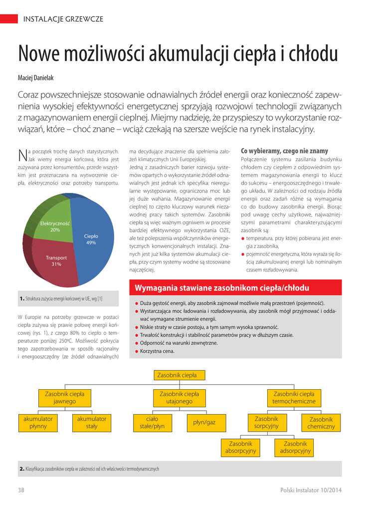 INSTALACJE GRZEWCZE Nowe możliwości akumulacji ciepła i chłodu Maciej Danielak Coraz powszechniejsze stosowanie odnawialnych źródeł energii oraz konieczność zapewnienia wysokiej efektywności energetycznej sprzyjają rozwojowi technologii związanych z magazynowaniem energii cieplnej. Miejmy nadzieję, że przyspieszy to wykorzystanie rozwiązań, które – choć znane – wciąż czekają na szersze wejście na rynek instalacyjny. N a początek trochę danych statystycznych. Jak wiemy energia końcowa, która jest zużywana przez konsumentów, przede wszystkim jest przeznaczana na wytworzenie ciepła, elektryczności oraz potrzeby transportu. Elektryczność 20% Ciepło 49% Transport 31% ma decydujące znaczenie dla spełnienia założeń klimatycznych Unii Europejskiej. Jedną z zasadniczych barier rozwoju systemów opartych o wykorzystanie źródeł odnawialnych jest jednak ich specyfika: nieregularne występowanie, ograniczona moc lub jej duże wahania. Magazynowanie energii cieplnej to często kluczowy warunek niezawodnej pracy takich systemów. Zasobniki ciepła są więc ważnym ogniwem w procesie bardziej efektywnego wykorzystania OZE, ale też polepszenia współczynników energetycznych konwencjonalnych instalacji. Znanych jest już kilka systemów akumulacji ciepła, przy czym systemy wodne są stosowane najczęściej. Co wybieramy, czego nie znamy Połączenie systemu zasilania budynku chłodem czy ciepłem z odpowiednim systemem magazynowania energii to klucz do sukcesu – energooszczędnego i trwałego układu. W zależności od rodzaju źródła energii oraz zadań różne są wymagania co do budowy zasobnika energii. Biorąc pod uwagę cechy użytkowe, najważniejszymi parametrami charakteryzującymi zasobnik są: ⚫⚫temperatura, przy której pobierana jest energia z zasobnika, ⚫⚫pojemność energetyczna, która wyraża się ilością zakumulowanej energii lub nominalnym czasem rozładowywania. Wymagania stawiane zasobnikom ciepła/chłodu 1. Struktura zużycia energii końcowej w UE, wg [1] W Europie na potrzeby grzewcze w postaci ciepła zużywa się prawie połowę energii końcowej (rys. 1), z czego 80% to ciepło o temperaturze poniżej 250ºC. Możliwość pokrycia tego zapotrzebowania w sposób racjonalny i energooszczędny (ze źródeł odnawialnych) ⚫⚫Duża gęstość energii, aby zasobnik zajmował możliwie małą przestrzeń (pojemność). ⚫⚫Wystarczająca moc ładowania i rozładowywania, aby zasobnik mógł przyjmować i oddawać wymagane strumienie energii. ⚫⚫Niskie straty w czasie postoju, a tym samym wysoka sprawność. ⚫⚫Trwałość konstrukcji i stabilność parametrów pracy w dłuższym czasie. ⚫⚫Odporność na warunki zewnętrzne. ⚫⚫Korzystna cena. Zasobnik ciepła Zasobnik ciepła jawnego akumulator płynny akumulator stały Zasobnik ciepła utajonego ciało stałe/płyn płyn/gaz Zasobniki ciepła termochemiczne Zasobnik sorpcyjny Zasobnik absorpcyjny Zasobnik chemiczny Zasobnik adsorpcyjny 2. Klasyfikacja zasobników ciepła w zależności od ich właściwości termodynamicznych 38 Polski Instalator 10/2014 Temperatura INSTALACJE GRZEWCZE ja wn e j aw ne Odbiornik Temperatura przejścia fazowego utajone ja w Źródło ciepła ne Zakumulowana energia cieplna 4. Przebieg temperaturowy jako funkcja zakumulowanej energii cieplnej w procesie jawnym i utajonym (przemiany fazowej) 3. Wodny zasobnik ciepła jawnego niu temperatury przy jej oddawaniu. Ponieważ wymieniana jest energia jawna związana ze zmianą temperatury, zasobniki te nazywane są akumulatorami ciepła jawnego (rys. 3). Są one powszechnie stosowane w instalacjach c.o. i c.w.u. jest proporcjonalna do różnicy temperatury, utajona akumulacja energii prowadzi do przemiany fazowej przy niezmienionej temperaturze (rys. 4). Ta forma akumulacji energii znana jest z akumulatorów chłodu w postaci kostek lodu w wodzie. Temperatura 0ºC utrzymuje się tak długo, jak długo topnieje lód. Energia przemiany fazowej jest relatywnie duża: energia potrzebna na topnienie wystarczy, aby taką samą ilość wody podgrzać od 0 do 80ºC. Akumulacja ciepła utajonego W przeciwieństwie do jawnej (odczuwalnej) formy akumulacji ciepła, w której ilość energii 1200 fluorki 1000 Energia przemiany fazowej, [kJ/l] Ważne kryteria to także średni czas ładowania (pobierania energii) oraz techniczne możliwości stosowania (zasobniki dzienne, okresowe czy sezonowe). Wymagania, jakie powinno się stawiać dobrym zasobnikom, zostały zestawione w ramce obok. Zadaniem zasobników ciepła jest nie tylko akumulowanie energii po to, by ją oddać (jak to ma miejsce podczas ogrzewania), ale także – w przypadku zasobników chłodu – odbiór ciepła, które musi być odprowadzone z budynku. Obecnie, jeśli chodzi o akumulację ciepła, znane są cztery rodzaje zasobników: ⚫⚫zasobnik ciepła jawnego, ⚫⚫zasobnik ciepła utajonego, ⚫⚫zasobnik sorpcyjny, ⚫⚫zasobnik chemiczny. Na rys. 2 przedstawiono klasyfikację zasobników ciepła ze względu na ich właściwości termodynamiczne. Osiągalna teoretycznie gęstość akumulacji dla tych urządzeń rośnie od lewej strony zestawienia do prawej. Zależność ta jest, niestety, odwrotna jeśli chodzi o techniczne rozpoznanie prezentowanych zasobników i ich obecność na rynku. Najczęściej spotykaną i stosowaną technologią są zasobniki ciepła jawnego. Jest to klasyczny, wodny zasobnik ciepła, w którym energia cieplna akumulowana jest w różnicy temperatury. Wodne zasobniki są powszechnie stosowane w instalacjach z kolektorami słonecznymi. Mogą być zarówno zasobnikami ciepła, jak i chłodu. węglany 800 chlorki hydraty solne 600 400 klatraty azotany woda 0,1 kWh/l 200 0 - 100 wodorotlenki wodne roztwory soli 0 parafiny alkohole polihydroksylowe kwasy tłuszczowe 100 200 300 400 500 600 Temperatura topnienia, [ C] 700 800 900 1000 O 5. Klasy materiałów zmiennofazowych z temperaturą topnienia