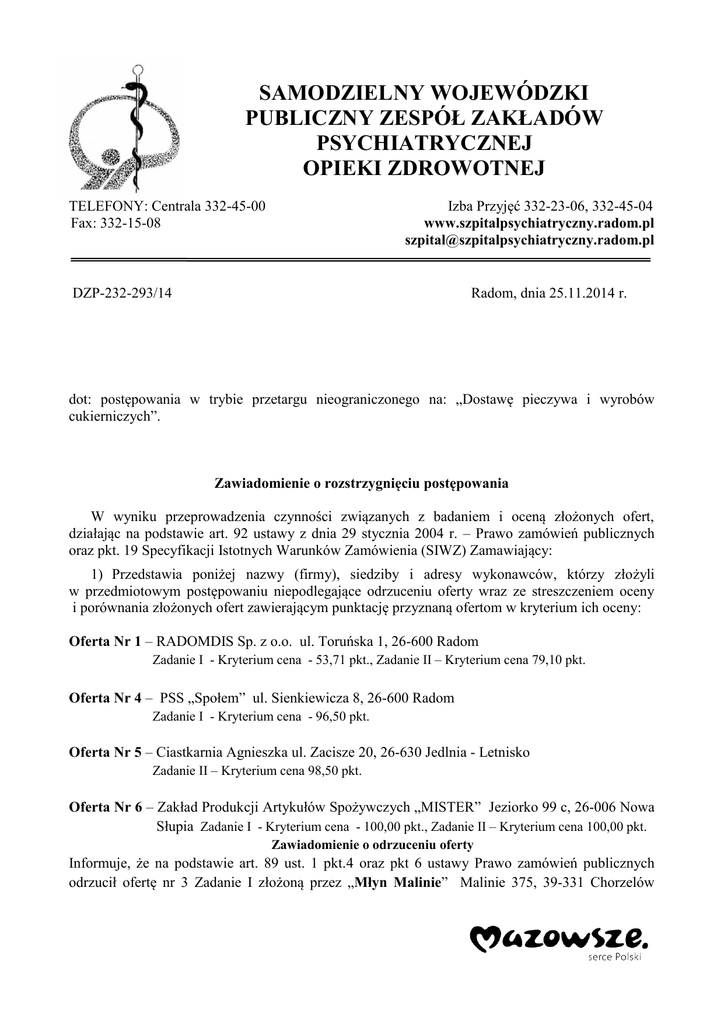 SAMODZIELNY WOJEWÓDZKI PUBLICZNY ZESPÓŁ ZAKŁADÓW PSYCHIATRYCZNEJ OPIEKI ZDROWOTNEJ 26-600 Radom, ul. Krychnowicka 1 TELEFONY: Centrala 332-45-00 Izba Przyjęć 332-23-06, 332-45-04 Fax: 332-15-08 www.szpitalpsychiatryczny.radom.pl [email protected] DZP-232-293/14 Radom, dnia 25.11.2014 r. dot: postępowania w trybie przetargu nieograniczonego na: „Dostawę pieczywa i wyrobów cukierniczych”. Zawiadomienie o rozstrzygnięciu postępowania W wyniku przeprowadzenia czynności związanych z badaniem i oceną złożonych ofert, działając na podstawie art. 92 ustawy z dnia 29 stycznia 2004 r. – Prawo zamówień publicznych oraz pkt. 19 Specyfikacji Istotnych Warunków Zamówienia (SIWZ) Zamawiający: 1) Przedstawia poniżej nazwy (firmy), siedziby i adresy wykonawców, którzy złożyli w przedmiotowym postępowaniu niepodlegające odrzuceniu oferty wraz ze streszczeniem oceny i porównania złożonych ofert zawierającym punktację przyznaną ofertom w kryterium ich oceny: Oferta Nr 1 – RADOMDIS Sp. z o.o. ul. Toruńska 1, 26-600 Radom Zadanie I - Kryterium cena - 53,71 pkt., Zadanie II – Kryterium cena 79,10 pkt. Oferta Nr 4 – PSS „Społem” ul. Sienkiewicza 8, 26-600 Radom Zadanie I - Kryterium cena - 96,50 pkt. Oferta Nr 5 – Ciastkarnia Agnieszka ul. Zacisze 20, 26-630 Jedlnia - Letnisko Zadanie II – Kryterium cena 98,50 pkt. Oferta Nr 6 – Zakład Produkcji Artykułów Spożywczych „MISTER” Jeziorko 99 c, 26-006 Nowa Słupia Zadanie I - Kryterium cena - 100,00 pkt., Zadanie II – Kryterium cena 100,00 pkt. Zawiadomienie o odrzuceniu oferty Informuje, że na podstawie art. 89 ust. 1 pkt.4 oraz pkt 6 ustawy Prawo zamówień publicznych odrzucił ofertę nr 3 Zadanie I złożoną przez „Młyn Malinie” Malinie 375, 39-331 Chorzelów ponieważ oferta zawiera błędy w obliczeniu ceny i rażąco niską cenę w stosunku do przedmiotu zamówienia. Uzasadnienie Zamawiający działając na podstawie art. 90 ust. 1 pismem z dnia 21.11.2014 r. wezwał Wykonawcę do złożenia wyjaśnień dot. rażąco niskiej ceny bułki – gryzki krojonej – 0,70 zł/ kg oraz pieczywa bezglutenowego 2,50 zł/kg co w przypadku bułki- gryzki krojonej zaoferowana cena była o około 100% niższa od pozostałych złożonych ofert, a w przypadku pieczywa bezglutenowego zaoferowana cena była niższa o około 600 % w stosunku do pozostałych złożonych ofert. W wyznaczonym terminie zamawiający otrzymał wyjaśnienie do poz. 7 (bułka-gryzka krojona), iż w pozycji tej powinno być 1,70 zł/kg a nie 0,70 zł/kg . Do poz 13 (pieczywo bezglutenowe) nie złożono wyjaśnienia. W związku z powyższym odrzucenie oferty jest zasadne. Zawiadomienie o odrzuceniu oferty Informuje, że na podstawie art. 89 ust. 1 pkt.4 ustawy Prawo zamówień publicznych odrzucił ofertę nr 2 Zadanie I złożoną przez FPU „NATEX” Sylwia Graniczka Złotniki 308 A , 39-300 Mielec ponieważ oferta zawiera rażąco niską cenę. Uzasadnienie Zamawiający działając na podstawie art. 90 ust. 1 pismem z dnia 21.11.2014 r. wezwał Wykonawcę do złożenia wyjaśnień dot. rażąco niskiej ceny bułki – gryzki krojonej – 0,77 zł/ kg oraz pieczywa bezglutenowego 3,00 zł/kg co w przypadku bułki- gryzki krojonej zaoferowana cena była o około 100% niższa od pozostałych złożonych ofert, a w przypadku pieczywa bezglutenowego zaoferowana cena była niższa o około 600 % w stosunku do pozostałych złożonych ofert. W wyznaczonym terminie zamawiający otrzymał wyjaśnienie polegające na przedstawieniu kalkulacji procentowej składników produkcji firmy „Natex”, nie otrzymał wyjaśnienia dotyczącego zaoferowanych w ofercie cen. W związku z powyższym odrzucenie oferty jest zasadne. 2) Jako najkorzystniejsza uznana została oferta złożona przez Wykonawcę: Zakład Produkcji Artykułów Spożywczych „MISTER” Jeziorko 99 c, 26-006 Nowa Słupia Zadanie I ponieważ spośród niepodlegających odrzuceniu ofert - w toku oceny uzyskała najwyższą liczbę punktów – w Zadaniu I - 100,00 pkt., w Zadaniu II – 100,00 pkt. 3) Zaoferowana cena nie przekracza kwoty, którą Zamawiający może przeznaczyć na sfinansowanie zamówienia. 4) Informuje, iż umowa w sprawie zamówienia publicznego, z zastrzeżeniem art. 183 ustawy Prawo zamówień publicznych, zostanie zawarta w terminie nie krótszym niż 5 dni od dnia przesłania zawiadomienia o wyborze najkorzystniejszej oferty, jeżeli zawiadomienie to Zamawiający prześle za pomocą środków, o których mowa w art. 27 ust. 2 ustawy Prawo zamówień publicznych wszystkim Wykonawcom, albo w terminie nie krótszym niż 10 dni jeżeli choćby jednemu z wykonawców zawiadomienie zostanie przesłane w inny sposób ( w formie pisemnej) Pouczenie o środkach ochrony prawnej przysługujących wykonawcy w toku postępowania o udzielenie zamówienia. Środki ochrony prawnej przysługują wykonawcom, a także innemu podmiotowi, jeżeli ma lub miał interes w uzyskaniu danego zamówienia oraz poniósł lub może ponieść szkodę w wyniku naruszenia przez zamawiającego przepisów ustawy Prawo zamówień publicznych. Środki ochrony prawnej wobec ogłoszenia o zamówieniu oraz SIWZ przysługują również organizacjom wpisanym na listę, której mowa w art. 154. pkt. 5 ustawy Prawo zamówień publicznych. Osobom uprawnionym przysługują środki określone w Dziale VI ustawy z dnia 29 stycznia 2004 r. – Prawo zamówień publicznych (tekst jednolity: Dz. U. z 2013 r. poz. 907 z późń. zmianami) w postaci: 1) odwołania do Prezesa Izby wobec czynności opisanych w art. 180 ust 2 ustawy Prawo zamówień publicznych w terminie 5 dni od dnia przesłania informacji o czynności zamawiającego stanowiącej podstawę jego wniesienia, oraz 5 dni od dnia zamieszczenia ogłoszenia w Biuletynie Zamówień Publicznych lub specyfikacji istotnych warunków zamówienia na stronie internetowej.