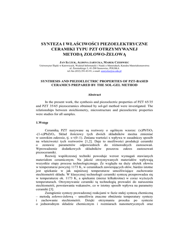 SYNTEZA I WŁAŚCIWOŚCI PIEZOELEKTRYCZNE CERAMIKI TYPU PZT OTRZYMYWANEJ METODĄ ZOLOWO-ŻELOWĄ JAN ILCZUK, ALDONA ZARYCKA, MAREK CZERWIEC Uniwersytet Śląski w Katowicach, Wydział Informatyki i Nauki o Materiałach, Katedra Materiałoznawstwa ul. Żeromskiego 3, 41-200 Sosnowiec, POLSKA tel./fax (032) 291-83-91; e-mail: [email protected] SYNTHESIS AND PIEZOELECTRIC PROPERTIES OF PZT-BASED CERAMICS PREPARED BY THE SOL-GEL METHOD Abstract In the present work, the synthesis and piezoelectric properties of PZT 65/35 and PZT 35/65 piezoceramics obtained by sol-gel method were investigated. The relationships between stoichiometry, microstructure and piezoelectric properties were studies for all samples. 1.Wstęp Ceramiką PZT nazywane są roztwory o ogólnym wzorze: (x)PbTiO3 -(1-x)PbZrO3. Skład ilościowy tych dwóch składników można zmieniać w szerokim zakresie, tj. x ≈(0 -1). Zmiana wartości x wpływa w zasadniczy sposób na właściwości tych roztworów [1,2]. Daje to możliwości produkcji ceramiki o zestawie parametrów odpowiednich do różnorodnych zastosowań. Wprowadzenie dodatkowych składników poszerza zakres zastosowań piezoceramiki. Rozwój współczesnej techniki powoduje wzrost wymagań stawianych materiałom ceramicznym. Na jakość otrzymywanych materiałów wpływają wszystkie etapy procesu technologicznego. Ze względu na duży ubytek ołowiu w temperaturze powyżej 1173 K, w ceramikach zawierających ołów, bardzo istotne jest spiekanie w jak najniższej temperaturze umożliwiające zachowanie stechiometrii składu. W klasycznej technologii ceramiki syntezę przeprowadza się w temperaturze ok. 1173 K, a spiekanie (nieraz kilkakrotne) w coraz wyższych temperaturach. Otrzymywanie ceramiki tą technologią prowadzi do naruszenia stechiometrii, powstawania wakansów, co w istotny sposób wpływa na parametry ceramiki [3]. Zastąpienie syntezy prowadzonej reakcjami w fazie stałej syntezą chemiczną – metodą zolowo-żelową – umożliwia znaczne obniżenie temperatury syntezy i zachowanie stechiometrii. Dzięki otrzymaniu proszku po syntezie o jednorodnym składzie chemicznym i rozmiarach nanometrycznych oraz zastosowaniu odpowiedniego sposobu zagęszczania otrzymana ceramika będzie charakteryzować się wysokimi wartościami parametrów piezoelektrycznych [4]. 2.Eksperyment Do badań wybrano ceramikę (x)PbTiO3-(1-x)PbZrO3 dla x wynoszącego 0,35 i 0,65. Zgodnie z diagramem fazowym dla ceramiki PZT badane składy należą do obszaru romboedrycznego (x = 0,35) i tetragonalnego (x = 0,65). Wybór materiału badań daje możliwość porównania właściwości piezoelektrycznych ceramiki z tych obszarów. Syntezę poszczególnych składów przeprowadzono metodą zolowo-żelową [5]. Do środowiska reakcji wprowadzono ołów w postaci octanu ołowiu (II) – Pb(COOCH3)2, tytan i cyrkon w postaci alkoholanów: n - propanolanu tytanu – Ti(CH3CH3CH2O)4, n - propanolanu cyrkonu – Zr(CH3CH3CH2O)4. Reakcje syntezy prowadzono w atmosferze argonu ogrzewając roztwór do temperatury bliskiej wrzenia. Otrzymany produkt reakcji poddano destylacji prostej celem usunięcia octanu propylu (ester). Po ochłodzeniu roztworu do temperatury pokojowej dodano odpowiedniego rozpuszczalnika, aby uzyskać roztwór (0,8 – 1) molowy. W celu stabilizacji roztworu alkoholanów dodano acetyloacetonu i poddano roztwór hydrolizie. W wyniku serii reakcji hydrolizowych uzyskano zol, który po przejściu w żel poddany był procesowi suszenia w temperaturze 573 K. Otrzymany proszek rozdrabniano, a następnie po dodaniu plastyfikatora formowano wypraski w kształcie dysków o wymiarach: średnicy – 10 mm, grubości – 3 mm i wypalano w temperaturze 873 K przez 4 godziny. Proces zolowo-żelowy przebiegał wg następujących reakcji [6,7]: xHOAc + Ti (OR) 4 + Zr (OR) 4 → Ti ( Zr ) Ac x (OR) 8− x Ti ( Zr ) Ac x (OR) 8− x + H 2 O hydroliza → Ti ( Zr ) Ac x (OH ) 8− x polikondensacja Ti ( Zr ) Ac x (OH ) 8− x → żel Z otrzymanego proszku sprasowano próbki i poddano je zagęszczaniu metodą prasowania na gorąco (2h w temperaturze 1500 K i ciśnieniu prasowania 20 MPa). Zewnętrzne warstwy spieczonych próbek szlifowano i polerowano. Po obróbce mechanicznej na próbki nanoszono elektrody przewodzące metodą wpalania pasty srebrnej. Do pomiarów parametrów piezoelektrycznych metodą rezonansu – antyrezonansu próbki polaryzowano w temperaturze 400K, polem 20 kV/cm, przez 2 godziny. 3.Wyniki badań i dyskusja Na Rys. 1 przedstawiono zdjęcia proszków wykonane przy użyciu skaningowego mikroskopu z emisją polową z zimną katodą HITACHI S-4700 i systemu EDS NORAN VANTAGE wykonane w Laboratorium Mikroskopii Skaningowej z Emisją polową i Mikroanalizy w Instytucie Nauk Geologicznych Uniwersytetu Jagiellońskiego. a) b) Rys. 1. Proszki ceramiczne PZT otrzymane metodą zolowo-żelową : a) PZT 65/35, b) PZT 35/65 Zastosowanie metody zolowo-żelowej umożliwia uzyskiwanie proszków ceramicznych o nanometrycznych rozmiarach ziaren. Ze względu na drobnoziarnistość otrzymanych proszków obserwujemy wytwarzanie się aglomeratów (rys.1). Przeprowadzono również analizę EDS (rys. 2) otrzymanych proszków ceramicznych, potwierdzającą homogeniczność – skład jakościowy - otrzymanych materiałów oraz zachowanie stechiometrii. a) b) Rys.2 Widma EDS materiału proszkowego PZT otrzymanego metodą zolowożelową: a) PZT 65/35, b) PZT 35/65 Na rys.3 przedstawiono mikrostrukturę trawionych chemicznie powierzchni przełomów próbek ceramicznych PZT otrzymywanych metodą gorącego prasowania. Otrzymane próbki ceramiczne posiadają dobrze wykształcone, gęsto upakowane ziarna. Ceramika ta charakteryzuje się wysoka gęstością, bliskiej gęstości rentgenowskiej (98%) Dla składu w fazie romboedrycznej (PZT 65/35) widoczne przełomy przez ziarna, natomiast dla składu w fazie tetragonalnej (PZT 35/65) przełom po granicach ziaren. a) b) Rys. 3. Mikrostruktura ceramiki a