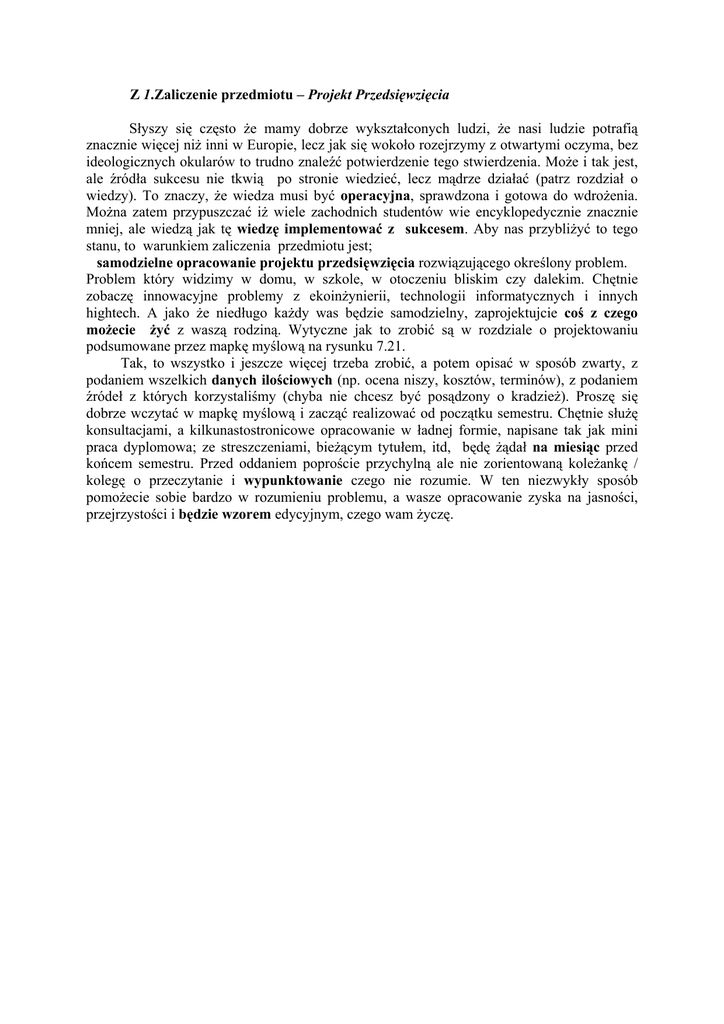 Z 1.Zaliczenie przedmiotu – Projekt Przedsięwzięcia Słyszy się często że mamy dobrze wykształconych ludzi, że nasi ludzie potrafią znacznie więcej niż inni w Europie, lecz jak się wokoło rozejrzymy z otwartymi oczyma, bez ideologicznych okularów to trudno znaleźć potwierdzenie tego stwierdzenia. Może i tak jest, ale źródła sukcesu nie tkwią po stronie wiedzieć, lecz mądrze działać (patrz rozdział o wiedzy). To znaczy, że wiedza musi być operacyjna, sprawdzona i gotowa do wdrożenia. Można zatem przypuszczać iż wiele zachodnich studentów wie encyklopedycznie znacznie mniej, ale wiedzą jak tę wiedzę implementować z sukcesem. Aby nas przybliżyć to tego stanu, to warunkiem zaliczenia przedmiotu jest; samodzielne opracowanie projektu przedsięwzięcia rozwiązującego określony problem. Problem który widzimy w domu, w szkole, w otoczeniu bliskim czy dalekim. Chętnie zobaczę innowacyjne problemy z ekoinżynierii, technologii informatycznych i innych hightech. A jako że niedługo każdy was będzie samodzielny, zaprojektujcie coś z czego możecie żyć z waszą rodziną. Wytyczne jak to zrobić są w rozdziale o projektowaniu podsumowane przez mapkę myślową na rysunku 7.21. Tak, to wszystko i jeszcze więcej trzeba zrobić, a potem opisać w sposób zwarty, z podaniem wszelkich danych ilościowych (np. ocena niszy, kosztów, terminów), z podaniem źródeł z których korzystaliśmy (chyba nie chcesz być posądzony o kradzież). Proszę się dobrze wczytać w mapkę myślową i zacząć realizować od początku semestru. Chętnie służę konsultacjami, a kilkunastostronicowe opracowanie w ładnej formie, napisane tak jak mini praca dyplomowa; ze streszczeniami, bieżącym tytułem, itd, będę żądał na miesiąc przed końcem semestru. Przed oddaniem poproście przychylną ale nie zorientowaną koleżankę / kolegę o przeczytanie i wypunktowanie czego nie rozumie. W ten niezwykły sposób pomożecie sobie bardzo w rozumieniu problemu, a wasze opracowanie zyska na jasności, przejrzystości i będzie wzorem edycyjnym, czego wam życzę. ∗ dynamika, wibroakustyka,* diagnostyka maszyn ∗ inżynieria systemów * metodologia badań * eko inżynieria * kosmologia ∗ dynamics, vibroacoustics of machinery * diagnostics ∗ systems engineering ∗ eco engineering * methodology * cosmology ∗ mechanika stosowana ∗ applied mechanics Czesław CEMPEL Prof. Dr habil. czł. koresp. PAN, dr h.c. mult. Private address: czł. Akademii Inżynierskiej w Polsce Osiedle Piastowskie 40 m. 5 PL - 61-152 Poznań Tel/fax. +48 (0) 61. 8773 893 Kom/cell. +48.601.939998 PracaPrzejsPP-ATR Poznań Styczeń 05 Teoria i Inżynieria Systemów Praca Zaliczeniowa – Projekt Koncepcyjny (wdrożenia) Przedsięwzięcia tu i teraz (jako egzemplifikacja operacyjności Twej wiedzy) Co ? a) Stacja obsługi, sieć serwisu, atestacji, recyklingu, sieć informatyczna, baza wiedzy; przedsiębiorstwa, korporacji, gminy, gospodarka odpadami, warsztat usługowy, ...stacja paliwowa, benzynowa, wodorowa, sieć stacji, ...sieć produkcji i dystrybucji, reużytkowania, .... b) Produkty eko i high tech; np.: alternatywny transport, rozpr. źródła energii odnawialnej, aero generator, farma aero generatorów, . c) Cokolwiek w swym otoczeniu; domowym, życiowym, pracy, co stanowi problem/ wymaga zmiany, .. II. Forma realizacji opisu projektu 1. Strona tytułowa z identyfikacją swego miejsca, tytułem i rodzajem opracowania, czasu, 2. Spis treści na drugiej stronie i nagłówek opracowania 3. Streszczenia (dwa) 4. Temat, zakres, cel,..- potrzeba i jej ranga, zasięg - wybór samodzielny. 5. Dane wyjściowe (obszar i zakres ważności, metoda uzyskania, źródła, forma przedstawienia, ..) do realizacji celu 6. Mapka myślowa problemu, może być na końcu – w załączniku, 7. Koncepcja zaspokojenia potrzeby – możliwe warianty, ocena ryzyka ! 8. Wybór systemu optymalnego produktu / usługi – dlaczego to ? / zaświadcz. z firmy! 9. Źródła finansowania i skrócony biznes plan – koszty (lepiej w załączniku) 10. Harmonogram (dwuwymiarowy) realizacji wdrożenia / modernizacji – kiedy ? 11. Opis projektu standardowy z przypisami1 i cytatami źródeł (foldery, Internet) i literatury np. [cempel02,s12]2 w tekście, 5 – 15 stron, z ewentualnymi załącznikami 12. Podsumowanie projektu z widokiem na przyszłość i wpływ na otoczenie 13. Spis literatury i źródeł cytowanych w tekście pracy; Autor, tytuł, kto wydał, gdzie, kiedy, strony; to samo dotyczy Internetu, ulotek, folderów, itp. Uwaga; A. Termin oddania; najpóźniej 2 tygodnie przed zakończeniem zajęć semestru B. Na zajęciach może być kolejne referowanie stanu projektu (postępów) C. Proszę o przemyślany i odpowiedzialny wybór tematu – (bo np. będzie to moje źródło utrzymania i samorealizacji) C. Dostępna jest mapka myślowa przedstawiająca sposób postępowania przy projektowaniu (przedsiew.cdr) Życzę radości tworzenia i powodzenia CC Politechnika Poznańska, Instytut Mechaniki Stosowanej ul. Piotrowo3, 60-965 Poznań Tel. (0) 61.6652 328 ∗ Fax (0) 61. 6652 307 Poznań University of Technology Applied Mechanics Institute 3 Piotrowo Street, PL - 60-965 Poznań Tel. +48 (0) 61.6652 328 ∗ Fax +48 (0) 61. 6652 307 e-mail: [email protected] ∗ Internet: http://neur.am.put.poznan.pl/cempel/ 1 2 Tak wygląda przypis, używany do definicji, wyjaśnień, szkodliwych w tekście głównym z punktu widzenia jego zwartości. Tak wygląda nowoczesny cytat; kto, kiedy, ewentualne strony jeśli książka; reszta danych o publikacji w spisie literatury.