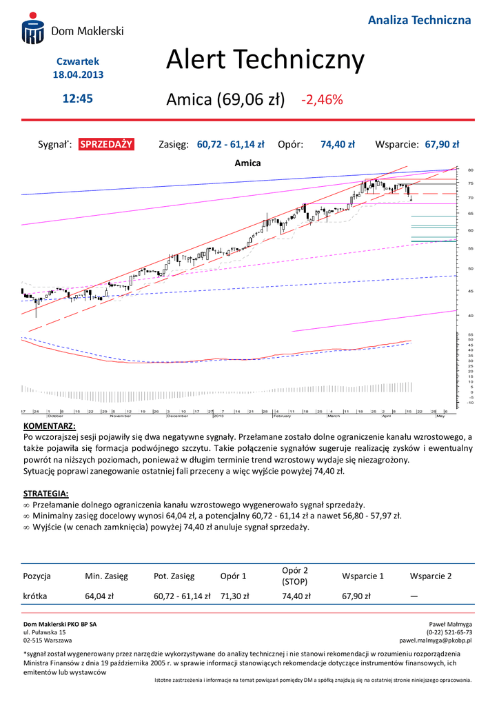 Analiza Techniczna Alert Techniczny Czwartek 18.04.2013 Amica (69,06 zł) -2,46% 12:45 Sygnał*: SPRZEDAŻY Zasięg: 60,72 - 61,14 zł Opór: Wsparcie: 67,90 zł 74,40 zł Amica 80 75 70 65 60 55 50 45 40 55 50 45 40 35 30 25 20 15 10 5 0 -5 -10 17 24 1 8 October 15 22 29 5 12 Novem ber 19 26 3 10 December 17 27 7 2013 14 21 28 4 11 February 18 25 4 Marc h 11 18 25 2 8 April 15 22 29 6 May KOMENTARZ: Po wczorajszej sesji pojawiły się dwa negatywne sygnały. Przełamane zostało dolne ograniczenie kanału wzrostowego, a także pojawiła się formacja podwójnego szczytu. Takie połączenie sygnałów sugeruje realizację zysków i ewentualny powrót na niższych poziomach, ponieważ w długim terminie trend wzrostowy wydaje się niezagrożony. Sytuację poprawi zanegowanie ostatniej fali przeceny a więc wyjście powyżej 74,40 zł. STRATEGIA: • Przełamanie dolnego ograniczenia kanału wzrostowego wygenerowało sygnał sprzedaży. • Minimalny zasięg docelowy wynosi 64,04 zł, a potencjalny 60,72 - 61,14 zł a nawet 56,80 - 57,97 zł. • Wyjście (w cenach zamknięcia) powyżej 74,40 zł anuluje sygnał sprzedaży. Pozycja Min. Zasięg Pot. Zasięg Opór 1 Opór 2 (STOP) Wsparcie 1 Wsparcie 2 krótka 64,04 zł 60,72 - 61,14 zł 71,30 zł 74,40 zł 67,90 zł — Dom Maklerski PKO BP SA ul. Puławska 15 02-515 Warszawa Paweł Małmyga (0-22) 521-65-73 [email protected] *sygnał został wygenerowany przez narzędzie wykorzystywane do analizy technicznej i nie stanowi rekomendacji w rozumieniu rozporządzenia Ministra Finansów z dnia 19 października 2005 r. w sprawie informacji stanowiących rekomendacje dotyczące instrumentów finansowych, ich emitentów lub wystawców Istotne zastrzeżenia i informacje na temat powiązań pomiędzy DM a spółką znajdują się na ostatniej stronie niniejszego opracowania. Analiza Techniczna Dom Maklerski PKO Bank Polski SA ul. Puławska 15, 02-515 Warszawa tel. (0-22) 521-80-00, fax (0-22) 521-79-46 e-mail: [email protected] Biuro Analiz Rynkowych Dyrektor Sektor wydobywczy Przemysł paliwowy, chemiczny, spożywczy Sektor energetyczny, deweloperski Sektor finansowy Handel, media, telekomunikacja, informatyka Przemysł, budownictwo, inne Analiza techniczna Artur Iwański (022) 521 79 31 [email protected] Monika Kalwasińska (022) 521 79 41 [email protected] Stanisław Ozga (022) 521 79 13 [email protected] Jaromir Szortyka (022) 580 39 47 [email protected] Włodzimierz Giller (022) 521 79 17 [email protected] Piotr Łopaciuk (022) 521 48 12 [email protected] Przemysław Smoliński (022) 521 79 10 [email protected] Paweł Małmyga (022) 521 65 73 [email protected] Analiza techniczna Biuro Klientów Instytucjonalnych Wojciech Żelechowski Dariusz Andrzejak Krzysztof Kubacki Tomasz Ilczyszyn Michał Sergejev Tomasz Zabrocki (0-22) 521 79 19 [email protected] (0-22) 521 91 39 [email protected] (0-22) 521 91 33 [email protected] (0-22) 521 82 10 [email protected] (0-22) 521 82 14 [email protected] (0-22) 521 82 13 [email protected] Piotr Dedecjus Maciej Kałuża Igor Szczepaniec Marcin Borciuch Joanna Wilk (0-22) 521 91 40 [email protected] (0-22) 521 91 50 [email protected] (0-22) 521 65 41 [email protected] (0-22) 521 82 12 [email protected] (0-22) 521 48 93 [email protected] Biuro Strategicznych Klientów Indywidualnych Paweł Kodym Ewa Kalinowska Joanna Makowska Ewald Wyszomirski (0-22) 521 80 14 [email protected] (0-22) 521 79 88 [email protected] (0-22) 580 33 14 [email protected] (0-22) 521 78 39 Michał Petruczeńko Grzegorz Klepacki Jacek Gaszewski (0-22) 521 79 69 [email protected] (0-22) 521 78 76 [email protected] (0-22) 521 65 62 [email protected] Informa cje, komenta rze i opinie zawa rte w niniejszym ma teriale nie s ą rekomenda cją w rozumieniu rozporządzenia Ministra Finansów z dnia 19 października 2005 r. w sprawie informa cji s tanowi ących rekomenda cje dotyczące ins trumentów finansowych, i ch emi tentów lub wys ta wców i nie s tanowią porady i nwes tycyjnej, rekomenda cji lub oferty za kupu lub sprzedaży i nstrumentów fi nansowych. Informa cje, komenta rze i opinie zawa rte w niniejszym ma teriale nie s ą również analizą inwes tycyjną lub analizą finansową, których mowa w us tawie z dnia 29 lipca 2005 r. o obrocie ins trumentami fi nansowymi . Niniejs zy materia ł prezentuje wyłącznie s tanowisko autora , które nie musi być tożsame ze s tanowiskiem Domu Ma klers kiego PKO Banku Polskiego. Informa cje, komenta rze i opinie zawa rte w niniejs zym materiale odzwierciedla ją wiedzę i poglądy a utora i s ą konsekwencją s ubiektywnej i nterpreta cji informa cji i danych użytych do sporządzenia niniejszego materia łu. Opra cowanie zos tało sporządzone z za chowaniem s ta ranności i rzetelności , na podsta wie informa cji i źródeł uznanych przez jego autora za wia rygodne. Jednakże ani autor, ani Dom Maklers ki PKO Banku Polskiego nie gwa rantują ich kompletnoś ci i wiarygodnoś ci. Ma teria ł przygotowano za pomocą progra mu Metas tock fi rmy Equis. Dane do wykresów dosta rcza Pa rkiet.com i Bloomberg. Źródłem pozosta łych danych są PAP, Reuters , prasa finansowa i internetowe serwis y finansowo-ekonomi czne. Należy pa mięta ć, że analiza techni czna jes t jedną z metod prognozowania tendencji w zmianie kursów ins trumentów finansowych, jednakże nie uwzgl ędnia ws zys tki ch czynników i zda rzeń, które mogą mieć wpływ na ceny ins trumentów finans owych. Autor niniejs zego opra cowania ani Dom Maklerski PKO Ba nku Polskiego l ub jakiekolwiek osoby reprezentujące Dom Ma klerski PKO Banku Polskiego nie ponoszą odpowiedzialnoś ci za decyzje inwestycyjne podjęte na pods tawie informacji , komenta rzy i opinii wyrażonych w niniejszym opra cowani u oraz za i ch skutki . Pełną listę Punktów Obs ługi Klienta można znaleźć na stronie internetowej: http://www.dm.pkobp.pl/index.php/id=placowki/