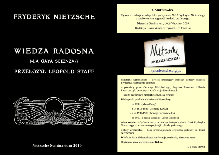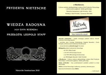 e-Mortkowicz Cyfrowa reedycja młodopolskiego wydania Dzieł Fryderyka Nietzschego z zachowaniem paginacji i układu graficznego. Nietzsche Seminarium, Łódź-Wrocław 2010 Redakcja: Jakub Wroński, Tymoteusz Słowiński http://nietzsche.org.pl/ Nietzsche Seminarium – projekt zrzeszający polskich badaczy filozofii Fryderyka Nietzschego poprzez: – powołany przez Cezarego Wodzińskiego, Bogdana Banasiaka i Pawła Pieniążka cykl dorocznych konferencji filozoficznych. – stronę internetową nietzsche.org.pl. Na stronie: Bibliografia polskich odniesień do Nietzschego - do 1918 (Marta Kopij) - z lat 1919-1939 (Grzegorz Kowal) - z lat 1939-1989 (Jadwiga Sucharzewska) - po 1989 (Bogdan Banasiak i Jakub Wroński) e-Mortkowicz - Cyfrowa reedycja młodopolskiego wydania Dzieł Fryderyka Nietzschego z zachowaniem paginacji i układu graficznego. Teksty archiwalne – baza przedwojennych artykułów polskich na temat Nietzschego Wieści ze świata Nietzschego: konferencje, seminaria, obronione prace Nietzsche Seminarium 2010 Opatrzony komentarzem zestaw linków ... i wiele innych D Z I E Ł A FRYD. N I E T Z S C H E G O FRYDERYK NIETZSCHE W P R Z E K Ł A D Z I E WACŁAWA BERENTA, KONRADA DRZEW I E C K I E G O , L E O P O L D A STAFFA I STANISŁAWA WYRZYKOWSKIEGO WYDAŁ JAKÓB MORTKOWICZ. WIEDZA RADOSNA W A R S Z A W A M C M V I — M C M V I I (»LA GAYA SCIENZA«) PRZEŁOŻYŁ LEOPOLD STAFF NAKŁAD JAKÓBA MORTKOWICZA Dom na mieszkanie własny mam, W niczem nie biegłem w cudzy ślad. — Każdego mistrzam wyśmiał rad. Który nie wyśmiał siebie sam. Nad bramą mego domu. WIEDZA ( » L A G A Y A RADOSNA S C I E N Z A « ) PRZEDMOWA DO WYDANIA DRUGIEGO. I. Książce tej potrzeba może nie tylko jednej przed m o w y ; a wkońcuby z a w s z e się jeszcze ostała wątpli wość, c z y przedmowy mogą tę książkę, jako p r z y g o d ę p r z e ż y t ą , uczynić bliższą komuś, kto nic podobnego nie przeżył. Zdaje się ona pisana w mowie powiewu o d w i l ż y : jest w niej junactwo, niepokój, przekora, pogoda kwietniowa, tak że ustawicznie przy pomina się zarówno sąsiedztwo z zimą, jak z w y c i ę s t w o nad zimą, które nadchodzi, nadejść musi, lub już może nadeszło... Wdzięczność wytryska usta wicznie, jak g d y b y stało się właśnie to, czego czło wiek najmniej oczekiwał, wdzięczność ozdrowieńca, — bo o z d r o w i e n i e było tem, czego się najmniej ocze kiwało. »Wiedza radosna« to z n a c z y saturnalie ducha, który opierał się cierpliwie straszliwemu, długiemu ucis kowi — cierpliwie, surowo, zimno, nie poddając się, lecz i bez nadziei —, i którego teraz opada nagle nadzieja zdrowia, u p o j n o ś ć ozdrowienia. Cóż z a DZIEŁA NIETZSCHEGO. T. VI. I 3 2 dziw, że przytem wiele nierozsądku i szaleństwa na j a w wychodzi, wiele swawolnej tkliwości, trwo nionej nawet na problematy, które mają sierść kolczatą i nie wydają się, jakby chciały, by je pieścić i wabić. Cala ta książka nie jest właśnie niczem innem, jeno wesołością po długim niedostatku i niemocy, ra dowaniem się z powracających sił, z budzącej się na nowo wiary w jutro i pojutrze, z nagłego poczucia i przeczucia przyszłości, blizkich przygód, mórz znowu otwartych, znów dozwolonych, znów wierze wróco n y c h celów. Cóż bo nie leżało teraz poza m n ą ! T e n szmat pustyni, wyczerpania, niewiary, zlodowa cenia wpośród młodości, ta starczość nie na swojem miejscu, ta tyrania bólu, prześcignięta jeszcze przez tyranię dumy, która odrzucała wnioskowania bólu — a wnioskowania są pocieszeniami —, to radykalne osamotnienie, jako konieczna obrona przeciw pogar dzie dla ludzi, która chorobliwie jasnowidzącą się stała, to zupełne ograniczenie się do tego, co w po znaniu gorzkie, cierpkie, ból sprawiające, jak to je zalecał w s t r ę t , wyrosły stopniowo z nieostrożnej duchowej dyety i rozpieszczenia smaku — z w ą je romantyką — och, któżby to wszystko mógł odczuć ze m ną! Ktoby to jednak mógł, w y b a c z y mi napewno więcej jeszcze, niż nieco szaleństwa, swawoli, »wiedzy radosnej«, — na przykład tę garść pieśni, które książce tym razem przydano —, pieśni, w których poeta w sposób trudny do wybaczenia z wszystkich poetów żarty sobie stroi. — A c h , bo nie tylko na poetach i ich pięknych, »lirycznych uczuciach« musi ten zmartwychwstaniec złość w y w r z e ć s w o j ą : któż wie, jakiej szuka sobie ofiary, co za potworność parodyi wkrótce nęcić g o będzie? »Incipit tragoe- dia« — napisano przy końcu tej niebezpiecznie beztroskliwej książki: miejcie się na b a c z n o ś c i ! Zapo wiada się coś hultajsko złego i z ł o ś l i w e g o : incipit parodia, niema w ą t p l i w o ś c i . . . 2. — L e c z dajmy pokój panu N i e t z s c h e m u : cóż nas obchodzi, że pan Nietzsche wrócił do zdrowia ? . . . Psycholog zna niewiele tak pociągających zagadnień, jak stosunek zdrowia do filozofii, a w razie g d y sam zachoruje, całą s w ą naukową ciekawość wnosi w swoją chorobę. Posiada się bowiem, ma się rozumieć, jeśli się jest osobą, koniecznie i filozofię swej o s o b y : je dnak istnieje tu w a ż n a różnica. W jednym filozofują jego braki, w innym bogactwa jego i siły. Pierwszemu jest filozofia jego p o t r z e b n a , c z y to jako podpora, uspokojenie, lekarstwo, wyzwolenie, podniesienie, zobo jętnienie na samego siebie; u drugiego jest ona pięk nym jeno zbytkiem, w n a j l e j z y m razie rozkoszą tryumfującej wdzięczności, która wkońcu jeszcze sie bie kosmicznemi wielkiemi głoskami na niebie pojęć wypisać musi. W innym jednak, zwyklejszym wy padku, gdy filozofią kierują braki, jak u wszystkich chorych myślicieli — a być może, że w dziejach filo zofii przeważają chorzy myśliciele — : czemże stanie się sama myśl, która dostała się pod u c i s k choroby ? Oto pytanie, obchodzące p s y c 