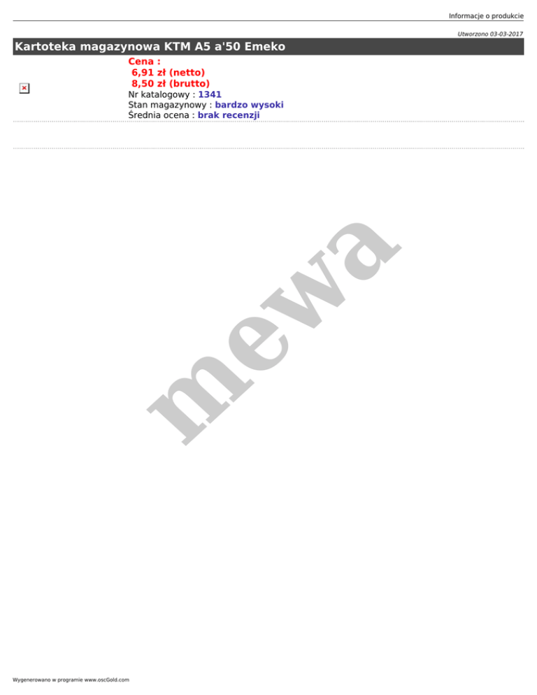 Informacje o produkcie Utworzono 03-03-2017 Kartoteka magazynowa KTM A5 a'50 Emeko Cena : 6,91 zł (netto) 8,50 zł (brutto) m ew a Nr katalogowy : 1341 Stan magazynowy : bardzo wysoki Średnia ocena : brak recenzji Wygenerowano w programie www.oscGold.com
