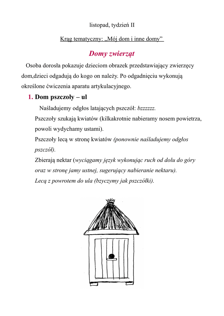 listopad, tydzień II Krąg tematyczny: „Mój dom i inne domy” Domy zwierząt Osoba dorosła pokazuje dzieciom obrazek przedstawiający zwierzęcy dom,dzieci odgadują do kogo on należy. Po odgadnięciu wykonują określone ćwiczenia aparatu artykulacyjnego. 1. Dom pszczoły – ul Naśladujemy odgłos latających pszczół: bzzzzzz. Pszczoły szukają kwiatów (kilkakrotnie nabieramy nosem powietrza, powoli wydychamy ustami). Pszczoły lecą w stronę kwiatów (ponownie naśladujemy odgłos pszczół). Zbierają nektar (wyciągamy język wykonując ruch od dolu do góry oraz w stronę jamy ustnej, sugerujący nabieranie nektaru). Lecą z powrotem do ula (bzyczymy jak pszczółki). 2. Dom psa – buda Piesek wącha szukając kości (naśladujemy wąchanie szybko nabierając i wydychając powietrze nosem). Znalazł kość, więc się oblizuje (wykonujemy ruchy okrężne językiem naokoło warg). Gryzie kość (poruszamy szczęką we wszystkie strony). Warczy, bo widzi z daleka innego psa (naśladujemy warczenie). Poznaje, że to jego kolega, więc cieszy i macha ogonem (przesuwamy kilkakrotnie jezykiem od lewego kącika ust do prawego). Piesek szczeka, żeby zawołać swojego kolegę (naśladujemy szczekanie). 3. Dom rybki – akwarium Rybka z radością pływa w wodzie (wymawiamy wielokrotnie „plum, plum...” najpierw wolno, potem coraz szybciej). Żeby płynąć jeszcze szybciej, mocno porusza ogonem (wykonujemy szybkie ruchy szerokiego języka dotykając raz górej raz dolnej wargi). Chętnie wypłynęłaby z akwarium i popłynęła dalej (przy zamkniętych ustach poruszamy językiem w buzi na róże strony wypychając policzki i wargi). Rybka chciałaby nam coś powiedzieć (mocno wysuwamy wargi do przodu otwierając i zamykając usta). 4. Dom wiewiórki – dziupla. Wiewiórka zwinnie skacze po drzewach (przy szeroko otwartej buzi dotykamy na przemian górnej i dolnej wargi, górnych i dolnych zębów, górnych i dolnych dziąseł). Zbiera orzeszki do swojego domku (wysuwamy język, po czym przesuwamy nim po górnej wardze, górnych zębach i podniebieniu do tyłu - czynność powtarzamy kilkakrotnie). Gdy nastaną mrozy, głęboko schowa się w dziupli (przesuwamy językiem po podniebieniu aż do gardziołka). Przez całą zimę będzie chrupała swoje zapasy (nagryzamy delikatnie górnymi zębami dolną wargę). 5. Dom bociana – gniazdo Bocian buduje gniazdo wysoko, bardzo wysoko (podnosimy się wysoko podnosząc ręce do góry, jednocześnie języczkiem próbując dotknąć nosa). Potrafi długo stać na jednej nodze (unosimy język do wałka dziąsłowego i jak najdłużej usiłujemy go tam utrzymać, szeroko otwierając usta). Bocian ma bardo długi dziób (wysuwamy jak najdalej do przodu złączone wargi). Potrafi tym dziobem długo klekotać: „kle, kle, kle....(wymawiamy „kle, kle..” przy szeroko otwartych ustach, unosząc język za górne zęby; próbujemy wymawiać to jak najdłużej, na jednym wydechu).