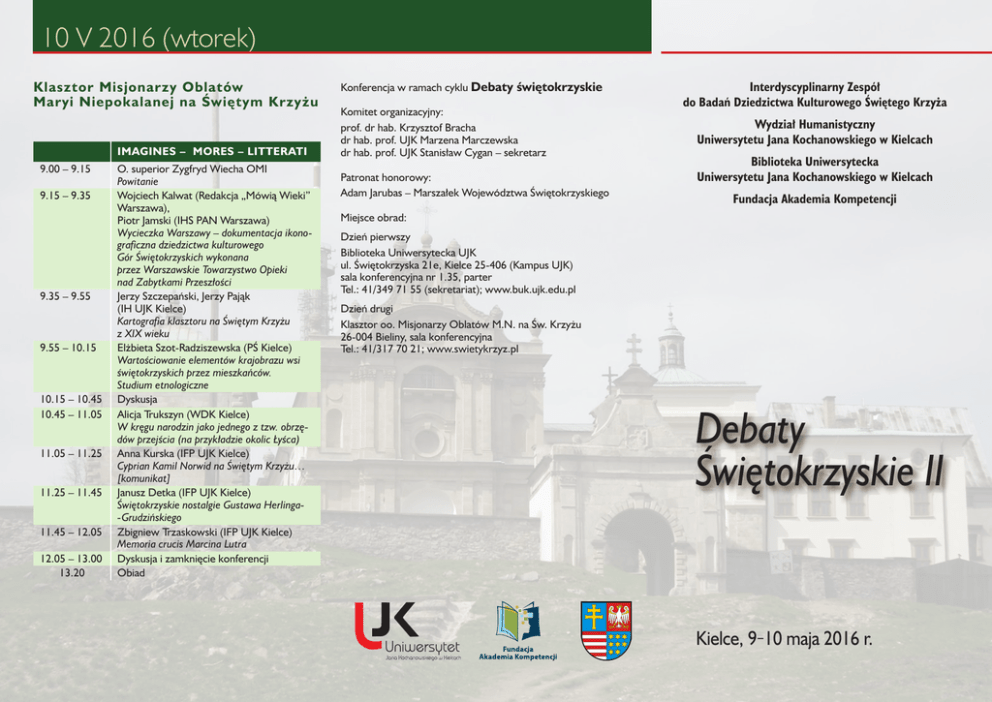 10 V 2016 (wtorek) Klasztor Misjonarzy Oblatów Maryi Niepokalanej na Świętym Krzyżu IMAGINES – MORES – LITTERATI 9.00 – 9.15 9.15 – 9.35 9.35 – 9.55 9.55 – 10.15 10.15 – 10.45 10.45 – 11.05 11.05 – 11.25 11.25 – 11.45 11.45 – 12.05 12.05 – 13.00 13.20 O. superior Zygfryd Wiecha OMI Powitanie Wojciech Kalwat (Redakcja „Mówią Wieki” Warszawa), Piotr Jamski (IHS PAN Warszawa) Wycieczka Warszawy – dokumentacja ikonograficzna dziedzictwa kulturowego Gór Świętokrzyskich wykonana przez Warszawskie Towarzystwo Opieki nad Zabytkami Przeszłości Jerzy Szczepański, Jerzy Pająk (IH UJK Kielce) Kartografia klasztoru na Świętym Krzyżu z XIX wieku Elżbieta Szot-Radziszewska (PŚ Kielce) Wartościowanie elementów krajobrazu wsi świętokrzyskich przez mieszkańców. Studium etnologiczne Dyskusja Alicja Trukszyn (WDK Kielce) W kręgu narodzin jako jednego z tzw. obrzędów przejścia (na przykładzie okolic Łyśca) Anna Kurska (IFP UJK Kielce) Cyprian Kamil Norwid na Świętym Krzyżu… [komunikat] Janusz Detka (IFP UJK Kielce) Świętokrzyskie nostalgie Gustawa Herlinga-Grudzińskiego Zbigniew Trzaskowski (IFP UJK Kielce) Memoria crucis Marcina Lutra Dyskusja i zamknięcie konferencji Obiad Konferencja w ramach cyklu Debaty świętokrzyskie Komitet organizacyjny: prof. dr hab. Krzysztof Bracha dr hab. prof. UJK Marzena Marczewska dr hab. prof. UJK Stanisław Cygan – sekretarz Patronat honorowy: Adam Jarubas – Marszałek Województwa Świętokrzyskiego Interdyscyplinarny Zespół do Badań Dziedzictwa Kulturowego Świętego Krzyża Wydział Humanistyczny Uniwersytetu Jana Kochanowskiego w Kielcach Biblioteka Uniwersytecka Uniwersytetu Jana Kochanowskiego w Kielcach Fundacja Akademia Kompetencji Miejsce obrad: Dzień pierwszy Biblioteka Uniwersytecka UJK ul. Świętokrzyska 21e, Kielce 25-406 (Kampus UJK) sala konferencyjna nr 1.35, parter Tel.: 41/349 71 55 (sekretariat); www.buk.ujk.edu.pl Dzień drugi Klasztor oo. Misjonarzy Oblatów M.N. na Św. Krzyżu 26-004 Bieliny, sala konferencyjna Tel.: 41/317 70 21; www.swietykrzyz.pl Debaty Świętokrzyskie II Kielce, 9‒10 maja 2016 r. 9 V 2016 (poniedziałek) Bi b li o t e k a U n i we r s y te c k a UJK Kie lce OB R A DY P LEN ARNE 9.00 – 9.15 9.20 – 9.40 9.40 – 10.00 10.00 – 10.20 10.20 – 10.40 10.40 – 11.00 11.00 – 11.20 11.20 – 11.40 11.40 – 12.00 12.00 – 12.20 12.20 – 13.00 13.00 – 14.30 SE KC J A I S EKCJA I I VOC E S Sekcja 1 ME DIA E VA LIA Sekcja 2 SAE C U L A X VI ‒ X VI I I Powitanie Stanisław Dubisz (UW Warszawa) O potrzebie badań regionalnych – spojrzenie językoznawcy Andrzej Dyszak (UKW Bydgoszcz) Święty Krzyż (i wyrazy pochodne) w systemie leksykalno-słowotwórczym polszczyzny i we współczesnym uzusie Marzena Marczewska (IFP UJK Kielce) Łysiec w świetle danych językowych Halina Pelc (UMCS Lublin) Językowe związki Lubelszczyzny i Kielecczyzny Dyskusja Przerwa Zygmunt Gałecki (KUL Lublin) Terenowe nazwy własne pochodzące od przymiotnika ‘łysy’ Stanisław Cygan (IFP UJK Kielce) Nazewnictwo miejscowe gminy Nowej Słupi i okolicy w „Świętokrzyskich opowieściach, legendach, gawędach” Leonarda Zyzmana Anna Kurska (IFP UJK Kielce) Kreacja miejsca i jego aury w benedyktyńskich opowieściach utekstowionych w relacjach z podróży na Święty Krzyż w XIX wieku Dyskusja i podsumowanie części plenarnej Przerwa obiadowa 14.30 – 14.50 Michał Łuczyński (Kielce) Przedchrześcijański Łysiec – rzeczywistość i legenda Adrian Jusupovič (IH PAN Warszawa) Wyprawa na Sandomierz i Łysiec z perspektywy polityki Rusi Halicko-wołyńskiej w końcu pięćdziesiątych lat XIII wieku Justyna Dziadek (IH UJK Kielce) Angelologia Mikołaja Włoskiego kaznodziei łysogórskiego z połowy XV wieku [komunikat] Dyskusja Przerwa Jerzy Michta (Kielce) Podwójny krzyż patriarchalny ze Świętego Krzyża i jego geneza Tadeusz M. Trajdos (IH PAN Warszawa) Kult Świętego Krzyża w średniowiecznej diecezji wileńskiej Czesław Hadamik (Kielce) Wykopaliska archeologiczne w klasztorze na Świętym Krzyżu w latach 2013‒2015 Dyskusja Kolacja 14.30 – 14.50 Jerzy Kaliszuk (IINiB UW Warszawa) Nowożytne lektury średniowiecznych rękopisów (na przykładzie kodeksów świętokrzyskich) Jacek Pielas (IH UJK Kielce) Nieistniejące nagrobki szlacheckie z XVI‒XVII wieku w klasztorze benedyktyńskim na Łyścu. Od inskrypcji do genealogii rodzin szlacheckich związanych ze Świętym Krzyżem Franciszek Skibiński (IZiK UMK Toruń) Kaplica Oleśnickich na Świętym Krzyżu a znaczenie fundacji sepulkralnych w budowaniu osobistego prestiżu w Rzeczpospolitej we wczesnym XVII wieku Dyskusja Przerwa Jadwiga Muszyńska (WWSH Warszawa) Sprawa pochówku Jaremy Wiśniowieckiego na Świętym Krzyżu Anna Bernacka (IH UJK Kielce) Oddziaływanie Świętego Krzyża na religijność wiernych archidiakonatu radomskiego w XVI‒XVII wieku [komunikat] Mariusz Lubczyński (BU UJK Kielce) Szlachetni, urodzeni i wielmożni. Uwagi o podłysogórskiej szlachcie w XVII wieku Dyskusja Kolacja 14.50 – 15.10 15.10 – 15.30 15.30 – 15.50 15.50 – 16.10 16.10 – 16.30 16.30 – 16.50 16.50 – 17.10 17.10 – 17.45 18.00 14.50 – 15.10 15.10 – 15.30 15.30 – 15.50 15.50 – 16.10 16.10 – 16.30 16.30 – 16.50 16.50 – 17.10 17.10 – 17.45 18.00
