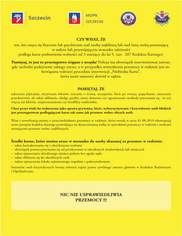 CZY WIESZ, ŻE ten, kto znęca się fizycznie lub psychicznie nad osobą najbliższą lub nad inną osobą pozostającą w stałym lub przemijającym stosunku zależności podlega karze pozbawienia wolności od 3 miesięcy do lat 5. (art. 207 Kodeksu Karnego). Pamiętaj, że jest to przestępstwo ścigane z urzędu! Policja ma obowiązek interweniować zawsze, gdy zachodzi podejrzenie takiego czynu, a w przypadku stwierdzenia przemocy w rodzinie jest zobowiązana wdrożyć procedurę interwencji „Niebieska Karta”, która może stanowić dowód w sądzie. PAMIĘTAJ, ŻE uderzenia pięściami, wyrywanie włosów, rzucanie o ścianę, szczypanie, bicie po twarzy, popychanie, niszczenie przedmiotów, ale także ubliżanie, obelgi, groźby, areszt domowy czy ograniczenie swobody poruszania się - to coś więcej niż kłótnia, nieporozumienia czy konflikty małżeńskie. Choć przez wiele lat traktowane jako sprawa prywatna, bicie, wykorzystywanie i krzywdzenie osób bliskich jest przestępstwem podlegającym karze tak samo jak przemoc wobec obcych osób. Wraz z nowelizacją ustawy o przeciwdziałaniu przemocy w rodzinie, która weszła w życie 01.08.2010 obowiązują nowe przepisy kodeksu karnego pozwalające na skuteczniejszą walkę ze zjawiskiem przemocy w rodzinie i osobami stosującymi przemoc wobec najbliższych. Środki karne, które można orzec w stosunku do osoby skazanej za przemoc w rodzinie: – – – – – zakaz kontaktowania się z określonymi osobami obowiązek powstrzymywania się od przebywania w określonych środowiskach lub miejscach zakaz opuszczania określonego miejsca pobytu bez zgody sądu zakaz zbliżania się do określonych osób nakaz opuszczenia lokalu zajmowanego wspólnie z pokrzywdzonym Interesów osób krzywdzonych bronią również zapisy prawa cywilnego zawarte głównie w Kodeksie Rodzinnym i Opiekuńczym. NIC NIE USPRAWIEDLIWIA PRZEMOCY !!! Katalog przestępstw dotyczących przemocy w rodzinie Art. 207 kk – Znęcanie się §1. Kto znęca się fizycznie lub psychicznie nad osobą najbliższą lub nad inną osobą pozostającą w stałym lub przemijającym stosunku zależności od sprawcy albo nad małoletnim lub osobą nieporadną ze względu na jej stan psychiczny lub fizyczny, podlega karze pozbawienia wolności od 3 miesięcy do lat 5. §2. Jeżeli czyn określony w §1 połączony jest ze stosowaniem szczególnego okrucieństwa, sprawca podlega karze pozbawienia wolności od roku do lat 10. Art. 208 kk – Rozpijanie Kto rozpija małoletniego, dostarczając mu napoju alkoholowego, ułatwiając jego spożycie lub nakłaniając go do spożycia takiego napoju, podlega grzywnie, karze ograniczenia wolności albo pozbawienia wolności do lat 2. Art. 209 kk – Uchylanie się od alimentów §1. Kto uporczywie uchyla się od wykonania ciążącego na nim z mocy ustawy lub orzeczenia sądowego obowiązku opieki przez niełożenie na utrzymanie osoby najbliższej lub innej osoby i przez to naraża ją na niemożność zaspokojenia podstawowych potrzeb życiowych, podlega grzywnie, karze ograniczenia wolności albo pozbawienia wolności do lat 2. Art. 210 kk – Porzucenie §1. Kto wbrew obowiązkowi troszczenia się o małoletniego poniżej lat 15 albo o osobę nieporadną ze względu na jej stan psychiczny lub fizyczny osobę tę porzuca, podlega karze pozbawienia wolności do lat 3. Art. 211 kk – Uprowadzenie Kto, wbrew woli osoby powołanej do opieki lub nadzoru, uprowadza lub zatrzymuje małoletniego poniżej lat 15 albo osobę nieporadną ze względu na jej stan psychiczny lub fizyczny, podlega karze pozbawienia wolności do lat 3. Art. 197 kk – Zgwałcenie §1. Kto przemocą, groźbą bezprawną lub podstępem doprowadza inną osobę do obcowania płciowego, podlega karze pozbawienia wolności od lat 2 do 12. […] Art. 198 kk – Wykorzystanie bezradności, upośledzenia Kto, wykorzystując bezradność innej osoby lub wynikający z upośledzenia umysłowego lub choroby psychicznej brak zdolności tej osoby do rozpoznania znaczenia czynu lub pokierowania swoim postępowaniem, doprowadza ją do obcowania płciowego lub do poddania się innej czynności seksualnej albo do wykonania takiej czynności, podlega karze pozbawienia wolności od 6 miesięcy do lat 8. Art. 200 kk – Obcowanie płciowe z małoletnim §1. Kto obcuje płciowo z małoletnim poniżej lat 15 lub dopuszcza się wobec takiej osoby innej czynności seksualnej lub doprowadza ją do poddania się takim czynnościom albo do ich wykonania, podlega karze pozbawienia wolności od lat 2 do 12. §2. Tej samej karze podlega, kto w celu zaspokojenia seksualnego prezentuje małoletniemu poniżej lat 15 wykonanie czynności seksualnej. Art. 201 kk – Kazirodztwo Kto dopuszcza się obcowania płciowego w stosunku do wstępnego, zstępnego, przysposobionego, przysposabiającego, brata lub siostry, podlega karze pozbawienia wolności od 3 miesięcy do lat 5. Możesz zmienić swoje postępowanie zgłoś się do ludzi, instytucji, organizacji MOGĄCYCH CI POMÓC w ZMIANIE ZRÓB TO DLA SIEBIE I SWOJEJ RODZINY Na terenie Szczecina są to: MOPR w Szczecinie Dział Interwencji Kryzysowej Sekcja Interwencji Kryzysowej ul. Gen. Wł. Sikorskiego 3 telefony całodobowe:1 9289, 91 46 46 333 Ośrodek Interwencji Kryzysowej Stowarzyszenia Rodzin Katolickich w Szczecinie ul. Gryfińska 151 tel. 91 48 80 010, 91 48 80 005 MOPR w Szczecinie Dział Interwencji Kryzysowej Sekcja Terapii i Profilaktyki al. Papieża Jana Pawła II 42 tel. 91 46 46 334 Ośrodek Terapii Uzależnień od Alkoholu, Współuzależnienia w Szczecinie ul. Żołnierska 55 tel. 91 48 76 070 Ogólnopolskie Pogotowie dla Ofiar Przemocy w Rodzinie „Niebieska Linia” tel. 0801 12 00 02 Policyjny telefon zaufania 0800-156-032 Policyjny telefon alarmowy 112 lub 997 Korzyści, jakie możesz osiągnąć: – – – – – – polepszenie relacji w rodzinie poszerzenie świadomości, rozwój samoświadomości emocjonalnej, zdobycie u