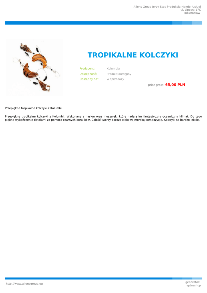 Aliens Group Jerzy Stec Produkcja-Handel-Usługi ul. Lipowa 17C Inowrocław TROPIKALNE KOLCZYKI Producent: Kolumbia Dostępność: Produkt dostępny Dostępny od*: w sprzedaży price gross: 65,00 PLN Przepiękne tropikalne kolczyki z Kolumbii. Przepiękne tropikalne kolczyki z Kolumbii. Wykonane z nasion oraz muszelek, które nadają im fantastyczny oceaniczny klimat. Do tego piękne wykończenie detalami za pomocą czarnych koralików. Całość tworzy bardzo ciekawą morską kompozycję. Kolczyki są bardzo lekkie. http://www.aliensgroup.eu generator: aptusshop