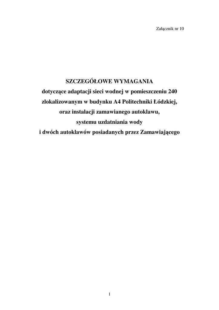 Załącznik nr 10 SZCZEGÓŁOWE WYMAGANIA dotyczące adaptacji sieci wodnej w pomieszczeniu 240 zlokalizowanym w budynku A4 Politechniki Łódzkiej, oraz instalacji zamawianego autoklawu, systemu uzdatniania wody i dwóch autoklawów posiadanych przez Zamawiającego 1 I Wykaz uŜytych symboli 1, 2 – autoklawy SMS ASVE posiadane przez zamawiającego 3 – autoklaw zamawiany A, B, C – stanowiska lokalizacji autoklawów i systemu uzdatniania wody D Aut – doprowadzenia zimnej wody wodociągowej do autoklawów na stanowiskach A, B i C D SUW – doprowadzenia zimnej wody wodociągowej do systemów uzdatniania wody na stanowiskach A, B i C GS A, GS B, GS C – gniazda zasilania elektrycznego 400 V 3 N~ dla stanowisk A, B i C NOZW – nowe, odgałęzienie zimnej wody wodociągowej dla autoklawów i systemów uzdatniania wody SO – studzienka odpływowa w podłodze SUW – system uzdatniania wody SOZW – stare odgałęzienie zimnej wody wodociągowej dla autoklawów Śc. zach. – ściana zachodnia w pomieszczeniu 240 Śc. pn. – ściana północna w pomieszczeniu 240 ZGZW – zawór główny odgałęzienia zimnej wody dla autoklawów ZK – zawory kulowe 2 II Opis wymagań i instalacji 1. Wykonawca odłączy autoklawy 1 i 2 od starego odgałęzienia zimnej wody (SOZW) (rys. 1, 2, 3 i 4). 2. Wykonawca zdemontuje stare odgałęzienie zimnej wody (SOZW). 3. Wykonawca zgodnie z wytycznymi zawartymi na rys. 5 zamontuje wzdłuŜ ściany zachodniej (Śc. zach.) nowe odgałęzienie zimnej wody dla autoklawów i systemów uzdatniania wody (NOZW). Odgałęzienie będzie: a) natynkowe b) wykonane z rur stalowych, c) wyposaŜone w zawory kulowe (ZK) we wskazanych na rys. 5 miejscach. Wymiary NOZW naleŜy ustalić na podstawie opisanych w niniejszym dokumencie wymagań. 4. Wykonawca przestawi autoklaw 1 ze stanowiska A na stanowisko B (rys. 6). Następnie wykonawca podłączy autoklaw 1 przyłączem elastycznym w oplocie do doprowadzenia zimnej wody (D Aut) na stanowisku B. Autoklaw 1 będzie podłączony jedynie do wody wodociągowej. 5. Wykonawca zaślepi doprowadzenie zimnej wody (D SUW) na stanowisku B 6. Wykonawca podłączy autoklaw 2 przyłączem elastycznym w oplocie do doprowadzenia zimnej wody (D Aut) na stanowisku C (rys. 6). Autoklaw 2 będzie podłączony jedynie do wody wodociągowej. 7. Wykonawca zaślepi doprowadzenie zimnej wody (D SUW) na stanowisku C. 8. Wykonawca umieści na stanowisku A (ustawi na podłodze lub powiesi na ścianie) system uzdatniania wody (SUW) będący przedmiotem niniejszego zamówienia (rys. 6). Następnie wykonawca podłączy SUW przyłączem elastycznym w oplocie do doprowadzenia zimnej wody (D SUW) na stanowisku A. 9. Wykonawca ustawi autoklaw 3 (będący przedmiotem niniejszego zamówienia) na stanowisku A (rys. 6). Następnie wykonawca podłączy autoklaw 3 przyłączem elastycznym w oplocie do doprowadzenia zimnej wody (D Aut) na stanowisku A. 10. Wykonawca podłączy przyłączem elastycznym w oplocie autoklaw 3 z systemem uzdatniania wody (SUW). 11. Kondensat z autoklawów 1, 2 i 3 oraz koncentrat z systemu uzdatniania wody SUW na stanowisku A będą odprowadzane węŜami do studzienki odpływowej w podłodze (SO) (rys. 6). 3 12. Przed przystąpieniem Wykonawcy do instalacji Zamawiający zainstaluje gniazdo ~230 V, 50 Hz do zasilania systemu uzdatniania wody dla autoklawu 3. 13. Wykonawca podłączy autoklawy 1, 2 i 3 do istniejących gniazd zasilania elektrycznego 400 V 3 N~ dla stanowisk A, B i C uwidocznionych na rys. 1. 14. Wymiary gabarytowe wykonanej instalacji, złoŜonej z autoklawów: 1, 2 i 3 oraz systemu uzdatniania wody SUW nie mogą być większe niŜ szer.×gł.: 3200×1200 mm (rys. 6 i 2). Gabaryty posiadanych przez zamawiającego autoklawów SMS ASVE wynoszą: a) przy zamkniętej pokrywie – szer.×gł.×wys.: 720×740×1110 mm, b) przy w pełni otwartej pokrywie – szer.×gł.×wys.: 840×740×1520 mm. Gabaryty oferowanych autoklawów nie mogą być większe niŜ: c) przy zamkniętej pokrywie – szer.×gł.×wys.: 740×780×1000 mm, d) przy w pełni otwartej pokrywie – szer.×gł.×wys.: 740×780×1800 mm. 15. Nowe odgałęzienie zimnej wody (NOZW) oraz zaoferowany autoklaw 3 i system uzdatniania wody SUW muszą charakteryzować się takimi parametrami, w tym gabarytami, Ŝe: a) przyszłościowa zamiana autoklawów 1 i 2 na autoklawy o parametrach identycznych jak autoklawu 3, b) zamontowanie dwóch kolejnych systemów uzdatniania wody o parametrach identycznych jak zaoferowanego systemu (SUW) nie spowodują zwiększenia gabarytów instalacji ponad wymiary szer.×gł.: 3200×1200 mm (rys. 7). 16. Długości uŜytych przy wykonywaniu instalacji przyłączy elastycznych: a) łączących autoklawy 1, 2 i 3 z doprowadzeniami zimnej wody D Aut na stanowiskach A, B i C, b) łączącego oferowany autoklaw 3 z systemem uzdatniania wody SUW na stanowisku A muszą umoŜliwiać odsunięcie autoklawów przynajmniej na odległość 1 m od ściany zachodniej w pomieszczeniu 240 (Śc. zach.) bez konieczności dokonywania demontaŜu instalacji. 17. Przerwa w pracy autoklawów 1 i 2 wynikająca z opisanych w niniejszych wymaganiach prac adaptacyjno-instalacyjnych nie moŜe być dłuŜsza niŜ 24 godziny od ich rozpoczęcia. 4 III Rysunki Rys. 1 Widok ogólny miejsca instalacji autoklawu i systemu uzdatniania wody (objaśnienia w tekście). Rys. 2. Widok ogólny miejsca instalacji autoklawu i systemu uzdatniania wody; linie wymiarowe przedstawiają maksymalne gabaryty instalacji. 5 Rys. 3 Zawór główny odgałęzienia zimnej wody dla autoklawów (ZGZW) i fragment starego odgałęzienia zimnej wody wodociągowej dla autoklawów (SOZW). Ść. zach. 420 mm ZGZW A B 1250 mm C 2 3200 mm 500 mm Skala: Rys. 4. Widok z góry miejsca instalacji autoklawu i systemu uzdatniania wody; przerywane linie wymiarowe przedstawiają lokalizację studzienki odpływowej (SO) oraz maksymalne gabaryty instalacji. 6 Ść. pn. 1200 mm SO 1 D Aut D SUW D Aut D SUW ZK ZGZW