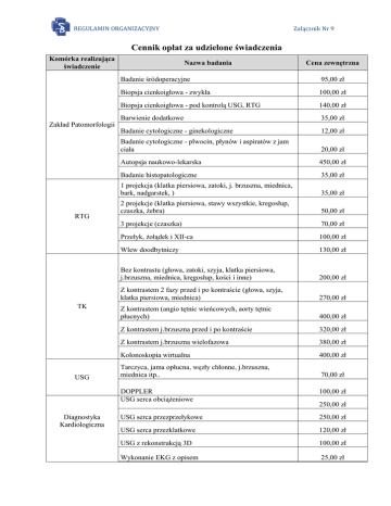 REGULAMIN ORGANIZACYJNY Załącznik Nr 9 Cennik opłat za udzielone świadczenia Komórka realizująca świadczenie Zakład Patomorfologii RTG TK USG Diagnostyka Kardiologiczna Nazwa badania Cena zewnętrzna Badanie śródoperacyjne 95,00 zł Biopsja cienkoigłowa - zwykła 100,00 zł Biopsja cienkoigłowa - pod kontrolą USG, RTG 140,00 zł Barwienie dodatkowe 35,00 zł Badanie cytologiczne - ginekologiczne 12,00 zł Badanie cytologiczne - plwocin, płynów i aspiratów z jam ciała 20,00 zł Autopsja naukowo-lekarska 450,00 zł Badanie histopatologiczne 35,00 zł 1 projekcja (klatka piersiowa, zatoki, j. brzuszna, miednica, bark, nadgarstek, ) 35,00 zł 2 projekcje (klatka piersiowa, stawy wszystkie, kregosłup, czaszka, żebra) 50,00 zł 3 projekcje (czaszka) 70,00 zł Przełyk, żołądek i XII-ca 100,00 zł Wlew doodbytniczy 130,00 zł Bez kontrastu (głowa, zatoki, szyja, klatka piersiowa, j.brzuszna, miednica, kręgosłup, kości i inne) 200,00 zł Z kontrastem 2 fazy przed i po kontraście (głowa, szyja, klatka piersiowa, miednica) 270,00 zł Z kontrastem (angio tętnic wieńcowych, aorty tętnic płucnych) 400,00 zł Z kontrastem j.brzuszna przed i po kontraście 320,00 zł Z kontrastem j.brzuszna wielofazowa 380,00 zł Kolonoskopia wirtualna 400,00 zł Tarczyca, jama opłucna, węzły chłonne, j.brzuszna, miednica itp.. 70,00 zł DOPPLER USG serca obciążeniowe 100,00 zł USG serca przezprzełykowe 250,00 zł USG serca przezklatkowe 120,00 zł USG z rekonstrukcją 3D 100,00 zł Wykonanie EKG z opisem 25,00 zł 250,00 zł REGULAMIN ORGANIZACYJNY Rehabilitacja Kardiologiczna Rehabilitacja Kardiologiczna w Ośrodku Dziennym Przychodnia Specjalistyczna Prewencja zawodowa Załącznik Nr 9 Test wysiłkowy 120,00 zł Ergospirometryczna próba wysiłkowa 180,00 zł Spirometria 50,00 zł 24 godz. Monitorowanie ekg metodą Holtera 120,00 zł Każda dodatkowa doba monitorowania EKG metodą Holtera 45,00 zł Monitorowanie ciśnienia tętniczego 100,00 zł Analiza występowania bezdechu metodą holterowską 120,00 zł Analiza występowania bezdechu aparatem ResMed 120,00 zł Badanie mikrowoltowego alternansu załamka T z oceną ryzyka nagłej śmierci 420,00 zł Test pochyleniowy diagnostyka omdleń 300,00 zł Koszt 1 doby 300,00 zł Pobyt 1 dnia 100,00 zł Porada 40,00 zł Porada w Centrum Medycyny Podróży 50,00 zł Iniekcja (+ koszt szczepionki) 15,00 zł Pobranie wycinka skóry (z badaniem histopatologicznym) 100,00 zł Profilaktyczna terapia antyretrowirusowa COM (1 dawka) 32,64 zł Profilaktyczna terapia antyretrowirusowa KAL (1 dawka) 17,40 zł Profilaktyczna terapia antyretrowirusowa LAZ (1 dawka) 13,00 zł Cenniki stanowią załącznik do Regulaminu organizacyjnego i obowiązują od 15.02.2013 r.