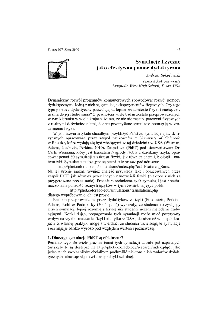 FOTON 107, Zima 2009 43 Symulacje fizyczne jako efektywna pomoc dydaktyczna Andrzej Sokołowski Texas A&M University Magnolia West High School, Texas, USA Dynamiczny rozwój programów komputerowych spowodował rozwój pomocy dydaktycznych. Jedną z nich są symulacje eksperymentów fizycznych. Czy tego typu pomoce dydaktyczne pozwalają na lepsze zrozumienie fizyki i zachęcenie ucznia do jej studiowania? Z pewnością wiele badań zostało przeprowadzonych w tym kierunku w wielu krajach. Mimo, że nic nie zastąpi pracowni fizycznych z realnymi doświadczeniami, dobrze przemyślane symulacje pomagają w zrozumieniu fizyki. W poniższym artykule chciałbym przybliżyć Państwu symulacje zjawisk fizycznych opracowane przez zespół naukowców z University of Colorado w Boulder, które wydają się być wiodącymi w tej dziedzinie w USA (Wieman, Adams, Loeblein, Perkins, 2010). Zespół ten (PhET) pod kierownictwem Dr. Carla Wiemana, który jest laureatem Nagrody Nobla z dziedziny fizyki, opracował ponad 80 symulacji z zakresu fizyki, jak również chemii, biologii i matematyki. Symulacje te dostępne są bezpłatnie on line pod adresem: http://phet.colorado.edu/simulations/index.php?cat=Featured_Sims. Na tej stronie można również znaleźć przykłady lekcji opracowanych przez zespół PhET jak również przez innych nauczycieli fizyki (niektóre z nich są przygotowane przeze mnie). Procedura techniczna tych symulacji jest przetłumaczona na ponad 40 rożnych języków w tym również na język polski http://phet.colorado.edu/simulations/ translations.php dlatego wypróbowanie ich jest proste. Badania przeprowadzone przez dydaktyków z fizyki (Finkelstein, Perkins, Adams, Kohl & Podolefsky (2004, p. 1)) wykazały, że studenci korzystający z tych symulacji lepiej rozumieją fizykę niż studenci uczeni metodami tradycyjnymi. Konkludując, propagowanie tych symulacji może mieć pozytywny wpływ na wyniki nauczania fizyki nie tylko w USA, ale również w innych krajach. Z własnej praktyki mogę stwierdzić, że studenci uwielbiają te symulacje i oceniają je bardzo wysoko pod względem wartości poznawczej. 1. Dlaczego symulacje PhET są efektowne? Pomimo tego, że wiele prac na temat tych symulacji zostało już napisanych (artykuły te są dostępne na http://phet.colorado.edu/research/index.php), jako jeden z ich zwolenników chciałbym podkreślić niektóre z ich walorów dydaktycznych odnosząc się do własnej praktyki szkolnej. 44 FOTON 107, Zima 2009 A. Dostępność i uniwersalność Jak wspomniałem, pliki tych symulacji są dostępne bez dodatkowych opłat w Internecie, mogą one też być pobrane na komputer i odtwarzane z komputera. Szeroka gama możliwości pozwala na ich wykorzystane nie tylko na poziomie uniwersyteckim, ale również licealnym i gimnazjalnym. Uczeń może pracować samodzielnie „przed komputerem”, w grupach lub może być kierowany przez nauczyciela, który pokazuje te symulacje na projektorze. Osobiście preferuję ostatnią metodę, gdyż pozwala ona na „żywą” dyskusję z uczniami i możliwość udzielenia im szybkiej rady. B. Praktyczność i naukowy charakter Przed publikowaniem w Internecie, symulacje te przechodzą szereg badań pod względem ich prostoty i pomocy w zrozumieniu przedstawionego zjawiska. Zbierane i analizowane są nie tylko opinie profesorów, którzy je stosują w praktyce, ale również glos mają studenci, do których te symulacje są adresowane. Dzięki temu prezentowane eksperymenty przedstawione są w prosty i atrakcyjny sposób, tak żeby uczeń nie był „przygnieciony” ich stroną naukową, a został „wciągnięty” w proces ich poznawania i jednocześnie odkrywania praw fizyki. Symulacje te pozwalają też na szybkie weryfikowanie stawianych hipotez, rzecz która w realnych doświadczeniach może być czasochłonna. C. Atrakcyjność formy Przyjemna i dobrze zbalansowana kolorystyka połączona z humorystycznymi elementami wraz z naturalną scenerią powoduje, że symulacje te mają często charakter zabawy, co czyni je bardzo atrakcyjnymi dla ucznia i „wciągającymi” do poznawania. Każda z tych symulacji ma również swoje specyficzne zalety, które uczeń i... nauczyciel odkrywa wraz z ich używaniem na lekcji/wykładzie. 2. Dlaczego symulacje PhET są efektywne? Symulacje te mogą być wykorzystane na różnych etapach lekcji/wykładu i mogą dobrze służyć różnorodnym celom dydaktycznym. Niektórymi z wielu elementów ich zastosowania jest: • wprowadzenie do tematu lekcji, • samodzielna praca ucznia, • forma zadań, • konsolidacja wiedzy ucznia. Przykłady z zastosowaniem tych symulacji w różnych fazach lekcji są przedyskutowane poniżej. FOTON 107, Zima 2009 45 A. Wprowadzenie do tematu Zjawisko ruchu energii w postaci fali jest stosunkowo łatwe do zademonstrowania na sznurze. Zdecydowanie trudniej jest obserwować zjawisko ruchu i interferencji dwóch fal. Rys. 1. Interferencja Fal [4] Trudne do wizualizacji zjawisko interferencji może być przedstawione studentom przed rozpoczęciem analizy matematycznej. Zmiana częstotliwości źródła powoduje różnicowanie obszarów wzmacniania i osłabiania fal. Wprowadzony detektor pozwala na pomiar amplitudy fali wypadkowej i obserwowanie zerowej amplitudy w obszarze destruktywnej interferencji. Prezentowany model interferencji fal na wodzie jest bardzo dobrym pomostem do jednoczesnego badania interferencji światła i dźwięku, na które ta symulacja również pozwala. B. Samodzielna praca ucznia Dostępność tych symulacji w Internecie stwarza możliwość kreowania prac domowych z ich zastosowaniem. Symulacja ta pozwala na konstruowanie różnych obwodów elektrycznych jak również na pomiar napięcia i natężenia prądu przy użyciu różnych elementów obwodu. Studenci mogą mieć za zadanie znalezienie relacji pomiędzy napięciem i natężeniem w połączeniach szeregowym i równoległym. Symulacja ta „pozwala” na