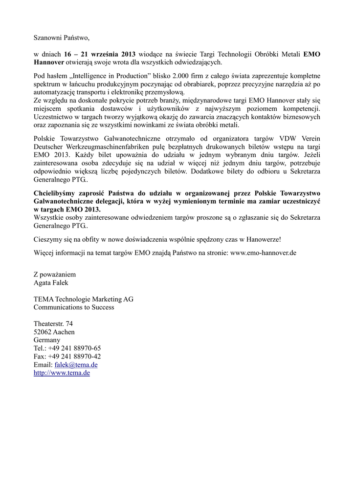 Szanowni Państwo, w dniach 16 – 21 września 2013 wiodące na świecie Targi Technologii Obróbki Metali EMO Hannover otwierają swoje wrota dla wszystkich odwiedzających. Pod hasłem „Intelligence in Production” blisko 2.000 firm z całego świata zaprezentuje kompletne spektrum w łańcuchu produkcyjnym poczynając od obrabiarek, poprzez precyzyjne narzędzia aŜ po automatyzację transportu i elektronikę przemysłową. Ze względu na doskonałe pokrycie potrzeb branŜy, międzynarodowe targi EMO Hannover stały się miejscem spotkania dostawców i uŜytkowników z najwyŜszym poziomem kompetencji. Uczestnictwo w targach tworzy wyjątkową okazję do zawarcia znaczących kontaktów biznesowych oraz zapoznania się ze wszystkimi nowinkami ze świata obróbki metali. Polskie Towarzystwo Galwanotechniczne otrzymało od organizatora targów VDW Verein Deutscher Werkzeugmaschinenfabriken pulę bezpłatnych drukowanych biletów wstępu na targi EMO 2013. KaŜdy bilet upowaŜnia do udziału w jednym wybranym dniu targów. JeŜeli zainteresowana osoba zdecyduje się na udział w więcej niŜ jednym dniu targów, potrzebuje odpowiednio większą liczbę pojedynczych biletów. Dodatkowe bilety do odbioru u Sekretarza Generalnego PTG.. Chcielibyśmy zaprosić Państwa do udziału w organizowanej przez Polskie Towarzystwo Galwanotechniczne delegacji, która w wyŜej wymienionym terminie ma zamiar uczestniczyć w targach EMO 2013. Wszystkie osoby zainteresowane odwiedzeniem targów proszone są o zgłaszanie się do Sekretarza Generalnego PTG.. Cieszymy się na obfity w nowe doświadczenia wspólnie spędzony czas w Hanowerze! Więcej informacji na temat targów EMO znajdą Państwo na stronie: www.emo-hannover.de Z powaŜaniem Agata Falek TEMA Technologie Marketing AG Communications to Success Theaterstr. 74 52062 Aachen Germany Tel.: +49 241 88970-65 Fax: +49 241 88970-42 Email: [email protected] http://www.tema.de