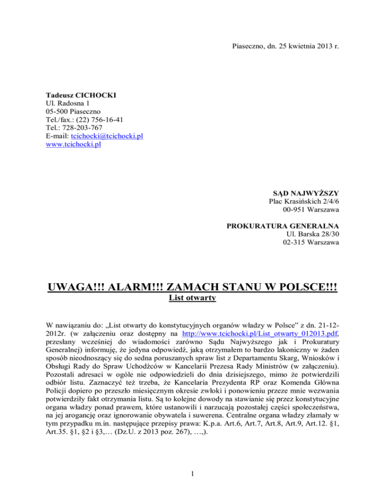 Piaseczno, dn. 25 kwietnia 2013 r. Tadeusz CICHOCKI Ul. Radosna 1 05-500 Piaseczno Tel./fax.: (22) 756-16-41 Tel.: 728-203-767 E-mail: [email protected] www.tcichocki.pl SĄD NAJWYŻSZY Plac Krasińskich 2/4/6 00-951 Warszawa PROKURATURA GENERALNA Ul. Barska 28/30 02-315 Warszawa UWAGA!!! ALARM!!! ZAMACH STANU W POLSCE!!! List otwarty W nawiązaniu do: „List otwarty do konstytucyjnych organów władzy w Polsce” z dn. 21-122012r. (w załączeniu oraz dostępny na http://www.tcichocki.pl/List_otwarty_012013.pdf, przesłany wcześniej do wiadomości zarówno Sądu Najwyższego jak i Prokuratury Generalnej) informuję, że jedyna odpowiedź, jaką otrzymałem to bardzo lakoniczny w żaden sposób nieodnoszący się do sedna poruszanych spraw list z Departamentu Skarg, Wniosków i Obsługi Rady do Spraw Uchodźców w Kancelarii Prezesa Rady Ministrów (w załączeniu). Pozostali adresaci w ogóle nie odpowiedzieli do dnia dzisiejszego, mimo że potwierdzili odbiór listu. Zaznaczyć też trzeba, że Kancelaria Prezydenta RP oraz Komenda Główna Policji dopiero po przeszło miesięcznym okresie zwłoki i ponowieniu przeze mnie wezwania potwierdziły fakt otrzymania listu. Są to kolejne dowody na stawianie się przez konstytucyjne organa władzy ponad prawem, które ustanowili i narzucają pozostałej części społeczeństwa, na jej arogancję oraz ignorowanie obywatela i suwerena. Centralne organa władzy złamały w tym przypadku m.in. następujące przepisy prawa: K.p.a. Art.6, Art.7, Art.8, Art.9, Art.12. §1, Art.35. §1, §2 i §3,… (Dz.U. z 2013 poz. 267), …,). 1 Konstytucyjne organa władzy (ustawodawczej i wykonawczej) nie przedstawiły, więc dowodów na legalne sprawowanie władzy (na zgodność opublikowanych wyników wyborów powszechnych oraz protokołów Komisji Wyborczych z wolą wyborców). Nie ustosunkowały się do propozycji wprowadzenia zmian w prawie, które miałyby w przyszłości w sposób udokumentowany zapewniać tą zgodność oraz uniemożliwić kontynuowanie urzędowania oszustów, sabotażystów, dywersantów, …. W żaden sposób nie odniosły się również do stawianych im zarzutów działania na szkodę Polski i Narodu Polskiego. Nie podjęły też propozycji przeprowadzenia jawnego, udokumentowanego referendum ogólnokrajowego nt społecznego wotum nieufności do wszystkich, konstytucyjnych organów władzy. Nie zamierzają podać się do dymisji ani przeprowadzić przyśpieszonych wyborów. Takie zachowania utwierdzają mnie w przekonaniu, że konstytucyjne organa władzy (ustawodawczej i wykonawczej) w Polsce działają w sposób nielegalny w wyniku podstępnego zamachu stanu nie zaś prawdziwie demokratycznych wyborów. W tej sytuacji, działając w interesie społecznym Narodu Polskiego oraz w związku z Art. 101, ust. 1 i Art. 129, ust. 1 Konstytucji RP, nadającymi Sądowi Najwyższemu prawo do stwierdzania ważności wyborów do Sejmu i Senatu oraz Prezydenta RP WZYWAM Konstytucyjne organa władzy (sądowniczej) w Rzeczypospolitej Polskiej do: 1. 2. 3. 4. Przedstawienia suwerenowi w sposób skuteczny w terminie do 30 czerwca 2013 r. niepodważalnych dowodów na zgodność opublikowanych, ostatnich wyników wyborów powszechnych do wszystkich organów władzy i protokołów PKW z wolą wyborców. W przypadku stwierdzenia ich braku – do spowodowania wykrycia i aresztowania (niezależnie od faktu posiadania immunitetu) wszystkich osób podejrzanych o współudział w zorganizowaniu i zrealizowaniu zamachu stanu prowadzącego do nielegalnego przejęcia i sprawowania władzy oraz działania na szkodę Polski i Polaków, aby uniemożliwić im kontynuowanie destrukcji Polski oraz ucieczkę i ukrywanie się poza granicami kraju z zamiarem unikania odpowiedzialności karnej a także postawić ich przed Trybunałem Stanu,… Spowodowanie prawdziwie demokratycznego i udokumentowanego wyłonienia nowych władz przez Naród Polski. W pierwszym rzędzie Prezydenta RP jako głowy państwa. Bieżącego, skutecznego informowania suwerena o przebiegu realizacji poszczególnych punktów niniejszego wezwania. 2 UZASADNIENIE W związku z (Art.4, ust. 1 i 2) Konstytucji RP, mówiącym, że: „Władza zwierzchnia w Rzeczypospolitej Polskiej należy do Narodu” oraz, że „Naród sprawuje władzę przez swoich przedstawicieli lub bezpośrednio” oraz faktem, że to Naród (w demokratycznym państwie prawa – jego większość) dokonuje wyborów swoich przedstawicieli do organów władzy, ostateczna decyzja, co do uznania ich ważności należy do Narodu Polskiego/suwerena – zwierzchnika władzy ustawodawczej, wykonawczej i sądowniczej. To wyłącznie od jego decyzji zależy czy stwierdzenie ważności wyborów przez Sąd Najwyższy uzna za zgodne z prawdą - jego wolą czy też nie. Suweren nie ogranicza się w swoich ocenach do sprawdzania zgodności przebiegu procesu wyborów z prawem. Uwzględnia przede wszystkim fakt narzucania mu prawa działającego na szkodę państwa i Narodu Polskiego przez osoby, które sprawują władzę bez okazania niezbędnej do tego legitymacji społecznej i które same łamią stanowione przez siebie prawo. Z bardzo wielu różnych powodów (np. wątpliwości, co do bezstronności sędziów powoływanych przez Prezydentów RP na wniosek Krajowej Rady Sądownictwa w skład, której wchodzą również przedstawiciele Sejmu, Senatu, Prezydenta, wątpliwości, co do trybu powoływania składu okręgowych i państwowej komisji wyborczych, ujawnionej dyspozycyjności niektórych sędziów w stosunku do sprawujących władzę polityków, działającego na szkodę Polski i Polaków prawa ustanawianego i egzekwowanego wbrew woli suwerena, likwidacji polskiej gospodarki i zastępowanie jej firmami zagranicznymi, w których Polacy mają być jedynie tanią siłą roboczą, zadłużania kolejnych pokoleń Polaków i doprowadzanie Polski na skraj bankructwa, utraty wolności i suwerenności, wprowadzania ustawy umożliwiającej rządz