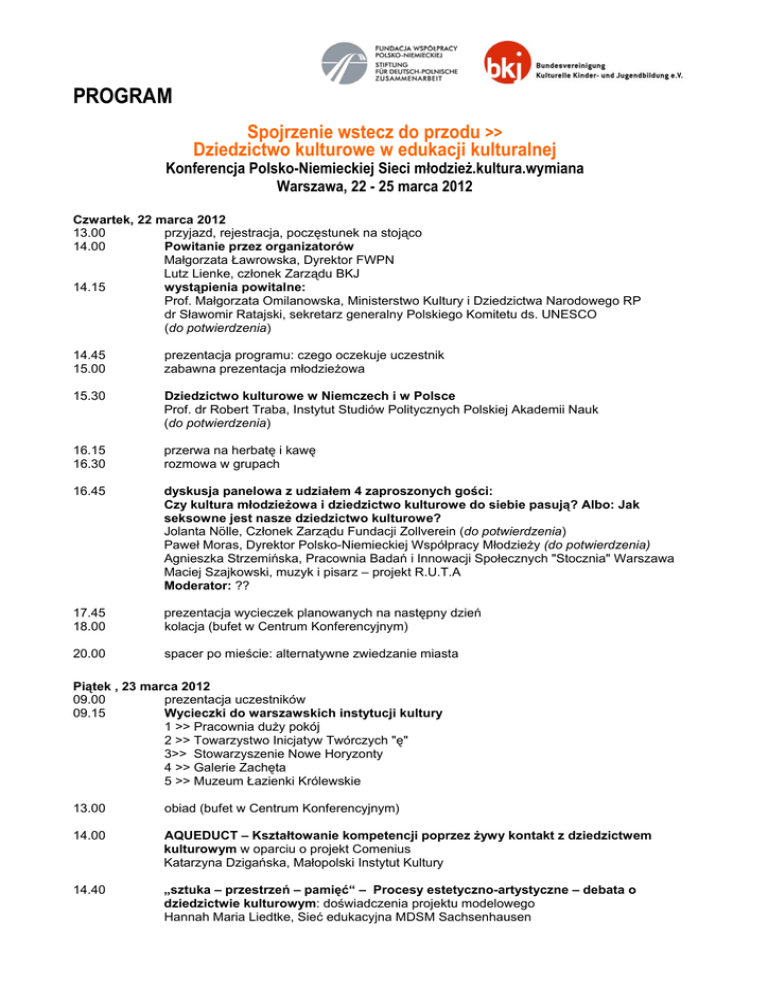 PROGRAM Spojrzenie wstecz do przodu >> Dziedzictwo kulturowe w edukacji kulturalnej Konferencja Polsko-Niemieckiej Sieci młodzież.kultura.wymiana Warszawa, 22 - 25 marca 2012 Czwartek, 22 marca 2012 13.00 przyjazd, rejestracja, poczęstunek na stojąco 14.00 Powitanie przez organizatorów Małgorzata Ławrowska, Dyrektor FWPN Lutz Lienke, członek Zarządu BKJ 14.15 wystąpienia powitalne: Prof. Małgorzata Omilanowska, Ministerstwo Kultury i Dziedzictwa Narodowego RP dr Sławomir Ratajski, sekretarz generalny Polskiego Komitetu ds. UNESCO (do potwierdzenia) 14.45 15.00 prezentacja programu: czego oczekuje uczestnik zabawna prezentacja młodzieżowa 15.30 Dziedzictwo kulturowe w Niemczech i w Polsce Prof. dr Robert Traba, Instytut Studiów Politycznych Polskiej Akademii Nauk (do potwierdzenia) 16.15 16.30 przerwa na herbatę i kawę rozmowa w grupach 16.45 dyskusja panelowa z udziałem 4 zaproszonych gości: Czy kultura młodzieżowa i dziedzictwo kulturowe do siebie pasują? Albo: Jak seksowne jest nasze dziedzictwo kulturowe? Jolanta Nölle, Członek Zarządu Fundacji Zollverein (do potwierdzenia) Paweł Moras, Dyrektor Polsko-Niemieckiej Współpracy Młodzieży (do potwierdzenia) Agnieszka Strzemińska, Pracownia Badań i Innowacji Społecznych "Stocznia" Warszawa Maciej Szajkowski, muzyk i pisarz – projekt R.U.T.A Moderator: ?? 17.45 18.00 prezentacja wycieczek planowanych na następny dzień kolacja (bufet w Centrum Konferencyjnym) 20.00 spacer po mieście: alternatywne zwiedzanie miasta Piątek , 23 marca 2012 09.00 prezentacja uczestników 09.15 Wycieczki do warszawskich instytucji kultury 1 >> Pracownia duży pokój 2 >> Towarzystwo Inicjatyw Twórczych "ę" 3>> Stowarzyszenie Nowe Horyzonty 4 >> Galerie Zachęta 5 >> Muzeum Łazienki Królewskie 13.00 obiad (bufet w Centrum Konferencyjnym) 14.00 AQUEDUCT – Kształtowanie kompetencji poprzez żywy kontakt z dziedzictwem kulturowym w oparciu o projekt Comenius Katarzyna Dzigańska, Małopolski Instytut Kultury 14.40 „sztuka – przestrzeń – pamięć“ – Procesy estetyczno-artystyczne – debata o dziedzictwie kulturowym: doświadczenia projektu modelowego Hannah Maria Liedtke, Sieć edukacyjna MDSM Sachsenhausen 15.20 Katowice – europejska stolica młodzieży Karol Piekarski, Katowice Miasto Ogrodów 16.00 przerwa na herbatę i kawę 16.30 interaktywny wykład nt. nowe media a dziedzictwo kulturowe dr Mirosław Filiciak, Centrum Badań nad Kulturą Popularną, Warszawa 17.00 memoria cross over arts. Polsko-niemieckie teatralne spotkanie młodzieży Ulrich Hardt, Expedition Metropolis 17.30 Konwersacja w formie fishbowl – Jaka jest przyszłość projektów, które łączą edukację kulturalną z dziedzictwem kulturowym i mają odwagę wyjść poza granice międzynarodowe? Uczestnicy dyskusji: >> critical friend >> grupa teatralna „Stacja Szamocin” >> Rolf Witte, BKJ kierownik działu MłodzieżKulturaSerwis międzynarodowy >> młodzież (subkultura, artyści) 18.30 zakończenie 19.00 kolacja (na mieście, z muzyką na żywo) _________________________________________________________________________________ Warsztaty Sieci dla praktyków polsko-niemieckiej młodzieżowej wymiany kulturalnej Sobota , 24 marca 2012 09.00 animacja językowa 10.00 Informacje nt. wspierania projektów przez PNWM: co nowego w PNWM >> m.in. informacja nt. składania w wniosków online w PNWM Thomas Hetzer, PNWM 10.30 grupy narodowe: wytyczne, składanie wniosków, rozliczanie i planowanie spotkania grupa polska: Thomas Hetzer, PNWM grupa niemiecka: Bianca Fischer & Luiza Iganszewska, BKJ 11.30 warsztaty partnerskie (kawa, herbata) wymiana doświadczeń w małych grupach Ewaluacja i konkretne planowanie spotkań z organizacją partnerską równolegle: doradztwo nt. projektów przez pracowników BKJ i FWPN 13.00 14.00 obiad (bufet w Centrum Konferencyjnym) dalszy ciąg warsztatów partnerskich 18.00 kolacja (na mieście) Niedziela , 25 marca 2012 09.00 animacja językowa 09.30 prezentacja Fundacji Współpracy Polsko-Niemieckiej (FWPN) Iwona Fus, FWPN 10.30 Ewaluacja spotkań młodzieży Marta Wąsowska, PNWM Warszawa (do potwierdzenia) 11.30 12.30 Ewaluacja i perspektywy obiad 2