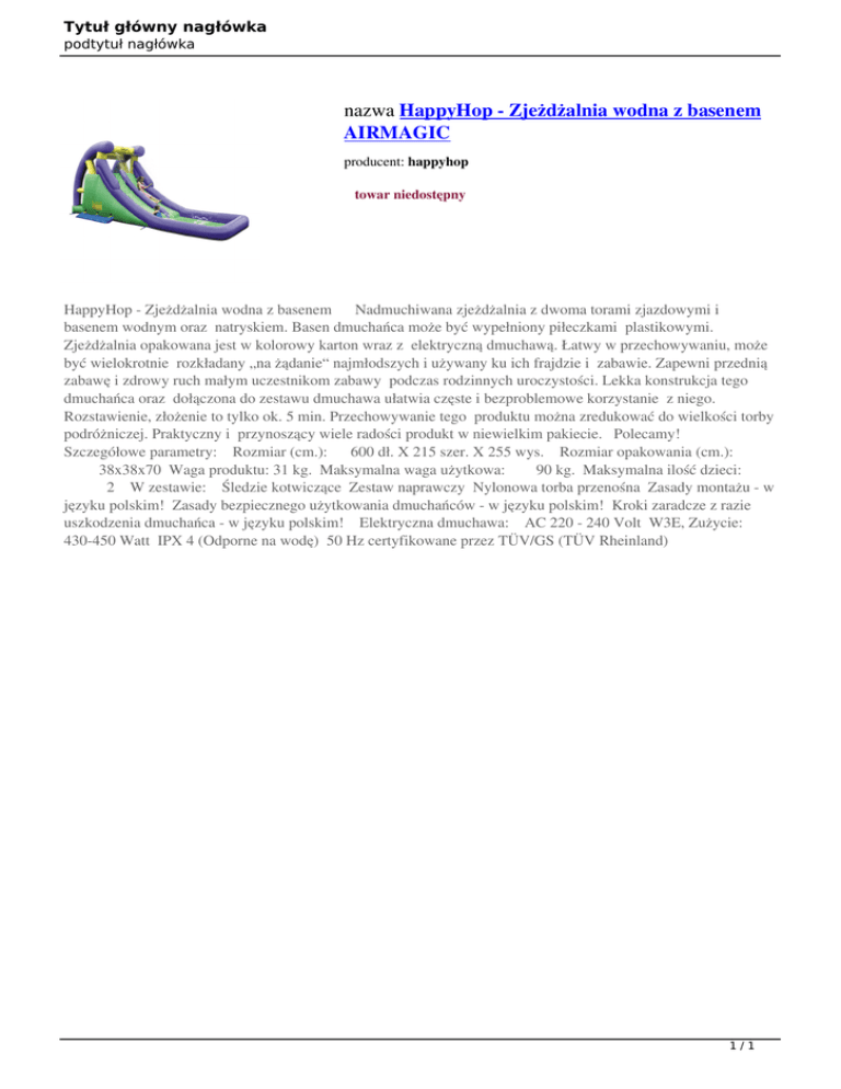 Tytuł główny nagłówka podtytuł nagłówka nazwa HappyHop - Zjeżdżalnia wodna z basenem AIRMAGIC producent: happyhop towar niedostępny HappyHop - Zjeżdżalnia wodna z basenem Nadmuchiwana zjeżdżalnia z dwoma torami zjazdowymi i basenem wodnym oraz natryskiem. Basen dmuchańca może być wypełniony piłeczkami plastikowymi. Zjeżdżalnia opakowana jest w kolorowy karton wraz z elektryczną dmuchawą. Łatwy w przechowywaniu, może być wielokrotnie rozkładany „na żądanie“ najmłodszych i używany ku ich frajdzie i zabawie. Zapewni przednią zabawę i zdrowy ruch małym uczestnikom zabawy podczas rodzinnych uroczystości. Lekka konstrukcja tego dmuchańca oraz dołączona do zestawu dmuchawa ułatwia częste i bezproblemowe korzystanie z niego. Rozstawienie, złożenie to tylko ok. 5 min. Przechowywanie tego produktu można zredukować do wielkości torby podróżniczej. Praktyczny i przynoszący wiele radości produkt w niewielkim pakiecie. Polecamy! Szczegółowe parametry: Rozmiar (cm.): 600 dł. X 215 szer. X 255 wys. Rozmiar opakowania (cm.): 38x38x70 Waga produktu: 31 kg. Maksymalna waga użytkowa: 90 kg. Maksymalna ilość dzieci: 2 W zestawie: Śledzie kotwiczące Zestaw naprawczy Nylonowa torba przenośna Zasady montażu - w języku polskim! Zasady bezpiecznego użytkowania dmuchańców - w języku polskim! Kroki zaradcze z razie uszkodzenia dmuchańca - w języku polskim! Elektryczna dmuchawa: AC 220 - 240 Volt W3E, Zużycie: 430-450 Watt IPX 4 (Odporne na wodę) 50 Hz certyfikowane przez TÜV/GS (TÜV Rheinland) 1/1
