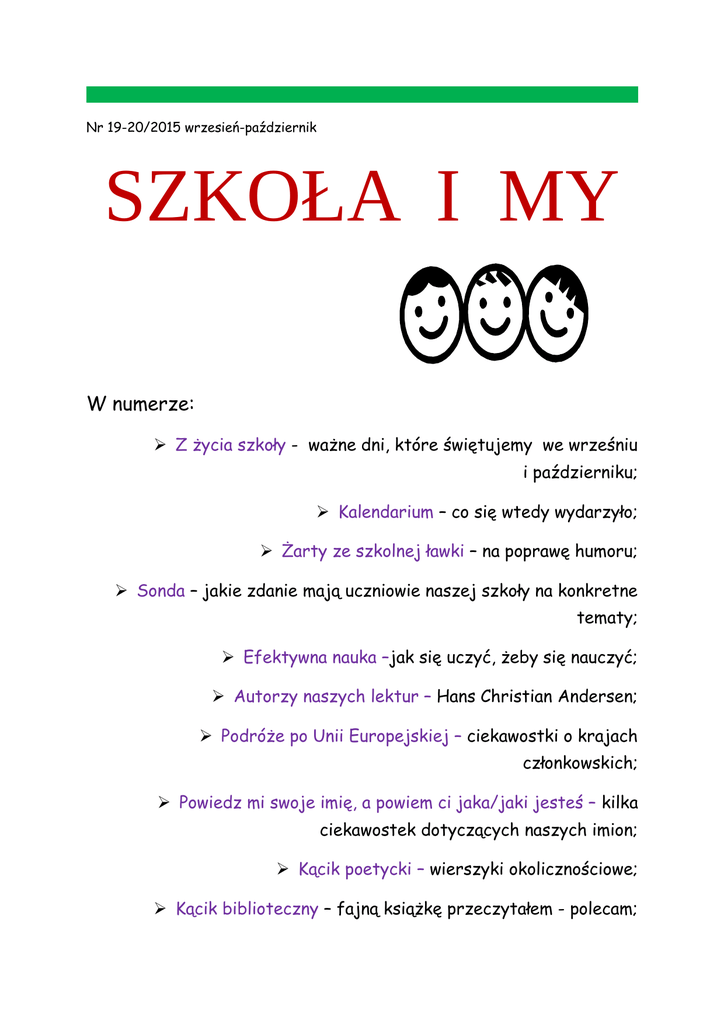 Nr 19-20/2015 wrzesień-październik SZKOŁA I MY W numerze: Z życia szkoły - ważne dni, które świętujemy we wrześniu i październiku; Kalendarium – co się wtedy wydarzyło; Żarty ze szkolnej ławki – na poprawę humoru; Sonda – jakie zdanie mają uczniowie naszej szkoły na konkretne tematy; Efektywna nauka –jak się uczyć, żeby się nauczyć; Autorzy naszych lektur – Hans Christian Andersen; Podróże po Unii Europejskiej – ciekawostki o krajach członkowskich; Powiedz mi swoje imię, a powiem ci jaka/jaki jesteś – kilka ciekawostek dotyczących naszych imion; Kącik poetycki – wierszyki okolicznościowe; Kącik biblioteczny – fajną książkę przeczytałem - polecam; Witamy w nowym roku szkolnym! Mamy nowe pomysły na naszą gazetkę – zmienił nam się „skład redakcyjny”. Mamy nadzieję, że nasze artykuły spotkaj się z Waszym zainteresowaniem. A oto stałe pozycje, jakie będziecie mogli przeczytać w naszej gazetce: Z życia szkoły - ważne dni, świętowane we wrześniu i październiku; Kalendarium – co się wtedy wydarzyło; Żarty ze szkolnej ławki – na poprawę humoru; Sonda – jakie zdanie mają uczniowie naszej szkoły na konkretne tematy; Efektywna nauka –jak się uczyć, żeby się nauczyć; Autorzy naszych lektur – Hans Christian Andersen; Podróże po Unii Europejskiej – ciekawostki o krajach członkowskich Powiedz mi swoje imię, a powiem ci jaka/jaki jesteś – kilka ciekawostek dotyczących naszych imion; Kącik poetycki – wierszyki okolicznościowe; Kącik biblioteczny – fajną książkę przeczytałem - polecam; Życzymy przyjemnej lektury! Zespół redakcyjny Z ŻYCIA SZKOŁY Ważne dni, które świętujemy we wrześniu i październiku Julia KALENDARIUM Co się wtedy wydarzyło WRZESIEŃ 1 września 1939r. – wybuch II wojny światowej 2 września 1666r. – wybuchł Wielki Pożar w Londynie 3 września 1999r. – na antenie telewizji TVN zostało wyemitowane premierowe wydanie polskiej wersji teleturnieju Milionerzy 3 września 1809r. – urodził się Juliusz Słowacki 5 września 1975r. – wydano Kodeks Ucznia 7 września 1928r. – rozpoczął się 1-y Tour de Pologne 11 września 2001r. – zamach na World Trade Centre w Nowym Jorku 12 września 1921r. – urodził się Stanisław Lem 13 września 1985r. – premiera gry video Super Mario Bross 14 września 1947r. – urodził się Jerzy Popiełuszko 17 września 1994r. – na antenie TVP2 wyemitowano premierowe wydanie teleturnieju Familiada 18 września 1951r. – ukazało się 1-e wydanie „New York Times” 24 września 1926r. – powstały Polskie Koleje Państwowe 25 września 1976r.- premiera telewizyjnego programu telewizyjnego The Muppet Show 26 września 2001r. – uruchomiono polską wersję Wikipedii 29 września 1943r. – urodził się Lech Wałęsa PAŹDZIERNIK 3 października 1970r. – wystartował program TVP2 3 października 1996r. – Wisława Szymborska otrzymała Nagrodę Nobla w dziedzinie literatury– 6 października 1889r. – w Paryżu otwarto kabaret Moulin Rouge 7 października 1977r. – ukazał się singiel We are the Champions grupy Queen 9 października 1980r. – Czesław Miłosz został laureatem literackiej Nagrody Nobla 10 października 1913r. – zakończyła się budowa Kanału Panamskiego 11 października 2014r. – w meczu eliminacyjnym do piłkarskich Mistrzostw Europy, Polska pokonała Niemcy 2:0 13 października 1884r. – ustanowiono południk zerowy w Greenwich 14 października 1773r. – powstała Komisja Edukacji Norodowej 15 października 1944r. – ukazało się 1-e wydanie „Życia Warszawy” 16 października 1978r. – początek pontyfikatu Jana Pawła II 17 października 1997r. – weszła w życie nowa Konstytucja RP 20 października 1973r. – otwarto Sydney Opera House 21 października 1833r. – urodził się Alfred Nobel 24 października 1929r. – „Czarny Czwartek” na giełdzie w Nowym Jorku 26 października 1971r. – rozpoczęła się produkcja samochodu Fiat 126p 28 października 1492r. – Krzysztof Kolumb odkrył Kubę 29 października 1824r. – urodził się Juliusz Kossak 30 października 1951r. – założono Polską Akademię Nauk Ola ŻARTY ZE SZKOLNEJ ŁAWKI Dwaj chłopcy podbiegają do policjanta: - Panie władzo, szybko, nasz nauczyciel! -co się stało? Napadli go? - Nie, on nieprawidłowo zaparkował Mama pyta syna: - Co przerabialiście dziś na chemii? -Materiały wybuchowe. - Nauczycielka zadała coś do domu? - Nie zdążyła… Nauczycielka sprawdza zadanie domowe – -Otwórzcie zeszyty. Jagoda, kiedy odrabiasz lekcje? - Po obiedzie. - To czemu tej pracy domowej nie odrobiłaś? - Bo jestem na diecie… Przychodzi Jasiu do domu szczęśliwy i mówi: -Nauczyłem się liczyć do dziesięciu: 2,3,4,5,6,7,8,9,10. -Jasiu, a gdzie jedynka? – pyta tata. - Jedynka dzienniku. Dominik SONDA Uczniom naszej szkoły zadaliśmy 2 pytania. Poniżej pokazujemy wyniki ich odpowiedzi. W badaniu brało udział 64 uczniów klas II-VI. JAK SPĘDZASZ JESIENNE WIECZORY? Gram w gry planszowe Spotykam się z przyjaciółmi Gram w gry komputerowe Śpię Oglądam TV Czytam książki Inne CO NAJBARDZIEJ LUBISZ W SZKOLE? 0,35 0,3 0,25 0,2 0,15 Kolumna 1 0,1 0,05 0 LEKCJE KOLEGÓW NAUCZYCIELI PRZERWY Kuba L EFEKTYWNA NAUKA Jak się uczyć, żeby się nauczyć Skuteczna nauka, to marzenie chyba każdego, ale nie każdy wie, że jest to możliwe. W kolejnych numerach naszej gazetki, będziemy prezentować różne metody nauki, tak aby efekt końcowy był pozytywny. Poniżej przedstawiamy mapkę myśli z pomysłami na dobre nawyki podczas nauki. Ania AUTORZY NASZYCH LEKTUR Andersen Hans Christian urodził się 2 kwietnia 1805 w Odense, zmarł 4 sierpnia1875 w Rolighed koło Kopenhagi) – duński pisarz i poeta, najbardziej znany ze swej twórczości baśniopisarskiej. ł synem szewca Hansa Andersena i niepiśmiennej praczki Anne Marie. Ojciec umarł z powodu komplikacji zdrowotnych po udziale w 
