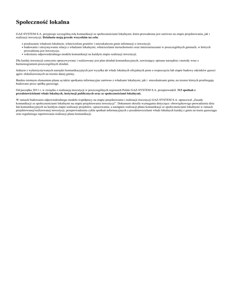 Społeczność lokalna GAZ-SYSTEM S.A. przypisuje szczególną rolę komunikacji ze społecznościami lokalnymi, która prowadzona jest zarówno na etapie projektowania, jak i realizacji inwestycji. Działania mają przede wszystkim na celu: przekazanie władzom lokalnym, właścicielom gruntów i mieszkańcom gmin informacji o inwestycji; budowanie i utrzymywanie relacji z władzami lokalnymi, właścicielami nieruchomości oraz interesariuszami w poszczególnych gminach, w których prowadzona jest inwestycja; wdrożenie odpowiedzialnego modelu komunikacji na każdym etapie realizacji inwestycji. Dla każdej inwestycji corocznie opracowywany i realizowany jest plan działań komunikacyjnych, zawierający opisane narzędzia i metody wraz z harmonogramem poszczególnych działań. Jednym z wykorzystywanych narzędzi komunikacyjnych jest wysyłka do władz lokalnych oficjalnych pism o rozpoczęciu lub etapie budowy odcinków gazoci ągów zlokalizowanych na terenie danej gminy. Bardzo istotnym elementem planu są także spotkania informacyjne zarówno z władzami lokalnymi, jak i mieszkańcami gmin, na terenie których przebiegają budowane przez spółkę gazociągi. Od początku 2011 r. w związku z realizacją inwestycji w poszczególnych regionach Polski GAZ-SYSTEM S.A. przeprowadził 313 spotkań z przedstawicielami władz lokalnych, instytucji publicznych oraz ze społecznościami lokalnymi. W ramach budowania odpowiedzialnego modelu współpracy na etapie projektowania i realizacji inwestycji GAZ-SYSTEM S.A. opracował „Zasady komunikacji ze społecznościami lokalnymi na etapie projektowania inwestycji”. Dokument określa wymagania dotyczące: obowiązkowego prowadzenia dzia łań komunikacyjnych na każdym etapie realizacji projektów, opracowania, a następnie realizacji planu komunikacji ze społecznościami lokalnymi w ramach projektowanej/realizowanej inwestycji, przeprowadzenia cyklu spotkań informacyjnych z przedstawicielami władz lokalnych każdej z gmin na trasie gazociągu oraz regularnego raportowania realizacji planu komunikacji.
