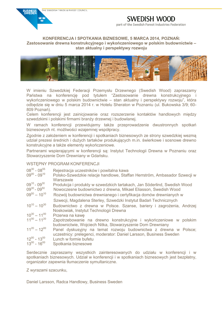 KONFERENCJA I SPOTKANIA BIZNESOWE, 5 MARCA 2014, POZNAŃ: Zastosowanie drewna konstrukcyjnego i wykończeniowego w polskim budownictwie – stan aktualny i perspektywy rozwoju W imieniu Szwedzkiej Federacji Przemysłu Drzewnego (Swedish Wood) zapraszamy Państwa na konferencję pod tytułem “Zastosowanie drewna konstrukcyjnego i wykończeniowego w polskim budownictwie – stan aktualny i perspektywy rozwoju”, która odbędzie się w dniu 5 marca 2014 r. w Hotelu Sheraton w Poznaniu (ul. Bukowska 3/9; 60809 Poznań). Celem konferencji jest zainicjowanie oraz rozszerzenie kontaktów handlowych między szwedzkimi i polskimi firmami branży drzewnej i budowlanej. W ramach konferencji przewidujemy także przeprowadzenie dwustronnych spotkań biznesowych nt. możliwości wzajemnej współpracy. Zgodnie z założeniem w konferencji i spotkaniach biznesowych ze strony szwedzkiej wezmą udział prezesi średnich i dużych tartaków produkujących m.in. świerkowe i sosnowe drewno konstrukcyjne a także elementy wykończeniowe. Partnerami wspierającymi w konferencji są: Instytut Technologii Drewna w Poznaniu oraz Stowarzyszenie Dom Drewniany w Gdańsku. WSTĘPNY PROGRAM KONFERENCJI 0830 - 0855 0900 - 0910 0910 - 0930 0930 - 0950 0950 – 1010 1010 – 1030 1030 – 1100 1100 – 1120 1120 – 1200 1200 - 1300 1300 - 1600 Rejestracja uczestników i powitalna kawa Polsko-Szwedzkie relacje handlowe, Staffan Herrström, Ambasador Szwecji w Warszawie Produkcja i produkty w szwedzkich tartakach, Jan Söderlind, Swedish Wood Nowoczesne budownictwo z drewna, Mikael Eliasson, Swedish Wood Rozwój budownictwa drewnianego i certyfikacja domów drewnianych w Szwecji, Magdalena Sterley, Szwedzki Instytut Badań Technicznych Budownictwo z drewna w Polsce. Szanse, bariery i zagrożenia, Andrzej Noskowiak, Instytut Technologii Drewna Przerwa na kawę Zapotrzebowanie na drewno konstrukcyjne i wykończeniowe w polskim budownictwie, Wojciech Nitka, Stowarzyszenie Dom Drewniany Panel dyskusyjny na temat rozwoju budownictwa z drewna w Polsce; uczestnicy: prelegenci, moderator: Daniel Larsson, Business Sweden Lunch w formie bufetu Spotkania biznesowe Serdecznie zapraszamy wszystkich zainteresowanych do udziału w konferencji i w spotkaniach biznesowych. Udział w konferencji i w spotkaniach biznesowych jest bezpłatny, organizator zapewnia tłumaczenie symultaniczne. Z wyrazami szacunku, Daniel Larsson, Radca Handlowy, Business Sweden FORMULARZ ZGLOSZENIOWY Zgłoszenia prosimy kierować na adres [email protected] lub faxem +48 22 505 84 61 podając: Nazwę firmy Imię i nazwisko Stanowisko/tytuł E-mail Telefon kontaktowy Poniżej proszę o zaznaczenie obszaru zainteresowania w czasie dwustronnych spotkań biznesowych Drewno do produkcji więźb dachowych Drewno do produkcji domów drewnianych Drewno do produkcji drewna klejonego Drewno do stolarki otworowej Szacunkowy roczny wolumen zapotrzebowania na drewno (m3) ____________________ Zgłoszenia przyjmujemy do 14 lutego 2014 r. Na wszelkie pytania odpowiada Kacper Pierzynowski, Business Sweden, [email protected] , tel. +48 664 431 071