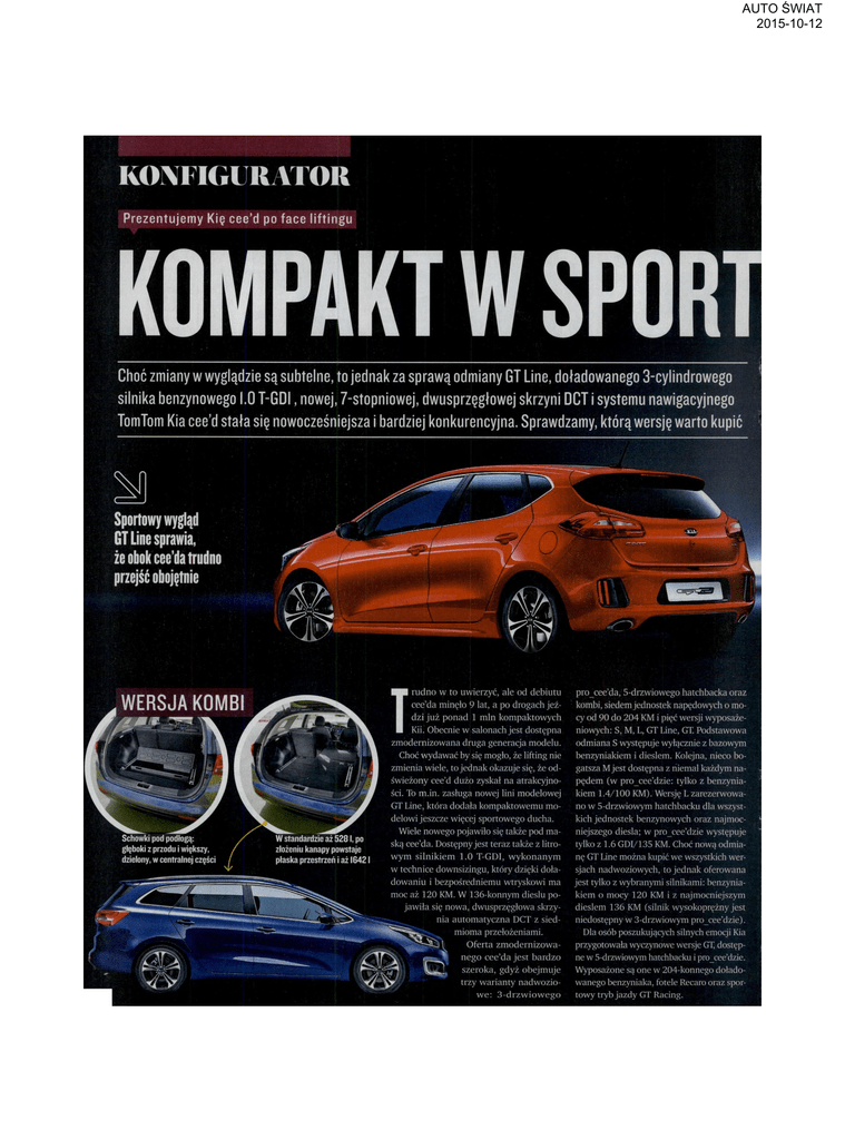 AUTO ¦WIAT 2015-10-12 KONFIGURATOR Prezentujemy Kię cee'd p o f a c e l i f t i n g u Choć zmiany w wyglądzie są subtelne, to jednak za sprawą odmiany GT Line, doładowanego 3-cylindrowego silnika benzynowego 1.0 T-GDI, nowej, 7-stopniowej, dwusprzęgłowej skrzyni DCI i systemu nawigacyjnego TomTom Kia cee'd stała się nowocześniejsza i bardziej konkurencyjna. Sprawdzamy, którą wersję warto kupić Sportowy wygląd GT Line sprawia, że obok cee'da trudno przejść obojętnie j>. rpy — T WERSJA KOMBI SJm li. mm Schowki pod podłogą: głęboki z przodu iwiększy, dzielony, w centralnej części W standardzie aż 5281, po złożeniu kanapy powstaje płaska przestrzeńi aż 16421 LMA \!\9J rudno w to uwierzyć, ale od debiutu cee'da minęło 9 lat, a po drogach jeź dzi już ponad 1 mln kompaktowych Kii. Obecnie w salonach jest dostępna zmodernizowana druga generacja modelu. Choć wydawać by się mogło, że lifting nie zmienia wiele, to jednak okazuje się, że od świeżony cee'd dużo zyskał na atrakcyjno ści. To m.in. zasługa nowej lini modelowej GT Line, która dodała kompaktowemu mo delowi jeszcze więcej sportowego ducha. Wiele nowego pojawiło się także pod ma ską cee'da. Dostępny jest teraz także z litro wym silnikiem 1.0 T-GDI, wykonanym w technice downsizingu, który dzięki doła dowaniu i bezpośredniemu wtryskowi ma moc aż 120 KM. W 136-konnym dieslu po jawiła się nowa, dwusprzęgłowa skrzy nia automatyczna DCT z siedmioma przełożeniami. Oferta zmodernizowanego cee'da jest bardzo f^j HJU.. szeroka, gdyż obejmuje y trzy warianty nadwoziowe: 3-drzwiowego m pro_cee'da, 5-drzwiowego hatchbacka oraz kombi, siedem jednostek napędowych o mo cy od 90 do 204 KM i pięć wersji wyposaże niowych: S, M, L, GT Line, GT. Podstawowa odmiana S występuje wyłącznie z bazowym benzyniakiem i dieslem. Kolejna, nieco bo gatsza M jest dostępna z niemal każdym na pędem (w pro_cee'dzie: tylko z benzynia kiem 1.4/100 KM). Wersję L zarezerwowa no w 5-drzwiowym hatchbacku dla wszyst kich jednostek benzynowych oraz najmoc niejszego diesla; w pro_cee'dzie występuje tylko z 1.6 GDI/135 KM. Choć nową odmia nę GT Line można kupić we wszystkich wer sjach nadwoziowych, to jednak oferowana jest tylko z wybranymi silnikami: benzynia kiem o mocy 120 KM i z najmocniejszym dieslem 136 KM (silnik wysokoprężny jest niedostępny w 3-drzwiowym pro_cee'dzie). Dla osób poszukujących silnych emocji Kia przygotowała wyczynowe wersje GT, dostęp ne w 5-drzwiowym hatchbacku i pro_cee'dzie. Wyposażone są one w 204-konnego dołado wanego benzyniaka, fotele Recaro oraz spor towy tryb jazdy GT Racing. AUTO ¦WIAT 2015-10-12 Q PRAKTYCZNE ROZWIĄZANIA, KTÓRE SPRAWDZAJĄ SIĘ NA C0 DZIEŃ PRZESTRONNE I FUNKCJONALNE WNĘTRZE Niezależnie od tego, czy mamy do czy nienia z 5-drzwiowym hatchbackiem, czy kombi, we wnętrzu cee'da wygo spodarowano dużą przestrzeń dla po dróżnych w obu rzędach siedzeń. Komfortowe warunki podróżowania zapewniają też: seryjna klimatyzacja (w wersjach L i GT Line - automa tyczna), wygodne siedzenia i podło- kietniki w obu rzędach foteli. Liczne schowki pomagają utrzymać porzą dek we wnętrzu. Oprócz głównego, wyposażonego w funkcję chłodzenia, oraz kieszeni w przednich drzwiach napoje można przewozić w specjalnie przygotowanych do tego uchwytach, znajdujących się na tunelu central nym, a także w tylnym podłokietniku. AUTO ¦WIAT 2015-10-12 1IGIKATOK WYPOSAŻENI! « ..,«£«/ *«- ! 1100 If? 140 ' .6o=^j^^x „a. » 2io j £x V Z^" -' Bfcx vk\ o /- j A •• W eW 93.25 MHz w i mi6 I ™ | l f .' ^ agggyagg V IT AUTO , x_ .-•• * " V ' T/ xv QP | GT LINE od 81 040 zł Nowa linia modelowa, skierowana do osób o sportowym usposobieniu. Atmosferę wyścigów można poczuć we wnętrzu dzięki: kierownicy obszytej perforowaną skórą, aluminiowym nakładkom na pedałach, pikowanej tapicerce foteli, czarnej podsufitce, gniazdom klamek drzwi wykończonym na wysoki połysk, a także jednolitej desce rozdzielczej z matową konsolą środkową. Nabywcy tej wersji otrzymują również system bezkluczykowego dostępu do auta oraz nawi gację satelitarną z 7-calowym ekranem dotykowym. Choć w najtańszych wersjach S i M nie ma wykończonych skórą koła kierownicy i gałki zmiany biegów, to jednak poziom wyposażenia jest zadowalający. W standardzie są m.in.: klimatyzacja manualna z chłodzonym schowkiem, sterowany z kierownicy radioodtwarzacz CD/MP3, wypo sażony w złącza USB, Aux, iPod oraz zestaw Bluetooth. Bezpieczeństwo zapewniają: 6 airbagów, ESP i - w wersji M - światła przeciwmgielne, do jazdy dziennej LED i podgrzewane lusterka. / / I i / Nieco droższa odmiana L ma bogatsze wyposażenie seryjne, a także większe możliwości doposażenia. Można ją poznać po: chromowanych klamkach drzwi, 2-kolorowej tapicerce, klimatyzacji aut., skórzanym wykończeniu kierownicy i lewarka biegów oraz eiektrochromatycznym lusterku wstecznym. Są tu też czujniki parkowania tyłem, elektr. ster. szyby tylne, podłokietnik w tylnej kanapie, czujnik deszczu i wsp. ukł. kierowniczego Flex Steer. AUTO ¦WIAT 2015-10-12 Na zewnątrz GT Line można poznać po głęboko przetłoczonych zderzakach, spoilerach progowych, przyciemnianych szybach oraz 17-calowych alufelgach 225/45 R17 Bez odrywania rąk od kierownicy można obsługiwać kom puter pokładowy, telefon i tempomat oraz wybrać jeden z trzech trybów pracy układu kierowniczego Flex Steer Podobnie jak w wersji GT światła do jazdy dziennej LED w kształcie kostek lodu oraz diodowe tylne lampy. Chromowana końcówka wydechu podkreśla sportowy charakter Tapicerka z przeszyciami w kształcie rombow świetnie kontrastuje z szarymi wstawkami Poręczna obszyta skorą kierownica z charakterystycznymi szarymi szwami ŁCONNECTEDCAR WiiWIłti' Nawigacja z ekranem doty • :<nvATii»• yg ranmiM mmm NOWOCZESNE MULTIMEDIA Każdego cee'da wyposażono w fabryczne audio. Wszystkie wersje 