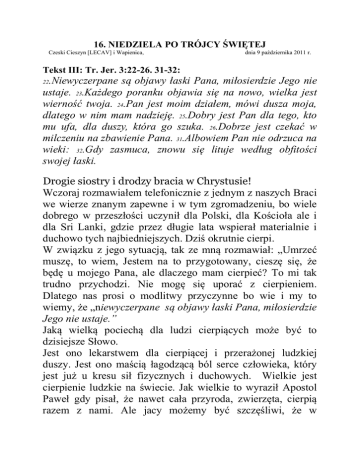 16. NIEDZIELA PO TRÓJCY ŚWIĘTEJ Czeski Cieszyn [LECAV] i Wapienica, dnia 9 października 2011 r. Tekst III: Tr. Jer. 3:22-26. 31-32: .Niewyczerpane są objawy łaski Pana, miłosierdzie Jego nie ustaje. 23.Każdego poranku objawia się na nowo, wielka jest wierność twoja. 24.Pan jest moim działem, mówi dusza moja, dlatego w nim mam nadzieję. 25.Dobry jest Pan dla tego, kto mu ufa, dla duszy, która go szuka. 26.Dobrze jest czekać w milczeniu na zbawienie Pana. 31.Albowiem Pan nie odrzuca na wieki: 32.Gdy zasmuca, znowu się lituje według obfitości swojej łaski. 22 Drogie siostry i drodzy bracia w Chrystusie! Wczoraj rozmawiałem telefonicznie z jednym z naszych Braci we wierze znanym zapewne i w tym zgromadzeniu, bo wiele dobrego w przeszłości uczynił dla Polski, dla Kościoła ale i dla Sri Lanki, gdzie przez długie lata wspierał materialnie i duchowo tych najbiedniejszych. Dziś okrutnie cierpi. W związku z jego sytuacją, tak ze mną rozmawiał: „Umrzeć muszę, to wiem, Jestem na to przygotowany, cieszę się, że będę u mojego Pana, ale dlaczego mam cierpieć? To mi tak trudno przychodzi. Nie mogę się uporać z cierpieniem. Dlatego nas prosi o modlitwy przyczynne bo wie i my to wiemy, że „niewyczerpane są objawy łaski Pana, miłosierdzie Jego nie ustaje.” Jaką wielką pociechą dla ludzi cierpiących może być to dzisiejsze Słowo. Jest ono lekarstwem dla cierpiącej i przerażonej ludzkiej duszy. Jest ono maścią łagodzącą ból serce człowieka, który jest już u kresu sił fizycznych i duchowych. Wielkie jest cierpienie ludzkie na świecie. Jak wielkie to wyraził Apostol Paweł gdy pisał, że nawet cała przyroda, zwierzęta, cierpią razem z nami. Ale jacy możemy być szczęśliwi, że w odróżnieniu od przyrody, mamy wielką pociechę naszym w cierpieniu, mamy pociechę i uciszenie naszego bólu właśnie w naszym Panu Jezusie Chrystusie, właśnie w Słowie Bożym, które jest dzisiaj nam zwiastowane. Jeden z księży tak opisuje trudne przykłady z swojej pracy duszpasterskiej. Oto przyszedł przed pogrzebem do młodego małżeństwa, które straciło piętnastomiesięczne dziecko. Długo chorowało. Były chwile pełne nadziei, ale i chwile utraty nadziei. Wreszcie nastąpiła śmierć. Duszpasterz usiadł w małej kuchni podczas tej rozmowy przedpogrzebowej, gdzie siedziała zalana łzami młoda matka, a ojciec był tak przerażony, że nie potrafił słowa z siebie wyksztusić. Wtedy ta młoda kobieta powiada do księdza: „Proszę księdza, to że straciliśmy naszego synka jest straszne, ale jeszcze straszniejsze są odwiedziny naszych znajomych i sąsiadów, którzy mają dla nas jedyną „pociechą” w słowach: „Jesteście jeszcze młodzi, możecie mieć za niedługo drugie dziecko!” To nas strasznie ugodziło. Im wydaje się, że jedno dziecko można zastąpić drugim dzieckiem? Taka pociecha nie jest żadną pociechą. To jest „tania pociecha” nic nie znacząca i nic nie dająca, lepiej by jej nie było. Inny przykład z pracy tego duszpasterza. Małżeństwo w Jego parafii po pięćdziesiątce, obchodzili dopiero co 25 – lecie pożycia małżeńskiego i nagle on znalazł sobie o wiele młodszą partnerkę życiową, bo stwierdził, że żona już się postarzała. Czy można tak potraktować kogoś z kim przeżyło się wspólnie ćwierć wieku? Jakiż wielki żal i ból sprawił ten człowiek swojej żony. Kiedyś także w mojej długiej pracy duszpasterskiej przeżyłem wraz z małżeństwem, w którym ona była moją byłą konfirmantką, tragedię ich życia. Byli na wypoczynku. Nieomalże na ich oczach utopił się ich 4 - letni synek. Co miałem im powiedziec? Wiedziałem, że nie wolno tak pocieszać jak ci sąsiedzi i przyjaciele pocieszali tamto małżeństwo, o którym przed chwilą słyszeliśmy. Nie powiedziałem tym zrozpaczonym rodzicom: „Jeszcze możecie mieć dzieci,” ale powiedziałem: ufajcie, Pan wejrzy na was w swoim nieprzebranym miłosierdziu, bo Pan „gdy zasmuca, znowu się lituje według obfitości swojej łaski”. Urodziło się im jeszcze dwóch chłopców, z których pierwszy jest już po maturze. Drodzy bracia i siostry! Tacy ludzie Boży, jak starotestamentowy Hiob, czy prorok Jeremiasz doznali straszliwego doświadczenia, okrutnego cierpienia. Byli bliscy zwątpienia, ale nie zwątpili, bo ufali Bogu. Słyszeliśmy dzisiaj wyjątek z Trenów, czyli narzekań Jeremiasza, gdy jednak mimo doświadczenia potrafił wyznawać i nas do takiej ufności dziś prowadzi: „...Niewyczerpane są objawy łaski Pana, miłosierdzie Jego nie ustaje. Każdego poranku objawia się na nowo, wielka jest wierność twoja. Pan jest moim działem, mówi dusza moja, dlatego w Nim mam nadzieję”. Jeremiasz tak rozpoczyna swój płacz nad Jeruzalemem: „Ach! Jak samotne leży miasto niegdyś tak ludne!” A potem kilka wierszy dalej wypowiada klasyczne słowa dotyczącego cierpienia i bólu: „Wy wszyscy, którzy przechodzicie drogą, spójrzcie i patrzcie: Czy jest ból równy mojemu bólowi, który mnie zadano, którym dotknął mnie Pan?” Te słowa napisane są pod krzyżem przydrożnym w Goleszowie. Tam przez wiele lat ciągle na nowo je odczytywałem. Mają one dotyczyć tego bólu i tego cierpienia, którego zadano naszemu Panu i Zbawcy Jezusowi Chrystusowi. A że był to ogromny ból, dlatego skarżył się jak Jeremiasz nasz PAN Jezus Chrystus na krzyżu Golgoty do Swojego Ojca słowami Psalmu 22: „Boże mój, Boże mój! Czemuś mnie opuścił?” Albo, gdy przedtem mówił do swoich uczniów: „Smutna jest dusza moja aż do śmierci!” Czyśmy i my nigdy takiego bólu i stanu zupełnego opuszczenia nie przeżyli? Ile ludzi nie może się pogodzić ze swoim losem właśnie aż do śmierci!? Ilu ludzi nie może się pogodzić z tym, że ktoś najbliższy tak przedwcześnie od nich odszedł? Pozostali sami, opuszczeni, zrozpaczeni. Taki ból przeżył także Jeremiasz, dlatego płacze