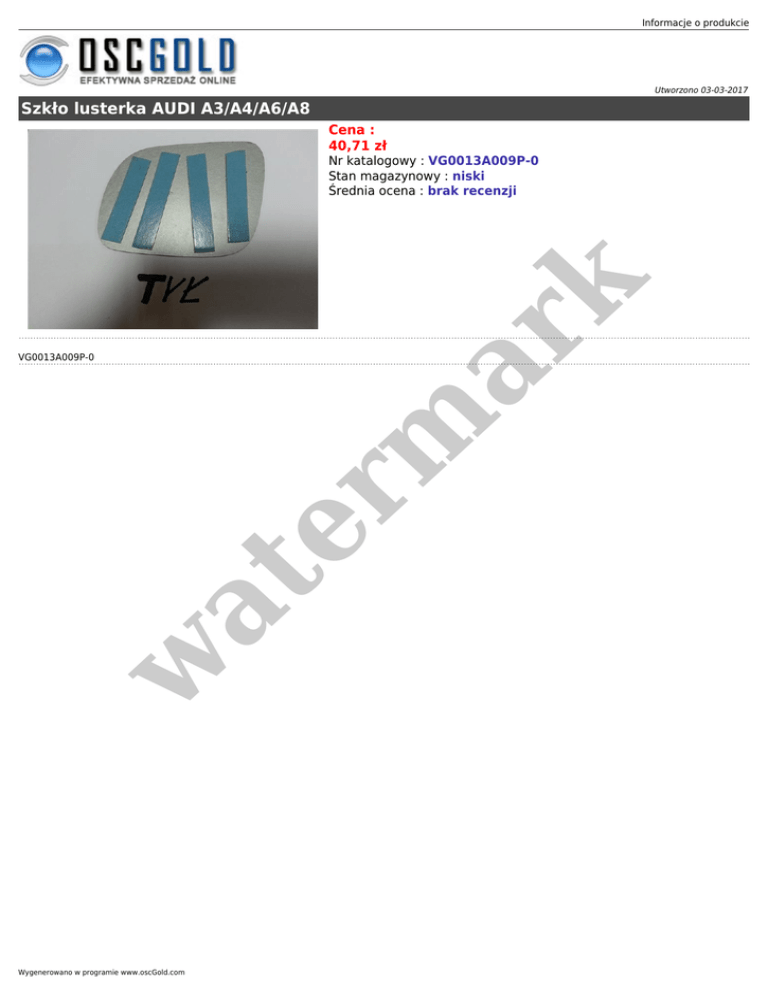 Informacje o produkcie Utworzono 03-03-2017 Szkło lusterka AUDI A3/A4/A6/A8 Cena : 40,71 zł er m ar k Nr katalogowy : VG0013A009P-0 Stan magazynowy : niski Średnia ocena : brak recenzji w at VG0013A009P-0 Wygenerowano w programie www.oscGold.com