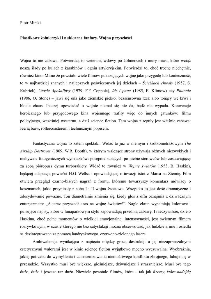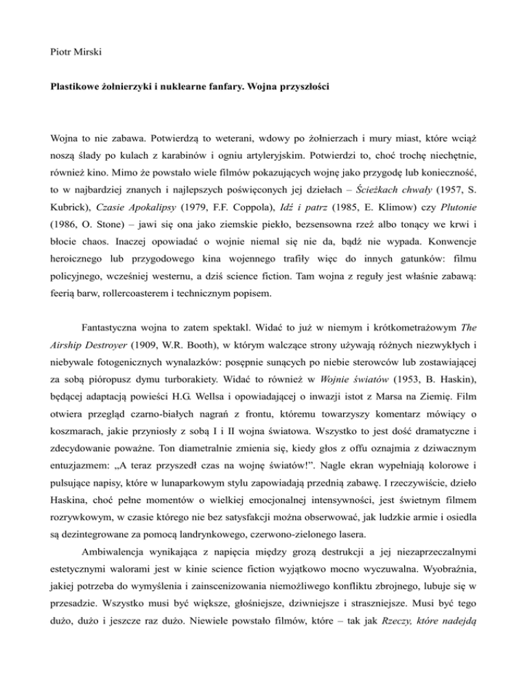 Piotr Mirski Plastikowe żołnierzyki i nuklearne fanfary. Wojna przyszłości Wojna to nie zabawa. Potwierdzą to weterani, wdowy po żołnierzach i mury miast, które wciąż noszą ślady po kulach z karabinów i ogniu artyleryjskim. Potwierdzi to, choć trochę niechętnie, również kino. Mimo że powstało wiele filmów pokazujących wojnę jako przygodę lub konieczność, to w najbardziej znanych i najlepszych poświęconych jej dziełach – Ścieżkach chwały (1957, S. Kubrick), Czasie Apokalipsy (1979, F.F. Coppola), Idź i patrz (1985, E. Klimow) czy Plutonie (1986, O. Stone) – jawi się ona jako ziemskie piekło, bezsensowna rzeź albo tonący we krwi i błocie chaos. Inaczej opowiadać o wojnie niemal się nie da, bądź nie wypada. Konwencje heroicznego lub przygodowego kina wojennego trafiły więc do innych gatunków: filmu policyjnego, wcześniej westernu, a dziś science fiction. Tam wojna z reguły jest właśnie zabawą: feerią barw, rollercoasterem i technicznym popisem. Fantastyczna wojna to zatem spektakl. Widać to już w niemym i krótkometrażowym The Airship Destroyer (1909, W.R. Booth), w którym walczące strony używają różnych niezwykłych i niebywale fotogenicznych wynalazków: posępnie sunących po niebie sterowców lub zostawiającej za sobą pióropusz dymu turborakiety. Widać to również w Wojnie światów (1953, B. Haskin), będącej adaptacją powieści H.G. Wellsa i opowiadającej o inwazji istot z Marsa na Ziemię. Film otwiera przegląd czarno-białych nagrań z frontu, któremu towarzyszy komentarz mówiący o koszmarach, jakie przyniosły z sobą I i II wojna światowa. Wszystko to jest dość dramatyczne i zdecydowanie poważne. Ton diametralnie zmienia się, kiedy głos z offu oznajmia z dziwacznym entuzjazmem: „A teraz przyszedł czas na wojnę światów!”. Nagle ekran wypełniają kolorowe i pulsujące napisy, które w lunaparkowym stylu zapowiadają przednią zabawę. I rzeczywiście, dzieło Haskina, choć pełne momentów o wielkiej emocjonalnej intensywności, jest świetnym filmem rozrywkowym, w czasie którego nie bez satysfakcji można obserwować, jak ludzkie armie i osiedla są dezintegrowane za pomocą landrynkowego, czerwono-zielonego lasera. Ambiwalencja wynikająca z napięcia między grozą destrukcji a jej niezaprzeczalnymi estetycznymi walorami jest w kinie science fiction wyjątkowo mocno wyczuwalna. Wyobraźnia, jakiej potrzeba do wymyślenia i zainscenizowania niemożliwego konfliktu zbrojnego, lubuje się w przesadzie. Wszystko musi być większe, głośniejsze, dziwniejsze i straszniejsze. Musi być tego dużo, dużo i jeszcze raz dużo. Niewiele powstało filmów, które – tak jak Rzeczy, które nadejdą (1936, W.C. Menzies) czy Koniec świata (2006, R. Kelly) – chętniej niż zmagania na froncie pokazują ich cywilne i społeczne zaplecze, to, co dzieje się ze zwykłymi ludźmi, kiedy muszą żyć w obliczu zagrożenia. Więcej jest za to dzieł, w których walka stanowi główną treść, cel i sens. Widowiska SF, w których znaczącą rolę odgrywa batalistyka, z czasem stały się jednym z flagowych produktów Fabryki Snów. Ich historia jest długa i naznaczona komercyjnymi sukcesami: od pierwszej trylogii Gwiezdnych wojen (1977–1983), przez Obcych – decydujące starcie (1986, J. Cameron) i Dzień Niepodległości (1996, R. Emmerich), po Avatara (2009, J. Cameron) i Transformers: Zemstę upadłych (2009, M. Bay). Dzieł epigońskich względem powyższych jest jeszcze więcej. Jeśliby ulec pokusie systematyzacji, można by wyróżnić kilka podgatunków wojennej fantastyki: militarne SF, kino o inwazji lub space operę, czyli wyższy poziom epiki, w której polem walki jest już nie dana planeta, tylko cała galaktyka. Ta różnorodność jest jednak dość myląca. Znacząca część wysokobudżetowej fantastyki to obrazy bliźniaczo do siebie podobne i do bólu schematyczne. Stosunkowo mało dziś kręci się filmów poświęconych współczesnym wojnom, a jeśli już się to robi, to albo nadaje się im oskarżycielski wydźwięk, tak jak w Green Zone (2010, P. Greengrass), w którym „ostatni sprawiedliwy” odkrywa, że wbrew oficjalnej wersji wydarzeń Saddam Husajn nie posiadał broni masowego rażenia, albo za wszelką cenę unika się jednoznacznej konkluzji, tak jak w dokumentującym żołnierską rutynę w Iraku The Hurt Locker. W pułapce wojny (2008, K. Bigelow) czy opowiadającym o żmudnym polowaniu na Osamę bin Ladena Wrogu numer jeden (2012, K. Bigelow). Chcąc pokazać wagę lub piękno walki, twórcy najczęściej uciekają w stronę zmitologizowanej, „bezpiecznej” II wojny światowej, czego przykład stanowią dobrotliwi Obrońcy skarbów (2014, G. Clooney) i postmodernistyczne Bękarty wojny (2009, Q. Tarantino). Zdecydowaną rzadkością są dzieła pokroju osadzonego w Afganistanie Ocalonego (2013, P. Berg), który bez żadnych rozterek i zahamowań portretuje służbę wojskową jako ekstremalny sport dla prawdziwych mężczyzn. Tymczasem we współczesnym SF wciąż można bez problemu znaleźć i kilkutonowy patos, i bohaterów o żelaznych kręgosłupach moralnych, i pochwałę śmierci w słusznej sprawie. Fantastyczny sztafaż pozwala zapomnieć o skompromitowanych wojnach i z powrotem zobaczyć w walce coś szlachetnego lub przynajmniej fajnego. Gdyby wygłoszony przez dowódcę z Pacific Rim (2013, G. del Toro) monolog o „odwoływaniu apokalipsy” dotyczył nie nadchodzącego starcia z potworami z innego wymiaru, tylko z siepaczami Husajna, brzmiałby pewnie niesmacznie. Gdyby w Inwazji: Bitwie o Los Angeles (2011, J. Liebesman) dziarscy żołnierze zabijali talibów zamiast scyborgizowanych kosmitów, natężenie proamerykańskiej propagandy osiągnęłoby masę krytyczną. Jeśli w SF pojawiają się nawet odwołania do współczesnych konfliktów, to stają się one podwalinami przypowiastek tak uniwersalnych, że pozbawionych prawdziwego tematyczne