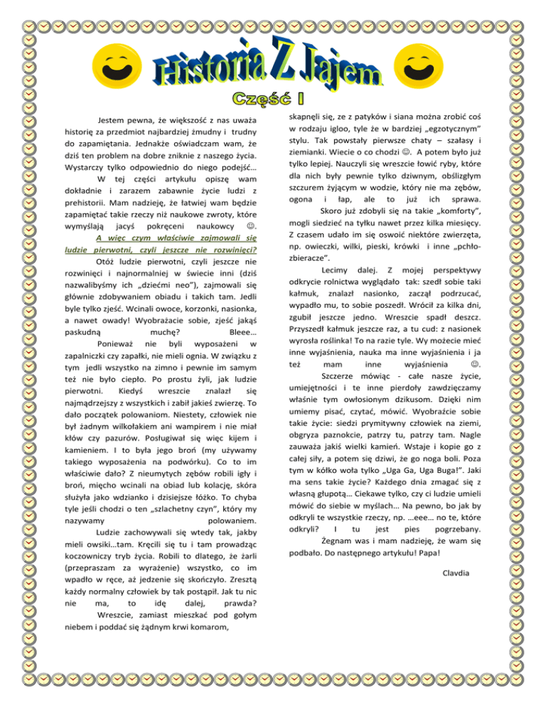 Jestem pewna, że większość z nas uważa historię za przedmiot najbardziej żmudny i trudny do zapamiętania. Jednakże oświadczam wam, że dziś ten problem na dobre zniknie z naszego życia. Wystarczy tylko odpowiednio do niego podejść… W tej części artykułu opiszę wam dokładnie i zarazem zabawnie życie ludzi z prehistorii. Mam nadzieję, że łatwiej wam będzie zapamiętać takie rzeczy niż naukowe zwroty, które wymyślają jacyś pokręceni naukowcy ☺. A więc czym właściwie zajmowali się ludzie pierwotni, czyli jeszcze nie rozwinięci? Otóż ludzie pierwotni, czyli jeszcze nie rozwinięci i najnormalniej w świecie inni (dziś nazwalibyśmy ich „dziećmi neo”), zajmowali się głównie zdobywaniem obiadu i takich tam. Jedli byle tylko zjeść. Wcinali owoce, korzonki, nasionka, a nawet owady! Wyobrażacie sobie, zjeść jakąś paskudną muchę? Bleee… Ponieważ nie byli wyposażeni w zapalniczki czy zapałki, nie mieli ognia. W związku z tym jedli wszystko na zimno i pewnie im samym też nie było ciepło. Po prostu żyli, jak ludzie pierwotni. Kiedyś wreszcie znalazł się najmądrzejszy z wszystkich i zabił jakieś zwierzę. To dało początek polowaniom. Niestety, człowiek nie był żadnym wilkołakiem ani wampirem i nie miał kłów czy pazurów. Posługiwał się więc kijem i kamieniem. I to była jego broń (my używamy takiego wyposażenia na podwórku). Co to im właściwie dało? Z nieumytych zębów robili igły i broń, mięcho wcinali na obiad lub kolację, skóra służyła jako wdzianko i dzisiejsze łóżko. To chyba tyle jeśli chodzi o ten „szlachetny czyn”, który my nazywamy polowaniem. Ludzie zachowywali się wtedy tak, jakby mieli owsiki…tam. Kręcili się tu i tam prowadząc koczowniczy tryb życia. Robili to dlatego, że żarli (przepraszam za wyrażenie) wszystko, co im wpadło w ręce, aż jedzenie się skończyło. Zresztą każdy normalny człowiek by tak postąpił. Jak tu nic nie ma, to idę dalej, prawda? Wreszcie, zamiast mieszkać pod gołym niebem i poddać się żądnym krwi komarom, skapnęli się, ze z patyków i siana można zrobić coś w rodzaju igloo, tyle że w bardziej „egzotycznym” stylu. Tak powstały pierwsze chaty – szałasy i ziemianki. Wiecie o co chodzi ☺. A potem było już tylko lepiej. Nauczyli się wreszcie łowić ryby, które dla nich były pewnie tylko dziwnym, obślizgłym szczurem żyjącym w wodzie, który nie ma zębów, ogona i łap, ale to już ich sprawa. Skoro już zdobyli się na takie „komforty”, mogli siedzieć na tyłku nawet przez kilka miesięcy. Z czasem udało im się oswoić niektóre zwierzęta, np. owieczki, wilki, pieski, krówki i inne „pchłozbieracze”. Lecimy dalej. Z mojej perspektywy odkrycie rolnictwa wyglądało tak: szedł sobie taki kałmuk, znalazł nasionko, zaczął podrzucać, wypadło mu, to sobie poszedł. Wrócił za kilka dni, zgubił jeszcze jedno. Wreszcie spadł deszcz. Przyszedł kałmuk jeszcze raz, a tu cud: z nasionek wyrosła roślinka! To na razie tyle. Wy możecie mieć inne wyjaśnienia, nauka ma inne wyjaśnienia i ja też mam inne wyjaśnienia ☺. Szczerze mówiąc - całe nasze życie, umiejętności i te inne pierdoły zawdzięczamy właśnie tym owłosionym dzikusom. Dzięki nim umiemy pisać, czytać, mówić. Wyobraźcie sobie takie życie: siedzi prymitywny człowiek na ziemi, obgryza paznokcie, patrzy tu, patrzy tam. Nagle zauważa jakiś wielki kamień. Wstaje i kopie go z całej siły, a potem się dziwi, że go noga boli. Poza tym w kółko woła tylko „Uga Ga, Uga Buga!”. Jaki ma sens takie życie? Każdego dnia zmagać się z własną głupotą… Ciekawe tylko, czy ci ludzie umieli mówić do siebie w myślach… Na pewno, bo jak by odkryli te wszystkie rzeczy, np. …eee… no te, które odkryli? I tu jest pies pogrzebany. Żegnam was i mam nadzieję, że wam się podbało. Do następnego artykułu! Papa! Clavdia