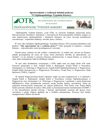 Sprawozdanie z realizacji działań podczas VI Ogólnopolskiego Tygodnia Kariery. Ogólnopolski Tydzień Kariery, czyli OTK, to coroczne działanie inicjowane przez Stowarzyszenia Doradców Szkolnych i Zawodowych Rzeczypospolitej Polskiej mające na celu inspirowanie ogólnopolskich i lokalnych inicjatyw na rzecz rozwoju poradnictwa zawodowego - wspierania edukacji, zawodu, pracy i kariery. W tym roku działania Ogólnopolskiego Tygodnia Kariery 2014 przeprowadzaliśmy pod hasłem: "Jak zaprzyjaźnić się z rynkiem pracy?" Choć przyjaźń to niełatwa i czasami bolesna ... zdecydowanie warto ją pielęgnować i rozwijać . Rynek pracy zmienia się tak szybko i dynamicznie, że trudno być zawsze na bieżąco, jednak przynajmniej od czasu do czasu warto poświęcić chwilkę na sprawdzenie „co słychać”, co się zmienia w naszym obszarze zainteresowań, w naszej branży, co warto po znać, jakie umiejętności bądź kwalifikacje zdobyć. W tym roku działaniami związanymi z OTK udało nam się objąć około 430 osób. Naszymi partnerami w byli: Zespół Szkół w Radziejach, Zespół Szkół w Pozezdrzu, Gimnazjum J.A. Helwinga w Węgorzewie, Zespół Szkół Ogólnokształcących w Węgorzewie, Zespół Szkół Zawodowych w Węgorzewie, Powiatowy Urząd Pracy w Węgorzewie, Klub Sportowy CWKS „Vęgoria”. W ramach Węgorzewskiej Kuźni Talentów udało się nam zorganizować w 4 szkołach ( Zespół Szkół w Radziejach, Zespół Szkół w Pozezdrzu, Liceum Ogólnokształcące w Węgorzewie oraz Gimnazjum J.A. Helwinga w Węgorzewie ) spotkania z panią Katarzyną Milinkiewicz, która przedstawiła uczniom swoją ścieżkę kariery zawodowej. Zaraz po zajęciach teoretycznych rozpoczęły się zajęcia praktyczne. Pani Kasia wraz Panią Martą Sauter porwały młodzież do tańca. Obie panie są licencjonowanymi instruktorami ZUMBY i w ten niecodzienny sposób mówiąc i tańcząc opowiedziały uczniom jak łączyć życie zawodowe z pasją. Zajęcia spotkały się z wielkim entuzjazmem. Wszyscy byli bardzo zaangażowani i dobrze się bawili. Węgorzewo to miasto szczególnie usytuowane i mające niezwykłe zasoby do uprawiania sportu. To daje duże możliwości rozwoju zawodowego, ale też i fizycznego. Czy ruch jest nam potrzebny? Jaką mamy kulturę spędzania wolnego czasu? Co zrobić kiedy dziecko ma trudności w nauce i chce kopać piłkę? Na te oraz inne pytania staraliśmy się odpowiedzieć podczas konferencji dotyczącej roli sportu w życiu dziecka. Głównymi prelegentkami były: dr Dominika Wilczyńska – psycholog sportu, Jolanta Rodzewicz – dyrektor PP-P, Marta Hruszka- oligofrenopedagog, doradca zawodowy. Szereg działań podjęły również szkoły. W Liceum Ogólnokształcącym Ogólnopolski Tydzień Kariery poprzedziły spotkania z młodzieżą zorganizowane przez Centrum Aktywizacji Zawodowej Powiatowego Urzędu Pracy. W spotkaniach, które miały miejsce 16 i 17 października, uczestniczyły klasy pierwsze i trzecie. Zaproponowany temat spotkań dla klas pierwszych to: „Wybór zawodu. Jak zaplanować karierę zawodową. Zawód przyszłości, gdzie szukać, jak zdobyć”. Klasom trzecim zaproponowano temat: „Usługi i instrumenty rynku pracy. Nowe formy wsparcia młodych osób bezrobotnych”. Zespół nauczycieli do spraw doradztwa zawodowego zaplanował i zorganizował szkolny konkurs „Kreatywne CV”. Prace wykonano w formie graficznej i cyfrowej. Szkolne jury wybrało najciekawsze prace i przyznało 3 główne nagrody oraz 3 wyróżnienia. Najlepszy okazał się film nakręcony przez uczniów klasy IA. Nagrody wręczono 23 października na spotkaniu w ramach Węgorzewskiej Kuźni Talentów. 26 października w Sali gimnastycznej ZSO w Węgorzewie odbył się Turniej Tenisa Stołowego o Puchar Dyrektora LO w Węgorzewie. Była to kolejna okazja do podzielenia się z innymi swoimi pasjami. W turnieju wzięli udział uczniowie szkół podstawowych, gimnazjów, szkół ponadgimnazjalnych oraz dorośli. Przy organizacji pomagali członkowie Szkolnego Koła Wolontariatu i wolontariusze z węgorzewskiego gimnazjum. W Zespole Szkół Zawodowych w Węgorzewie VI OTK przebiegało z dużą różnorodnością konkursów. Każdy mógł znaleźć coś dla siebie. Odbył się Szkolny Konkurs Handlowy o tytuł Mistrza Merchandisingu. O mistrzostwo w dziedzinie dekorowania i designu walczyło 13 drużyn dwuosobowych z Technikum w zawodzie handlowiec i Zasadniczej Szkoły Zawodowej w zawodzie sprzedawca. Zadaniem konkursowym było przygotowanie ekspozycji pod hasłem przewodnim JESIENNE TRENDY. Mechanicy i pasjonaci motoryzacji, którzy pomimo niekorzystnej pogody przybyli, by zaprezentować swoje pojazdy, oprócz pokazu umiejętności manewrowania pojazdem musieli wykazać się także wiedzą techniczną, rozwiązując zadania testowe. W konkursie „Mój pojazd – Moje hobby” wzięło udział 13 uczniów. Międzyszkolny Konkurs Poetycki dla Młodych Twórców cieszył się dużym powodzeniem (17 osób) Udział w nim wzięli uczniowie Gimnazjum w Węgorzewie, Gimnazjum w Budrach z siedzibą w Więckach, Gimnazjum w Radziejach oraz nasi uczniowie z ZSZ i Technikum. Natomiast podczas konkursu „My informatycy” - informatycy (5 drużyn po 2 osoby) poza wiedzą teoretyczną musieli wykazać się umiejętnością złożenia komputera oraz poprawnego skonfigurowania zabezpieczeń kont. W Zespole Szkół Zawodowych odbył się również konkurs na plakat pt.: "MÓJ ZAWÓD". W Gimnazjum J.A Helwinga w Węgorzewie zaplanowano podczas tegorocznego OTK następujące przedsięwzięcia: Zajęcia na temat – „Pracodawcy na naszym rynku pracy”. Zapoznano młodzież z lokalnym rynkiem pracy, analizą potencjalnych możliwości zatrudnienia, czynnikami, które regulują rynek we współczesnym świecie oraz co ma istotny wpływ na rozwój rynku pracy. Przedstawiono zawody deficytowe i nadwyżkowe na terenie Węgorzewa. Odbyły się również warsztaty: Ja – Ryne