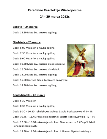 Parafialne Rekolekcje Wielkopostne 24 - 29 marca 2012r. Sobota – 24 marca Godz. 18.30 Msza św. z nauką ogólną; Niedziela – 25 marca Godz. 6.00 Msza św. z nauką ogólną; Godz. 7.30 Msza św. z nauką ogólną; Godz. 9.00 Msza św. z nauką ogólną; Godz. 10.30 Msza św. z nauką dla młodzieży; Godz. 12.00 Msza św. z nauką dla dzieci; Godz. 14.00 Msza św. z nauką ogólną; Godz. 15.00 Gorzkie Żale z kazaniem pasyjnym; Godz. 18.30 Msza św. z nauką ogólną; Poniedziałek – 26 marca Godz. 6.30 Msza św. Godz. 8.30 Msza św. z nauką ogólną; Godz. 9.30 – 10.30 rekolekcje szkolne: Szkoła Podstawowa kl. I – III; Godz. 10.45 – 11.45 rekolekcje szkolne: Szkoła Podstawowa kl. IV – VI; Godz. 12.00 – 13.00 rekolekcje szkolne: Gimnazjum nr 1 i Zespół Szkół Ponadgimnazjalnych; Godz. 13.30 – 14.30 rekolekcje szkolne: II Liceum Ogólnokształcące Godz. 17.00 Nowenna do Ducha św. przed bierzmowaniem; Godz. 18.30. Msza św. z nauką ogólną; Po Mszy św. nauka stanowa dla kobiet; Godz. 21.00 Apel Jasnogórski; Wtorek - 27 marca Godz. 6.30 Msza św. Godz. 7.00 Msza św. Godz. 8.30 Msza św. z nauką ogólną; Godz. 9.30 – 10.30 rekolekcje szkolne: Szkoła Podstawowa kl. I – III; Godz. 10.45 – 11.45 rekolekcje szkolne: Szkoła Podstawowa kl. IV – VI; Godz. 12.00 – 13.00 rekolekcje szkolne: Gimnazjum nr 1 i Zespół Szkół Ponadgimnazjalnych; Godz. 13.30 – 14.30 rekolekcje szkolne: II Liceum Ogólnokształcące Godz. 17.00 Nowenna do Ducha św. przed bierzmowaniem; Godz. 18.30. Msza św. z nauką ogólną; Po Mszy św. nauka stanowa dla mężczyzn; Godz. 21.00 Apel Jasnogórski; Środa – 28 marca Godz. 6.30 Msza św. Godz. 7.00 Msza św. Godz. 8.30 Msza św. z nauką ogólną; Godz. 9.30 – 10.30 rekolekcje szkolne: Szkoła Podstawowa kl. I – III; Godz. 10.45 – 11.45 rekolekcje szkolne: Szkoła Podstawowa kl. IV – VI; Godz. 12.00 – 13.00 rekolekcje szkolne: Gimnazjum nr 1 i Zespół Szkół Ponadgimnazjalnych; Godz. 13.30 – 14.30 rekolekcje szkolne: II Liceum Ogólnokształcące Godz. 16.00 Msza św. pod przewodnictwem Jego Ekscelencji Ks. Biskupa Diecezjalnego Jana Bernarda Szlagi z udzieleniem sakramentu bierzmowania; Godz. 18.30. Msza św. z nauką ogólną; Czwartek – 29 marca – dzień spowiedzi Godz. 6.30 Msza św. Godz. 7.00 Msza św. Godz. 8.30 Msza św. Godz. 13.45 Nabożeństwo pokutne; Godz. 14.00 – 16.00 Spowiedź św.; Godz. 16.15 Nabożeństwo pokutne; Godz. 16.30 – 19.00 Spowiedź św.; Godz. 18.30 Msza św.