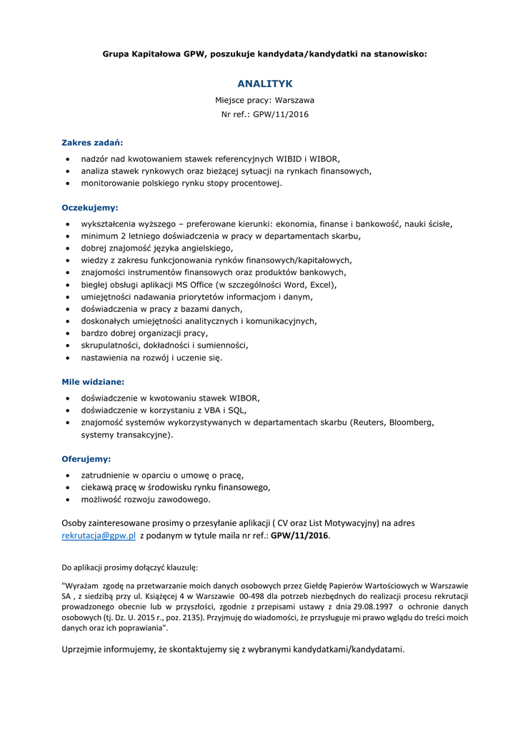 Grupa Kapitałowa GPW, poszukuje kandydata/kandydatki na stanowisko: ANALITYK Miejsce pracy: Warszawa Nr ref.: GPW/11/2016 Zakres zadań: nadzór nad kwotowaniem stawek referencyjnych WIBID i WIBOR, analiza stawek rynkowych oraz bieżącej sytuacji na rynkach finansowych, monitorowanie polskiego rynku stopy procentowej. Oczekujemy: wykształcenia wyższego – preferowane kierunki: ekonomia, finanse i bankowość, nauki ścisłe, minimum 2 letniego doświadczenia w pracy w departamentach skarbu, dobrej znajomość języka angielskiego, wiedzy z zakresu funkcjonowania rynków finansowych/kapitałowych, znajomości instrumentów finansowych oraz produktów bankowych, biegłej obsługi aplikacji MS Office (w szczególności Word, Excel), umiejętności nadawania priorytetów informacjom i danym, doświadczenia w pracy z bazami danych, doskonałych umiejętności analitycznych i komunikacyjnych, bardzo dobrej organizacji pracy, skrupulatności, dokładności i sumienności, nastawienia na rozwój i uczenie się. Mile widziane: doświadczenie w kwotowaniu stawek WIBOR, doświadczenie w korzystaniu z VBA i SQL, znajomość systemów wykorzystywanych w departamentach skarbu (Reuters, Bloomberg, systemy transakcyjne). Oferujemy: zatrudnienie w oparciu o umowę o pracę, ciekawą pracę w środowisku rynku finansowego, możliwość rozwoju zawodowego. Osoby zainteresowane prosimy o przesyłanie aplikacji ( CV oraz List Motywacyjny) na adres [email protected] z podanym w tytule maila nr ref.: GPW/11/2016. Do aplikacji prosimy dołączyć klauzulę: "Wyrażam zgodę na przetwarzanie moich danych osobowych przez Giełdę Papierów Wartościowych w Warszawie SA , z siedzibą przy ul. Książęcej 4 w Warszawie 00-498 dla potrzeb niezbędnych do realizacji procesu rekrutacji prowadzonego obecnie lub w przyszłości, zgodnie z przepisami ustawy z dnia 29.08.1997 o ochronie danych osobowych (tj. Dz. U. 2015 r., poz. 2135). Przyjmuję do wiadomości, że przysługuje mi prawo wglądu do treści moich danych oraz ich poprawiania". Uprzejmie informujemy, że skontaktujemy się z wybranymi kandydatkami/kandydatami.