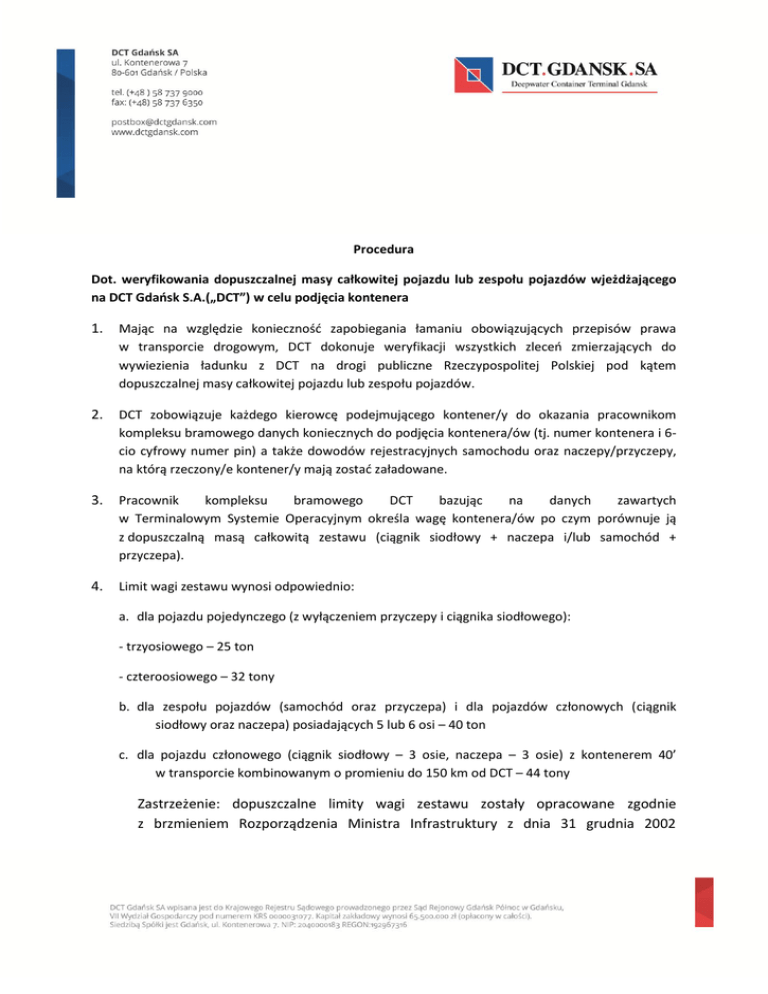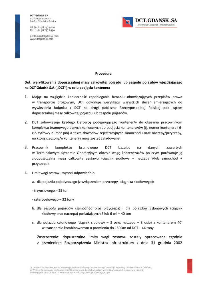 Procedura Dot. weryfikowania dopuszczalnej masy całkowitej pojazdu lub zespołu pojazdów wjeżdżającego na DCT Gdańsk S.A.(„DCT”) w celu podjęcia kontenera 1. Mając na względzie konieczność zapobiegania łamaniu obowiązujących przepisów prawa w transporcie drogowym, DCT dokonuje weryfikacji wszystkich zleceń zmierzających do wywiezienia ładunku z DCT na drogi publiczne Rzeczypospolitej Polskiej pod kątem dopuszczalnej masy całkowitej pojazdu lub zespołu pojazdów. 2. DCT zobowiązuje każdego kierowcę podejmującego kontener/y do okazania pracownikom kompleksu bramowego danych koniecznych do podjęcia kontenera/ów (tj. numer kontenera i 6cio cyfrowy numer pin) a także dowodów rejestracyjnych samochodu oraz naczepy/przyczepy, na którą rzeczony/e kontener/y mają zostać załadowane. 3. Pracownik kompleksu bramowego DCT bazując na danych zawartych w Terminalowym Systemie Operacyjnym określa wagę kontenera/ów po czym porównuje ją z dopuszczalną masą całkowitą zestawu (ciągnik siodłowy + naczepa i/lub samochód + przyczepa). 4. Limit wagi zestawu wynosi odpowiednio: a. dla pojazdu pojedynczego (z wyłączeniem przyczepy i ciągnika siodłowego): - trzyosiowego – 25 ton - czteroosiowego – 32 tony b. dla zespołu pojazdów (samochód oraz przyczepa) i dla pojazdów członowych (ciągnik siodłowy oraz naczepa) posiadających 5 lub 6 osi – 40 ton c. dla pojazdu członowego (ciągnik siodłowy – 3 osie, naczepa – 3 osie) z kontenerem 40’ w transporcie kombinowanym o promieniu do 150 km od DCT – 44 tony Zastrzeżenie: dopuszczalne limity wagi zestawu zostały opracowane zgodnie z brzmieniem Rozporządzenia Ministra Infrastruktury z dnia 31 grudnia 2002 w sprawie warunków technicznych pojazdów oraz zakresu ich niezbędnego wyposażenia. 5. W przypadku posiadania przez kierowcę zezwolenia na przejazd pojazdu nienormatywnego, kierowca ma obowiązek w momencie zgłoszenia się po podjęcie kontenera/ów okazać pracownikowi Pre-Gate DCT odpowiednie urzędowe zezwolenie zgodnie z ustawą Prawo o ruchu drogowym. 6. W przypadku podejmowania przez kierowcę kontenera 40’, którego waga powoduje, że dopuszczalna masa całkowita pojazdu członowego będzie między 40 a 44 tony, kierowca zobowiązany jest złożyć pisemne oświadczenie na jaką odległość kontener będzie transportowany (załącznik nr 1 do procedury). Brak takiej deklaracji lub informacja o planowanym przewozie na odległość o promieniu większym niż 150 km od terminalu będzie skutkowała niewydaniem kontenera. 7. Jeśli pracownik Pre-Gate DCT stwierdzi przekroczenie dopuszczalnej masy całkowitej środka transportu odmawia wydania kontenera/ów i rejestruje powyższy fakt w odpowiednim rejestrze. 8. W przypadku otrzymania od DCT odmowy wydania kontenera z uwagi na przekroczenie dopuszczalnej masy całkowitej pojazdu, kierowca zobowiązany jest do niezwłocznego powiadomienia swojego zleceniodawcy o zaistniałym fakcie. 9. Jeśli pracownik Pre-Gate DCT Gdańsk nie stwierdzi przekroczenia dopuszczalnej masy całkowitej środka transportu przystępuje do rejestracji transakcji w Terminalowym Systemie Operacyjnym. 10. W przypadku podejmowania przez kierowcę kontenera na naczepę obładowaną już jednym kontenerem, ale nie przeznaczonym do składowania na terminalu DCT Gdańsk (tzw. „tranzytowym”): a. pełnym – kierowca zobowiązany jest do przedstawienia dokumentu przewozowego (dokument celny, list przewozowy, CMR) zawierającego numer kontenera znajdującego się na pojeździe oraz jego wagę, lub b. pustym – każdy pusty kontener musi zostać otwarty i sprawdzony przez pracownika bramy pod kątem braku ładunku w kontenerze i możliwości fałszerstwa dokumentów przewozowych, pracownik DCT Gdańsk określi łączną wagę kontenerów przystępując do analizy dopuszczalnej masy całkowitej pojazdu i postępuje jak w opisanych wcześniej punktach 4-9. 11. W przypadku podejrzenia przez pracownika DCT możliwości fałszerstwa dokumentów przewozowych dot. kontenera „tranzytowego” zastrzega sobie możliwość wykonania ważenia pojazdu lub zestawu. Jeśli dopuszczalna masa całkowita pojazdu przekroczy dopuszczalne wartości określone w przepisach prawa, DCT odmówi wydania kontenera a klient zostanie obciążony opłatami za równowartość dwóch ważeń. 12. Procedura wchodzi w życie z dniem 16 września 2013 roku. 2 Załącznik nr 1 do Procedury weryfikowania dopuszczalnej masy całkowitej pojazdu lub zespołu pojazdów wjeżdżającego na DCT Gdańsk S.A Wzór Gdańsk, dnia ……………………………… Oświadczenie Kierowcy dot. transportu kombinowanego Oświadczam, iż transport następujących kontenerów: 1. ______________________________________; 2. ______________________________________; będzie spełniał warunki transportu kombinowanego zgodnie definicją zawartą w ustawie z dnia 6 września 2001 roku o transporcie drogowym. Podpis Kierowcy 3