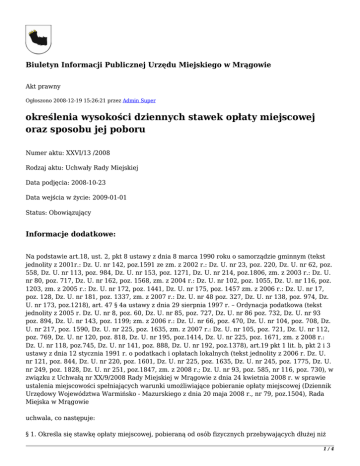 Biuletyn Informacji Publicznej Urzędu Miejskiego w Mrągowie Akt prawny Ogłoszono 2008-12-19 15:26:21 przez Admin Super określenia wysokości dziennych stawek opłaty miejscowej oraz sposobu jej poboru Numer aktu: XXVI/13 /2008 Rodzaj aktu: Uchwały Rady Miejskiej Data podjęcia: 2008-10-23 Data wejścia w życie: 2009-01-01 Status: Obowiązujący Informacje dodatkowe: Na podstawie art.18, ust. 2, pkt 8 ustawy z dnia 8 marca 1990 roku o samorządzie gminnym (tekst jednolity z 2001r.: Dz. U. nr 142, poz.1591 ze zm. z 2002 r.: Dz. U. nr 23, poz. 220, Dz. U. nr 62, poz. 558, Dz. U. nr 113, poz. 984, Dz. U. nr 153, poz. 1271, Dz. U. nr 214, poz.1806, zm. z 2003 r.: Dz. U. nr 80, poz. 717, Dz. U. nr 162, poz. 1568, zm. z 2004 r.: Dz. U. nr 102, poz. 1055, Dz. U. nr 116, poz. 1203, zm. z 2005 r.: Dz. U. nr 172, poz. 1441, Dz. U. nr 175, poz. 1457 zm. z 2006 r.: Dz. U. nr 17, poz. 128, Dz. U. nr 181, poz. 1337, zm. z 2007 r.: Dz. U. nr 48 poz. 327, Dz. U. nr 138, poz. 974, Dz. U. nr 173, poz.1218), art. 47 § 4a ustawy z dnia 29 sierpnia 1997 r. – Ordynacja podatkowa (tekst jednolity z 2005 r. Dz. U. nr 8, poz. 60, Dz. U. nr 85, poz. 727, Dz. U. nr 86 poz. 732, Dz. U. nr 93 poz. 894, Dz. U. nr 143, poz. 1199; zm. z 2006 r.: Dz. U. nr 66, poz. 470, Dz. U. nr 104, poz. 708, Dz. U. nr 217, poz. 1590, Dz. U. nr 225, poz. 1635, zm. z 2007 r.: Dz. U. nr 105, poz. 721, Dz. U. nr 112, poz. 769, Dz. U. nr 120, poz. 818, Dz. U. nr 195, poz.1414, Dz. U. nr 225, poz. 1671, zm. z 2008 r.: Dz. U. nr 118, poz.745, Dz. U. nr 141, poz. 888, Dz. U. nr 192, poz.1378), art.19 pkt 1 lit. b, pkt 2 i 3 ustawy z dnia 12 stycznia 1991 r. o podatkach i opłatach lokalnych (tekst jednolity z 2006 r. Dz. U. nr 121, poz. 844, Dz. U. nr 220, poz. 1601, Dz. U. nr 225, poz. 1635, Dz. U. nr 245, poz. 1775, Dz. U. nr 249, poz. 1828, Dz. U. nr 251, poz.1847, zm. z 2008 r.; Dz. U. nr 93, poz. 585, nr 116, poz. 730), w związku z Uchwałą nr XX/9/2008 Rady Miejskiej w Mrągowie z dnia 24 kwietnia 2008 r. w sprawie ustalenia miejscowości spełniających warunki umożliwiające pobieranie opłaty miejscowej (Dziennik Urzędowy Województwa Warmińsko - Mazurskiego z dnia 20 maja 2008 r., nr 79, poz.1504), Rada Miejska w Mrągowie uchwala, co następuje: § 1. Określa się stawkę opłaty miejscowej, pobieraną od osób fizycznych przebywających dłużej niż 1/4 dobę w celach turystycznych, wypoczynkowych, lub szkoleniowych w miejscowości Mrągowo, w wysokości 1,86 zł od osoby za każdy dzień pobytu. § 2. Określa się stawkę opłaty miejscowej pobieranej od młodzieży szkolnej i akademickiej, nie wymienionych w art. 17 ust. 2 pkt. 5 ustawy, w wysokości 0,93 zł. § 3. Obowiązek uiszczenia opłaty miejscowej powstaje z dniem przybycia do miasta Mrągowo. § 4. Osoby, podlegające opłacie miejscowej, zobowiązane są uiścić opłatę za każdy dzień pobytu: 1) osoby przebywające w ośrodkach wypoczynkowych, hotelach, pensjonatach, campingach, kwaterach prywatnych u osób wyznaczonych przez podmiot prowadzący obiekt wczasowy lub turystyczny. 2) pozostałe osoby, przebywające na terenie Miasta, w Urzędzie Miejskim. § 5. 1. Zarządza się pobór opłaty miejscowej w drodze inkasa: 2. Obowiązek inkasa opłaty miejscowej ustanawia się na osobach fizycznych i prawnych, które w swoich obiektach przyjmują osoby fizyczne przebywające czasowo w celach turystycznych, wypoczynkowych, lub szkoleniowych, zgodnie z załącznikiem nr 1 oraz na osobach prowadzących meldunki w zakresie ewidencji ludności w Urzędzie Miejskim w Mrągowie. 3. Inkasenci, na każdą pobraną kwotę opłaty miejscowej, wydają pokwitowanie według wzoru ustalonego w przepisach o rachunkowości budżetowej (nie dotyczy podmiotów korzystających ze specjalistycznego systemu informatycznego), 4. Pobrane kwoty opłaty miejscowej inkasent przekazuje na rachunek bankowy Urzędu Miejskiego w Mrągowie, lub wpłaca do kasy Urzędu Miejskiego w Mrągowie, do dnia 10-tego następującego po miesiącu, którego rozliczenie dotyczy i załącza kopie pokwitowań. 5. Ustala się wynagrodzenie dla inkasentów w wysokości 10 % pobranych opłat, płatne w terminie 14 dni po przedstawieniu rozliczenia. 6. Odpowiedzialność inkasenta regulują przepisy ustawy z dnia 29.08.1997 r. Ordynacja podatkowa (Dz. U. z 1997 r. nr 137, poz. 926 ze zm.). § 6. Wykonanie uchwały powierza się Burmistrzowi Miasta Mrągowo. § 7. Traci moc uchwała nr XXI/13/08, z dnia 29 maja 2008 r. Rady Miejskiej w Mrągowie w sprawie ustalenia wysokości dziennych stawek opłaty miejscowej (Dziennik Urzędowy Woj. WarmińskoMazurskiego z dnia 24 lipca 2008 r., nr 114, poz. 1914), oraz uchwała nr XXIII/4/08, z dnia 31 lipca 2008 r. Rady Miejskiej w Mrągowie w sprawie zmiany uchwały nr XXI/13/08 z dnia 29 maja 2008 r., w sprawie określenia wysokości dziennych stawek opłaty miejscowej oraz sposobu jej poboru (Dziennik Urzędowy Woj. Warmińsko-Mazurskiego z dnia 22 września 2008 r., nr 151, poz. 2220). § 8. Uchwała wchodzi w życie po upływie 14 dni od dnia ogłoszenia w Dzienniku Urzędowym Województwa Warmińsko-Mazurskiego. Przewodniczący Rady Miejskiej Zbigniew Lubowidzki 2/4 Załącznik nr 1 do uchwały nr XXVI/13/2008 r. Rady Miasta Mrągowo z dnia 23.10.2008 r. Wykaz inkasentów opłaty miejscowej : 1. Hotel Mercure Mrongovia Resort & Spa Mrągowo ul. Giżycka 6 2. Hotel Huszcza Maria i Stanisław Huszcza Mrągowo ul. Roosevelta 21 3. Hotel Panoramic-Oskar A.D.W.E.K. Bielscy Mrągowo ul.Jaszczurcza Góra 16/18/20 4. Hotel Mazuria Pro Jeks Sp zo.o. Mrągowo ul. Jaszczurcza Góra 28 5. Hotelux Solar Palace Lilia Nojmoła Mrągowo ul. Jaszczurcza Góra 24 6. Hotel TO TU- Jolanta Gerwat Mrągowo ul. Jaszczurcza Góra 26 7. Hotelik EVA – Ewa i Lech Najmoła Mrągowo ul. Jaszczurcza Góra 14 8. Hotel Mazury – Klub Wakacyjny Sp. zo.o. w Warszawie Mrągowo ul. Młynowa 51 9. Pensjonat Edyta - Teresa Piszczatowska Mrągowo ul. Laskowa 10 10. Rybaczówka - Zielony Domek i