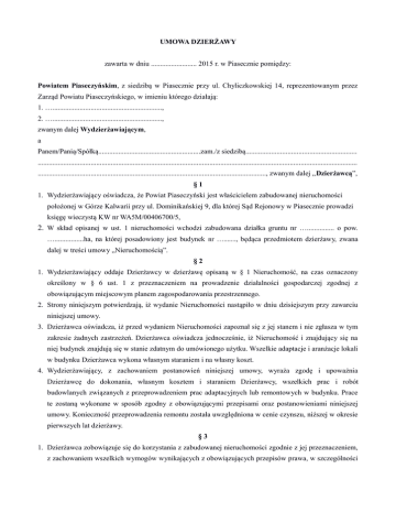 UMOWA DZIERŻAWY zawarta w dniu ......................... 2015 r. w Piasecznie pomiędzy: Powiatem Piaseczyńskim, z siedzibą w Piasecznie przy ul. Chyliczkowskiej 14, reprezentowanym przez Zarząd Powiatu Piaseczyńskiego, w imieniu którego działają: 1. …............................................................, 2. …............................................................, zwanym dalej Wydzierżawiającym, a Panem/Panią/Spółką........................................................zam./z siedzibą............................................................. ............................................................................................................................................................................... ............................................................................................................................., zwanym dalej „Dzierżawcą”, §1 1. Wydzierżawiający oświadcza, że Powiat Piaseczyński jest właścicielem zabudowanej nieruchomości położonej w Górze Kalwarii przy ul. Dominikańskiej 9, dla której Sąd Rejonowy w Piasecznie prowadzi księgę wieczystą KW nr WA5M/00406700/5, 2. W skład opisanej w ust. 1 nieruchomości wchodzi zabudowana działka gruntu nr …............... o pow. …................ha, na której posadowiony jest budynek nr …......., będąca przedmiotem dzierżawy, zwana dalej w treści umowy „Nieruchomością”. §2 1. Wydzierżawiający oddaje Dzierżawcy w dzierżawę opisaną w § 1 Nieruchomość, na czas oznaczony określony w § 6 ust. 1 z przeznaczeniem na prowadzenie działalności gospodarczej zgodnej z obowiązującym miejscowym planem zagospodarowania przestrzennego. 2. Strony niniejszym potwierdzają, iż wydanie Nieruchomości nastąpiło w dniu dzisiejszym przy zawarciu niniejszej umowy. 3. Dzierżawca oświadcza, iż przed wydaniem Nieruchomości zapoznał się z jej stanem i nie zgłasza w tym zakresie żadnych zastrzeżeń. Dzierżawca oświadcza jednocześnie, iż Nieruchomość i znajdujący się na niej budynek znajdują się w stanie zdatnym do umówionego użytku. Wszelkie adaptacje i aranżacje lokali w budynku Dzierżawca wykona własnym staraniem i na własny koszt. 4. Wydzierżawiający, z zachowaniem postanowień niniejszej umowy, wyraża zgodę i upoważnia Dzierżawcę do dokonania, własnym kosztem i staraniem Dzierżawcy, wszelkich prac i robót budowlanych związanych z przeprowadzeniem prac adaptacyjnych lub remontowych w budynku. Prace te zostaną wykonane w sposób zgodny z obowiązującymi przepisami oraz postanowieniami niniejszej umowy. Konieczność przeprowadzenia remontu została uwzględniona w cenie czynszu, niższej w okresie pierwszych lat dzierżawy. §3 1. Dzierżawca zobowiązuje się do korzystania z zabudowanej nieruchomości zgodnie z jej przeznaczeniem, z zachowaniem wszelkich wymogów wynikających z obowiązujących przepisów prawa, w szczególności z przepisów w zakresie ochrony przeciwpożarowej, bezpieczeństwa i higieny pracy oraz ochrony mienia a także ochrony konserwatorskiej. 2. Dzierżawca zobowiązany jest do utrzymania w okresie dzierżawy budynku i otoczenia w odpowiednim stanie technicznym, p.poż., sanitarnym i porządkowym na koszt własny. 3. Dzierżawca nie będzie przechowywał na terenie nieruchomości substancji, materiałów i urządzeń, których posiadanie jest zabronione. 4. Dzierżawca ma prawo do oddania Nieruchomości lub jej części w poddzierżawę, najem lub do bezpłatnego używania osobom trzecim wyłącznie po uprzednim uzyskaniu pisemnej zgody od Wydzierżawiającego. Strony zastrzegają przy tym, że Wydzierżawiający wyrazi zgodę na poddzierżawę lub najem całości lub części Nieruchomości w przypadku, gdy umowa będzie zawarta na okres nie dłuższy niż okres dzierżawy objętej niniejszą umową, a oddanie Nieruchomości osobie trzeciej w poddzierżawę lub najem nastąpi na cel zgodny z postanowieniami niniejszej umowy i z zachowaniem warunków niniejszej umowy. 5. Wydzierżawiający ma prawo dokonywania kontroli stanu przedmiotu najmu w terminach uzgodnionych z Dzierżawcą, a w braku uzgodnienia terminu za co najmniej 3-dniowym uprzedzeniem. 6. W okresie dzierżawy Dzierżawca zobowiązany jest we własnym zakresie i na własny koszt zagospodarować teren i dokonywać wszelkich remontów budynku i lokali w budynku. Strony precyzują, iż Wydzierżawiający w okresie dzierżawy nie jest zobowiązany do dokonywania żadnych remontów, napraw w jakimkolwiek zakresie. 7. Dzierżawca nie może, bez uprzedniej pisemnej zgody Wydzierżawiającego, dokonywać zmian w budynku sprzecznych z umową lub jego przeznaczeniem, w szczególności zmian mogących naruszyć konstrukcję budynku. 8. Dzierżawca oświadcza, że po zakończeniu stosunku dzierżawy nie będzie domagał się zwrotu od Wydzierżawiającego wartości nakładów poniesionych na Nieruchomość (w tym budynek). 9. Dzierżawca we własnym zakresie jest zobowiązany otrzymać zgody, opinie lub pozwolenia na prowadzenie swojej działalności, gdyby były wymagane przepisami prawa, w tym uzyskać zgodę na zmianę sposobu użytkowania lokalu/budynku oraz dostosowanie go we własnym zakresie do potrzeb prowadzenia działalności gospodarczej, bez prawa żądania zwrotu jakichkolwiek kosztów poniesionych z tego tytułu. 10.Dzierżawca zobowiązuje się w okresie dzierżawy ubezpieczyć budynek znajdujący się na Nieruchomości od ryzyka następstw wszelkich zdarzeń losowych (w zakresie „all risk”), przy czym beneficjentem (ubezpieczonym) z polisy (uprawnionym do wypłaty odszkodowania za zniszczenie lub uszkodzenie budynku) winien być każdorazowo Powiat Piaseczyński. Suma ubezpieczenia winna odpowiadać wartości rynkowej albo odtworzeniowej budynku, według wyboru Dzierżawcy. Dzierżawca zobowiązany jest każdorazowo przekazywać kopię polisy ubezpieczeniowej w terminie 14 dni od dnia zawarcia umowy ubezpiecz