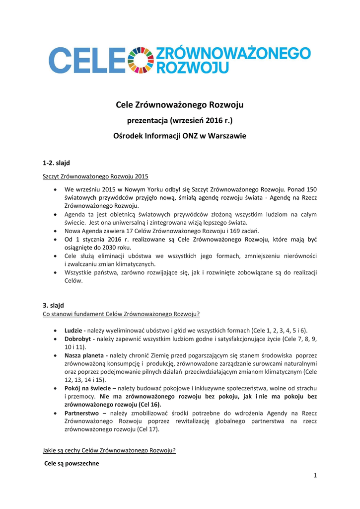 Cele Zrównoważonego Rozwoju prezentacja (wrzesień 2016 r.) Ośrodek Informacji ONZ w Warszawie 1-2. slajd Szczyt Zrównoważonego Rozwoju 2015 We wrześniu 2015 w Nowym Yorku odbył się Szczyt Zrównoważonego Rozwoju. Ponad 150 światowych przywódców przyjęło nową, śmiałą agendę rozwoju świata - Agendę na Rzecz Zrównoważonego Rozwoju. Agenda ta jest obietnicą światowych przywódców złożoną wszystkim ludziom na całym świecie. Jest ona uniwersalną i zintegrowana wizją lepszego świata. Nowa Agenda zawiera 17 Celów Zrównoważonego Rozwoju i 169 zadań. Od 1 stycznia 2016 r. realizowane są Cele Zrównoważonego Rozwoju, które mają być osiągnięte do 2030 roku. Cele służą eliminacji ubóstwa we wszystkich jego formach, zmniejszeniu nierówności i zwalczaniu zmian klimatycznych. Wszystkie państwa, zarówno rozwijające się, jak i rozwinięte zobowiązane są do realizacji Celów. 3. slajd Co stanowi fundament Celów Zrównoważonego Rozwoju? Ludzie - należy wyeliminować ubóstwo i głód we wszystkich formach (Cele 1, 2, 3, 4, 5 i 6). Dobrobyt - należy zapewnić wszystkim ludziom godne i satysfakcjonujące życie (Cele 7, 8, 9, 10 i 11). Nasza planeta - należy chronić Ziemię przed pogarszającym się stanem środowiska poprzez zrównoważoną konsumpcję i produkcję, zrównoważone zarządzanie surowcami naturalnymi oraz poprzez podejmowanie pilnych działań przeciwdziałającym zmianom klimatycznym (Cele 12, 13, 14 i 15). Pokój na świecie – należy budować pokojowe i inkluzywne społeczeństwa, wolne od strachu i przemocy. Nie ma zrównoważonego rozwoju bez pokoju, jak i nie ma pokoju bez zrównoważonego rozwoju (Cel 16). Partnerstwo – należy zmobilizować środki potrzebne do wdrożenia Agendy na Rzecz Zrównoważonego Rozwoju poprzez rewitalizację globalnego partnerstwa na rzecz zrównoważonego rozwoju (Cel 17). Jakie są cechy Celów Zrównoważonego Rozwoju? Cele są powszechne 1 Dotyczą wszystkich państw oraz wszystkich ludzi. Stajemy przed szansą poprawienia warunków życia ludzi na całym świecie. Cele odnoszą się zarówno do nierówności pomiędzy krajami, jak i do nierówności panujących wewnątrz państw. Biorą pod uwagę różne realia i możliwości. Każdy może się włączyć do działań - leży to w interesie każdego człowieka. Cele są niepodzielne Agenda na Rzecz Zrównoważonego Rozwoju inicjuje działania na wielu poziomach: rządów państw, przedstawicieli sektora prywatnego, społeczeństwa obywatelskiego, naukowców i wszystkich zainteresowanych. Cele Zrównoważonego Rozwoju są współzależne. Muszą być realizowane razem. Nie da się wyeliminować głodu bez zapewnienia pokoju i zwalczania zmian klimatycznych. Nie będzie równość płci, jeśli wszystkim nie zapewni się dostępu do edukacji. Cele mają przekształcić świat Istotnym elementem Celów Zrównoważonego Rozwoju jest to, by żadna osoba, żaden region, kraj czy grupa ludzi nie pozostała pominięta. To agenda dla planety - naszego wspólnego domu. To agenda wspólnego dobrobytu, pokoju i partnerstwa. 4. slajd Cel 1: Wyeliminować ubóstwo we wszystkich jego formach na całym świecie W regionach rozwijających się jedna na pięć osób żyje za mniej niż $1,25 dziennie. Kolejne miliony ludzi utrzymują się przy życiu za niewiele więcej niż $1,25 dziennie. Ponad 800 milionów ludzi żyje w skrajnym ubóstwie, tyle co łączna liczba mieszkańców Unii Europejskiej i Stanów Zjednoczonych. Bieda to coś więcej niż brak przychodów i środków potrzebnych do życia. Bieda to głód, niedożywienie, ograniczony dostęp do edukacji i podstawowych usług, dyskryminacja społeczna, wykluczenie oraz brak udziału w procesie decyzyjnym. 5. slajd Cel 2: Wyeliminować głód, osiągnąć bezpieczeństwo żywnościowe i lepsze odżywianie oraz promować zrównoważone rolnictwo Obecnie gleba, woda pitna, oceany, lasy oraz różnorodność biologiczna ulegają szybkiej degradacji. Co dziewiąta osoba na świecie cierpi z powodu głodu. A do 2050 roku liczba osób cierpiących na głód wzrośnie dwukrotnie. Dlatego też potrzebna jest głęboka zmiana globalnego systemu rolniczego i żywnościowego. Zmiany klimatyczne wywierają duży wpływ na środowisko, od którego zależy nasze życie. Zwiększają one ryzyko występowania katastrof naturalnych, takich jak susze czy powodzie. Wielu ludzi nie jest już w stanie dłużej utrzymywać się z pracy w rolnictwie i jest zmuszona migrować do miast w poszukiwaniu lepszego życia. 6. slajd Cel 3: Zapewnić wszystkim ludziom w każdym wieku zdrowe życie oraz promować dobrobyt Każdego dnia umiera o 17,000 mniej dzieci niż w roku 1990. Jednak nadal co roku ponad 6 milionów dzieci umiera przed ukończeniem piątego roku życia. 2 Zrobiono duży krok do przodu jeśli chodzi o wydłużenie średniej oczekiwanej długości życia i ograniczenie najczęstszych przyczyn zagrażających życiu dzieci i matek. Znaczny postęp uczyniono w zakresie zwiększenia dostępu do czystej wody i odpowiednich warunków sanitarnych, zmniejszenia zachorowań na malarię, gruźlicę, polio oraz rozprzestrzeniania się zakażeń HIV/AIDS. Jednakże należy znacznie zwiększyć wysiłki na rzecz całkowitej eliminacji wielu chorób i rozwiązania licznych problemów w obszarze zdrowia, zarówno tych istniejących od dawna, jak i tych nowo powstających. 7. slajd Cel 4: Zapewnić wszystkim edukację wysokiej jakości oraz promować uczenie się przez całe życie Co drugie dziecko nie chodzi do szkoły na terenach objętych konfliktami zbrojnymi. Ponad 750 milionów ludzi to analfabeci. To tak jakby mieszkańcy całej Europy nie umieli czytać i pisać. Wysokiej jakości edukacja stanowi podstawę dla polepszenia życia ludzi i zrównoważonego rozwoju. Należy podjąć dalsze wysiłki na rzecz zrealizowania Celu w zakresie powszechnej edukacji. Na przykład, mimo , iż w skali globalnej osiągnięto równ