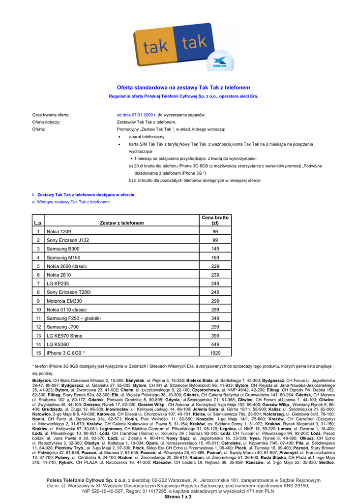 Oferta standardowa na zestawy Tak Tak z telefonem Regulamin oferty Polskiej Telefonii Cyfrowej Sp. z o.o., operatora sieci Era. Czas trwania oferty: od dnia 07.01.2009 r. do wyczerpania zapasów. Oferta dotyczy: Zestawów Tak Tak z telefonem. Oferta: Promocyjny „Zestaw Tak Tak ”, w skład, którego wchodzą: • aparat telefoniczny, • karta SIM Tak Tak z taryfą Nowy Tak Tak, z ważnością konta Tak Tak na 2 miesiące na połączenia wychodzące + 1 miesiąc na połączenia przychodzące, z kwotą do wykorzystania: a) 20 zł brutto dla telefonu iPhone 3G 8GB (z możliwością skorzystania z warunków promocji „Podwójne doładowanie z telefonem iPhone 3G ”) b) 5 zł brutto dla pozostałych telefonów dostępnych w niniejszej ofercie I. Zestawy Tak Tak z telefonem dostępne w ofercie: a. Wiodące zestawy Tak Tak z telefonem: L.p. Zestaw z telefonem Cena brutto (zł) 1 Nokia 1209 99 2 Sony Ericsson J132 99 3 Samsung B300 149 4 Samsung M150 169 5 Nokia 2600 classic 229 6 Nokia 2610 239 7 LG KP235 249 8 Sony Ericsson T280i 249 9 Motorola EM330 299 10 Nokia 3110 classic 299 11 Samsung F250 + głośniki 349 12 Samsung J700 299 13 LG KE970 Shine 399 14 LG KS360 449 15 iPhone 3 G 8GB * 1929 * telefon iPhone 3G 8GB dostępny jest wyłącznie w Salonach i Sklepach Własnych Era, autoryzowanych do sprzedaży tego produktu, których pełna lista znajduje się poniżej: Białystok, CH Biała Czesława Miłosza 2, 15-265; Białystok, ul. Piękna 5, 15-282; Bielsko Biała, ul. Barlickiego 7, 43-300; Bydgoszcz, CH Focus ul. Jagiellońska 39-47, 80-097; Bydgoszcz, ul. Gdańska 27, 85-005; Bytom, CH M1 ul. Strzelców Bytomskich 96, 41-933; Bytom, CH Plejada ul. Jana Nowaka-Jeziorańskiego 25, 41-923; Bytom, ul. Dworcowa 23, 41-902; Chełm, ul. Łuczkowskiego 9, 22-100; Częstochowa, al. NMP 40/42, 42-200; Elbląg, CH Ogrody Płk. Dąbka 152, 82-300; Elbląg, Stary Rynek 52a, 82-300; Ełk, ul. Wojska Polskiego 38, 19-300; Gdańsk, CH Galeria Bałtycka ul.Grunwaldzka 141, 80-264; Gdańsk, CH Morena ul. Shuberta 102 a, 80-172; Gdańsk, Podwale Grodzkie 5, 80-895; Gdynia, ul.Świętojańska 71, 81-388; Gliwice, CH Forum ul.Lipowa 1, 44-100; Gliwice, ul. Zwycięstwa 45, 44-100; Gniezno, Rynek 17, 62-200; Gorzów Wlkp., CH Askana ul. Konstytucji 3-go Maja 102, 66-400; Gorzów Wlkp., Wełniany Rynek 5, 66400; Grudziądz, ul. Długa 12, 86-300; Inowrocław, ul. Królowej Jadwigi 14, 88-100; Jelenia Góra, ul. Górna 10/11, 58-500; Kalisz, ul. Śródmiejska 21, 62-800; Katowice, 3-go Maja 6-8, 40-098; Katowice, CH Silesia ul. Chorzowska 107, 40-101; Kielce, ul. Sienkiewicza 78a, 25-501; Kołobrzeg, ul. Giełdowa 8c/3, 78-100; Konin, CH Ferio ul. Ogrodowa 31a, 62-571; Konin, Plac Wolności 11, 62-500; Koszalin, 1-go Maja 14/1, 75-800; Kraków, CH Carrefour (Czyżyny) ul. Medweckiego 2, 31-870; Kraków, CH Galeria Krakowska ul. Pawia 5, 31-154; Kraków, os. Szklane Domy 1, 31-972; Kraków, Rynek Kleparski 9, 31-150; Kraków, ul. Królewska 67, 30-081; Legionowo, CH Błękitne Centrum ul. Piłsudskiego 31, 05-120; Legnica, ul. NMP 18, 59-220; Łomża, ul .Dworna 1, 18-400; Łódź, al. Piłsudskiego 10, 90-051; Łódź, CH Carrefour (Górna) ul. Kolumny 36 ( Górna), 93-342; Łódź, CH Tulipan ul. Piłsudskiego 94, 92-202; Łódź, Pasaż Łódzki al. Jana Pawła II 30, 93-570; Łódź, ul. Zielona 4, 90-414; Nowy Sącz, ul. Jagiellońska 18, 33-300; Nysa, Rynek 8, 48-300; Olkusz, CH Echo ul. Rabsztyńska 2, 32-300; Olsztyn, ul. Kołłątaja 1, 10-034; Opole, ul. Koraszewskiego 15, 45-011; Ostrołęka, ul. Kopernika 7/45, 07-400; Piła, ul. Śródmiejska 11, 64-920; Piotrków Tryb., al. 3-go Maja 2, 97-300; Płock, Sklep Era CH Echo ul.Przemysłowa 1, 09-400; Płock, ul. Tumska 16, 09-400; Poznań, Stary Browar ul. Półwiejska 42, 61-888; Poznań, ul. Murawa 2, 61-655; Poznań, ul. Półwiejska 26, 61-888; Poznań, ul. Święty Marcin 40, 61-807; Przemyśl, ul. Franciszkańska 12, 37-700; Puławy, ul. Centralna 9, 24-100; Radom, ul. Żeromskiego 20, 26-610; Radom, ul. Żeromskiego 51, 26-600; Ruda Śląska, CH Plaza ul.1 -ego Maja 310, 41-710; Rybnik, CH PLAZA ul. Raciborska 16, 44-200; Rzeszów, CH Leclerc Ul. Rejtana 69, 35-959; Rzeszów, ul. 3-go Maja 22, 35-030; Siedlce, Polska Telefonia Cyfrowa Sp. z o.o. z siedzibą: 02-222 Warszawa, Al. Jerozolimskie 181, zarejestrowana w Sądzie Rejonowym dla m. st. Warszawy w XII Wydziale Gospodarczym Krajowego Rejestru Sądowego, pod numerem rejestrowym KRS 29159, NIP 526-10-40-567, Regon: 011417295, o kapitale zakładowym w wysokości 471 mln PLN Strona 1 z 3 ul. Piłsudskiego 7, 08-100; Słupsk, ul. Wojska Polskiego 23, 76-200; Sosnowiec, ul. Modrzejowska 32 a, 41-200; Stalowa Wola, ul. Okulickiego 11, 37-450; Stargard Szczeciński, ul Wyszyńskiego 16, 73-110; Suwałki, ul. Noniewicza 79 c, 16-400; Szczecin, al. Papieża Jana Pawła II 3/4, 70-413; Szczecin, al. Wojska Polskiego 14, 70-470; Szczecin, CH Ster ul. Ku Słońcu 67, 70-047; Szczecin, CH Turzyn ul. Boh. Warszawy 42, 70-342; Tarnów, ul. Lwowska 2, 33-100;Tczew, ul. J.Dąbrowskiego 22, 83-100; Toruń, CH Bielawy Ul Olsztyńska 8, 87-100; Toruń, Rynek Staromiejski 22, 87-100; Wałbrzych, ul. Gdańska 10, 58-300; Warszawa, al. Jerozolimskie 181 (OOP), 02-222; Warszawa, al. KEN 98, 02-722; Warszawa, CH Arkadia al. Jana Pawła II 82, 00-175; Warszawa, CH Bemowo ul. Powstańców Śląskich 126, 01-466; Warszawa, CH Galeria Mokotów ul. Wołoska 12, 02-675; Warszawa, CH Promenada ul. Ostrobramska 75c, 04-175; Warszawa, CH Reduta al. Jerozolimskie148, 03-326; Warszawa, CH Skorosze ul. Gen. Felicjana Sławoja-Składkowskiego 4, 02-495; Warszawa, CH Targówek ul. Głębocka 15, 03-287; Warszawa, CH Tesco ul. Połczyńska 121-125, 01-303; Warszawa, CH Wileńska ul. Targowa 72, 03-734; Warszawa, CH Wola Park ul. Górczewska 124, 01-460; Warszawa, CH Złote Tarasy ul. Złota 59, 00-120; Warszawa, Pl. Bankowy 2, 00-095; Warszawa, ul. Bora-Komorowskiego 37, 03-982; Warszawa, ul. Pańska 79, 00-837; Warszawa, ul