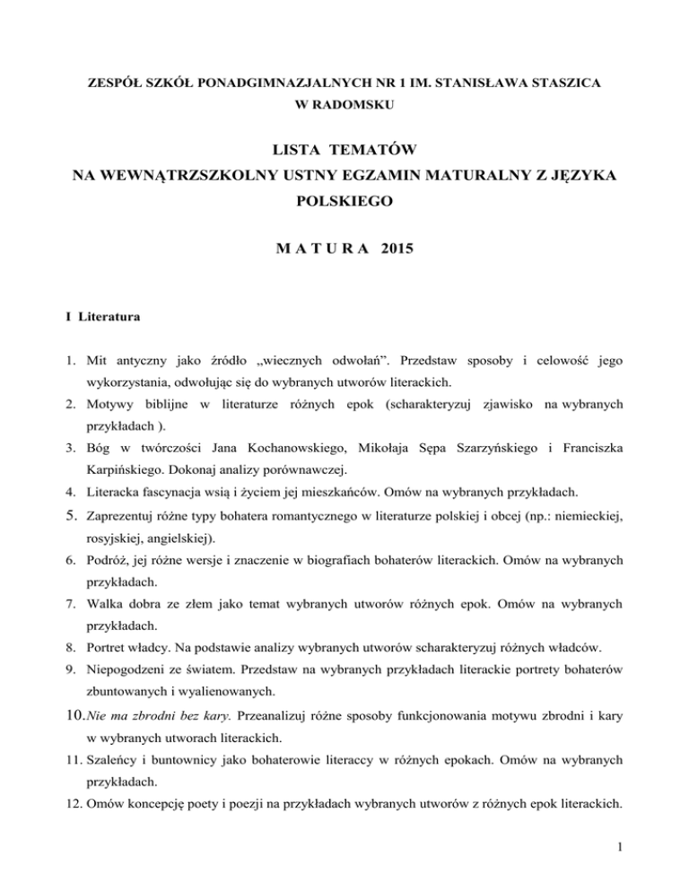 ZESPÓŁ SZKÓŁ PONADGIMNAZJALNYCH NR 1 IM. STANISŁAWA STASZICA W RADOMSKU LISTA TEMATÓW NA WEWNĄTRZSZKOLNY USTNY EGZAMIN MATURALNY Z JĘZYKA POLSKIEGO M A T U R A 2015 I Literatura 1. Mit antyczny jako źródło „wiecznych odwołań”. Przedstaw sposoby i celowość jego wykorzystania, odwołując się do wybranych utworów literackich. 2. Motywy biblijne w literaturze różnych epok (scharakteryzuj zjawisko na wybranych przykładach ). 3. Bóg w twórczości Jana Kochanowskiego, Mikołaja Sępa Szarzyńskiego i Franciszka Karpińskiego. Dokonaj analizy porównawczej. 4. Literacka fascynacja wsią i życiem jej mieszkańców. Omów na wybranych przykładach. 5. Zaprezentuj różne typy bohatera romantycznego w literaturze polskiej i obcej (np.: niemieckiej, rosyjskiej, angielskiej). 6. Podróż, jej różne wersje i znaczenie w biografiach bohaterów literackich. Omów na wybranych przykładach. 7. Walka dobra ze złem jako temat wybranych utworów różnych epok. Omów na wybranych przykładach. 8. Portret władcy. Na podstawie analizy wybranych utworów scharakteryzuj różnych władców. 9. Niepogodzeni ze światem. Przedstaw na wybranych przykładach literackie portrety bohaterów zbuntowanych i wyalienowanych. 10. Nie ma zbrodni bez kary. Przeanalizuj różne sposoby funkcjonowania motywu zbrodni i kary w wybranych utworach literackich. 11. Szaleńcy i buntownicy jako bohaterowie literaccy w różnych epokach. Omów na wybranych przykładach. 12. Omów koncepcję poety i poezji na przykładach wybranych utworów z różnych epok literackich. 1 13. Na wybranych przykładach literackich omów powody, dla których twórcy współcześni powracają do filozofii czasów starożytnych. 14. Scharakteryzuj postawę człowieka cierpiącego na przykładach bohaterów wybranych dzieł literackich. 15. Na przykładach wybranych utworów literatury średniowiecznej oraz barokowej przedstaw i omów sposób funkcjonowania motywu vanitas (marności). 16. Wyobrażenia człowieka o Bogu. Scharakteryzuj odczucia i przeżycia towarzyszące ludziom wierzącym na przykładzie postaci z wybranych utworów poetyckich. 17. Portret ojca w literaturze. Omów na przykładach wybranych utworów. 18. Relacje między rodzeństwem w literaturze. Omów na wybranych przykładach. 19. Przedstaw motyw gór w wybranych utworach literatury różnych epok. 20. Dekalog czy antydekalog? Przedstaw system wartości bohaterów literatury wojny i okupacji (na wybranych przykładach literackich). 21. Nauczyciele, uczniowie, szkoła – przedstaw na przykładach utworów z różnych epok. 22. Literatura dla młodzieży – kiedyś i obecnie. Omów na wybranych przykładach. 23. Antysemityzm i holokaust w literaturze polskiej. Omów temat, odwołując się do dowolnie wybranych utworów. 24. Portrety Żydów w literaturze polskiej. Omów na wybranych przykładach. 25. Portrety kobiet w literaturze polskiej i obcej. Omów na wybranych przykładach. 26. Dwór i obyczajowość szlachecka w literaturze polskiej. Omów na wybranych przykładach. 27. Literackie portrety dzieci i młodzieży. Omów na wybranych przykładach. 28. Problemy wieku dojrzewania bohaterów literackich. Omów na dowolnie wybranych przykładach. 29. Dziecko w poezji polskiej. Omów na wybranych przykładach. 30. Rola tytułu i motta w utworze literackim (przedstaw na wybranych przykładach). 31. Polacy w satyrze i karykaturze literackiej. Przedstaw sposoby kreowania portretów i ich funkcje. 32. Metamorfoza bohatera i jej sens w literaturze. Omów na przykładach wybranych utworów. 33. Biografia jako klucz do odczytania twórczości wybranego pisarza (np. J. Kochanowskiego, A. Mickiewicza, J. Słowackiego). Omów na wybranym przykładzie. 34. Przedstaw kreacje bohaterów, którzy doświadczyli okrucieństw II wojny i próbują odbudować świat wartości. 35. Literackie świadectwo pobytu w łagrach i lagrach. Omów na wybranych przykładach. 36. Obrzędy i obyczaje ludowe w literaturze. Omów na wybranych przykładach. 2 37. Literatura a polityka. Na wybranych przykładach omów, w jaki sposób pisarze reagowali na bieżące wydarzenia. 38. Polska – ale jaka? Omów wizje wymarzonej ojczyzny w wybranych utworach literackich. 39. Bezbronność, tchórzostwo, męstwo.... Różne postawy człowieka wobec zła istniejącego w świecie (przedstaw na wybranych przykładach literackich). 40. „Sztuka dla sztuki” czy sztuka w służbie idei, człowieka, narodu? Przedstaw opinię na temat roli i celu sztuki, odwołując się do wybranych dzieł literatury XIX i XX wieku. 41. Portrety psychologiczne kobiet w literaturze polskiej i/lub obcej – odwołaj się do wybranych przykładów literackich. 42. Motyw przyjaźni w literaturze polskiej i obcej (przedstaw na wybranych przykładach literackich). 43. Krytyka totalitaryzmu we współczesnej literaturze polskiej i obcej. Przedstaw problem na wybranych przykładach literackich. 44. Samotność bohatera literackiego. Przedstaw przyczyny i skutki problemu, odwołując się do wybranych przykładów literackich. 45. Koncepcje tragizmu i ich wyraz w teatrze antycznym, szekspirowskim i romantycznym. Przedstaw problem na przykładzie wybranych dzieł literackich. 46. Twój region w polskiej geografii życia literackiego i kulturalnego (zjawiska, grupy, postaci). Przywołaj wybrane przykłady i uzasadnij wybór. 47. Monolog – sposób na wyrażenie siebie. Uzasadnij tezę na przykładach wybranych utworów. 48. Pieniądze i ich siła. Omów na wybranych przykładach. 49. Obraz domu rodzinnego. Omów na wybranych przykładach. 50. Polskie hymny – utwory o narodzie i jego tożsamości. Omów na wybranych przykładach. 51. Literackie wizerunki diabła. Omów na wybranych przykładach. 52. Kobiety w twórczości pisarzy romantycznych. Omów na wybranych przykładach. 53. Niezwykły świat ballad. Omów temat, odwołując się do przykładów z różnych epok literackich. 54. Kresy w literaturze XIX i XX wieku. Omów n