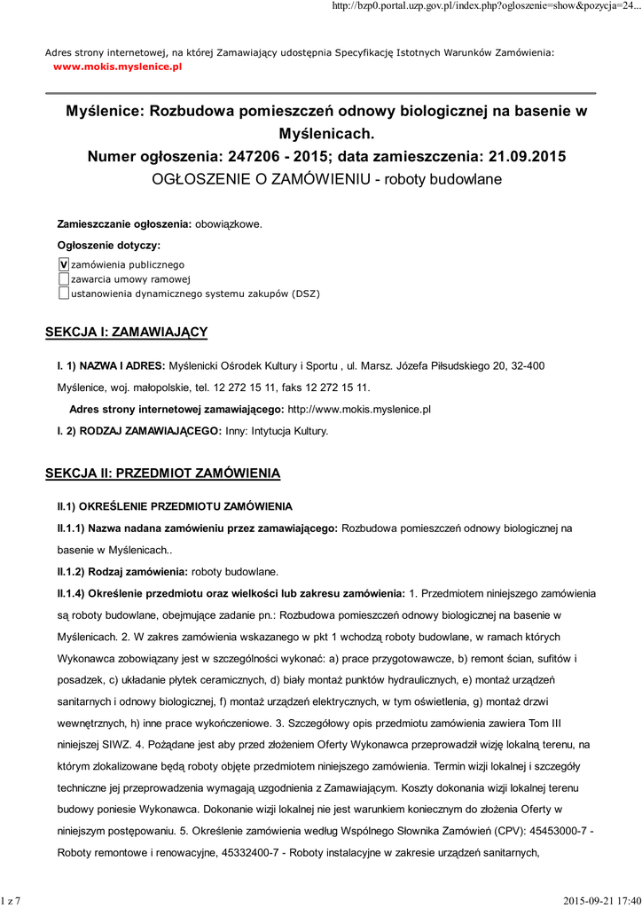 1z7 http://bzp0.portal.uzp.gov.pl/index.php?ogloszenie=show&pozycja=24... Adres strony internetowej, na której Zamawiający udostępnia Specyfikację Istotnych Warunków Zamówienia: www.mokis.myslenice.pl Myślenice: Rozbudowa pomieszczeń odnowy biologicznej na basenie w Myślenicach. Numer ogłoszenia: 247206 - 2015; data zamieszczenia: 21.09.2015 OGŁOSZENIE O ZAMÓWIENIU - roboty budowlane Zamieszczanie ogłoszenia: obowiązkowe. Ogłoszenie dotyczy: V zamówienia publicznego zawarcia umowy ramowej ustanowienia dynamicznego systemu zakupów (DSZ) SEKCJA I: ZAMAWIAJĄCY I. 1) NAZWA I ADRES: Myślenicki Ośrodek Kultury i Sportu , ul. Marsz. Józefa Piłsudskiego 20, 32-400 Myślenice, woj. małopolskie, tel. 12 272 15 11, faks 12 272 15 11. Adres strony internetowej zamawiającego: http://www.mokis.myslenice.pl I. 2) RODZAJ ZAMAWIAJĄCEGO: Inny: Intytucja Kultury. SEKCJA II: PRZEDMIOT ZAMÓWIENIA II.1) OKREŚLENIE PRZEDMIOTU ZAMÓWIENIA II.1.1) Nazwa nadana zamówieniu przez zamawiającego: Rozbudowa pomieszczeń odnowy biologicznej na basenie w Myślenicach.. II.1.2) Rodzaj zamówienia: roboty budowlane. II.1.4) Określenie przedmiotu oraz wielkości lub zakresu zamówienia: 1. Przedmiotem niniejszego zamówienia są roboty budowlane, obejmujące zadanie pn.: Rozbudowa pomieszczeń odnowy biologicznej na basenie w Myślenicach. 2. W zakres zamówienia wskazanego w pkt 1 wchodzą roboty budowlane, w ramach których Wykonawca zobowiązany jest w szczególności wykonać: a) prace przygotowawcze, b) remont ścian, sufitów i posadzek, c) układanie płytek ceramicznych, d) biały montaż punktów hydraulicznych, e) montaż urządzeń sanitarnych i odnowy biologicznej, f) montaż urządzeń elektrycznych, w tym oświetlenia, g) montaż drzwi wewnętrznych, h) inne prace wykończeniowe. 3. Szczegółowy opis przedmiotu zamówienia zawiera Tom III niniejszej SIWZ. 4. Pożądane jest aby przed złożeniem Oferty Wykonawca przeprowadził wizję lokalną terenu, na którym zlokalizowane będą roboty objęte przedmiotem niniejszego zamówienia. Termin wizji lokalnej i szczegóły techniczne jej przeprowadzenia wymagają uzgodnienia z Zamawiającym. Koszty dokonania wizji lokalnej terenu budowy poniesie Wykonawca. Dokonanie wizji lokalnej nie jest warunkiem koniecznym do złożenia Oferty w niniejszym postępowaniu. 5. Określenie zamówienia według Wspólnego Słownika Zamówień (CPV): 45453000-7 Roboty remontowe i renowacyjne, 45332400-7 - Roboty instalacyjne w zakresie urządzeń sanitarnych, 2015-09-21 17:40 2z7 http://bzp0.portal.uzp.gov.pl/index.php?ogloszenie=show&pozycja=24... 45421131-1 - Instalowanie drzwi, 33150000-6 - Urządzenia do radioterapii, mechanoterapii, elektroterapii i fizykoterapii. 6. Roboty budowlane stanowiące przedmiot niniejszego zamówienia należy wykonać zgodnie z: a) Dokumentacją projektową, b) przedmiarem robót, c) zasadami sztuki budowlanej, współczesnej wiedzy technicznej oraz obowiązującymi w tym zakresie przepisami, normami i standardami. 7. Zamawiający zastrzega, iż w trakcie realizacji niniejszego zamówienia Wykonawca zobowiązany będzie: 1) pokrywać koszty pobieranych mediów (woda, energia elektryczna, ogrzewanie, itp.) zużytych przy wykonywaniu robót; 2) zabezpieczyć i oznakować teren budowy przez cały czas trwania realizacji zadania, ze szczególnym uwzględnieniem specyfiki remontowanego obiektu oraz ponosić pełną odpowiedzialność za teren budowy od chwili przejęcia terenu budowy, a po zakończeniu robót zewnętrznych uporządkować teren; 3) zapewnić na własny koszt i we własnym zakresie kontener/kontenery na składowanie odpadów, gruzu i śmieci z terenu budowy i na własny koszt zapewnić jego wywóz; 4) zabezpieczyć na własny koszt pomieszczenia socjalne dla personelu Wykonawcy. 8. Szczegółowy zakres obowiązków wykonawcy został opisany w Tomie II niniejszej SIWZ.. II.1.5) V przewiduje się udzielenie zamówień uzupełniających: Określenie przedmiotu oraz wielkości lub zakresu zamówień uzupełniających Zamawiający przewiduje możliwość udzielenia zamówień uzupełniających, których wartość nie będzie przekraczać 50% wartości zamówienia podstawowego. II.1.6) Wspólny Słownik Zamówień (CPV): 45.45.30.00-7, 45.33.24.00-7, 45.42.11.31-1, 33.15.00.00-6. II.1.7) Czy dopuszcza się złożenie oferty częściowej: nie. II.1.8) Czy dopuszcza się złożenie oferty wariantowej: nie. II.2) CZAS TRWANIA ZAMÓWIENIA LUB TERMIN WYKONANIA: Zakończenie: 31.01.2016. SEKCJA III: INFORMACJE O CHARAKTERZE PRAWNYM, EKONOMICZNYM, FINANSOWYM I TECHNICZNYM III.1) WADIUM Informacja na temat wadium: Zamawiający nie wymaga wniesienia wadium. III.2) ZALICZKI III.3) WARUNKI UDZIAŁU W POSTĘPOWANIU ORAZ OPIS SPOSOBU DOKONYWANIA OCENY SPEŁNIANIA TYCH WARUNKÓW III. 3.1) Uprawnienia do wykonywania określonej działalności lub czynności, jeżeli przepisy prawa nakładają obowiązek ich posiadania Opis sposobu dokonywania oceny spełniania tego warunku Zamawiający nie precyzuje szczególnego warunku w tym zakresie. III.3.2) Wiedza i doświadczenie Opis sposobu dokonywania oceny spełniania tego warunku W szczególności Wykonawca musi spełniać warunek posiadania doświadczenia w wykonaniu w okresie ostatnich pięciu lat przed upływem terminu składania ofert, a jeżeli okres prowadzenia działalności jest 2015-09-21 17:40 3z7 http://bzp0.portal.uzp.gov.pl/index.php?ogloszenie=show&pozycja=24... krótszy - w tym okresie co najmniej jednej roboty budowlanej odpowiadającej przedmiotowi niniejszego zamówienia, w szczególności w zakresie budowy, rozbudowy, przebudowy lub remontu pomieszczeń, gabinetów lub salonów odnowy biologicznej, o wartości inwestycji minimum 150.000,00 zł netto. Ocena spełniania warunku zostanie dokonana, na podstawie złożonego przez Wykonawcę: oświadczenia o spełnianiu warunków udziału w postępowaniu, wykazu robót budowlanych wykonanych w okresie ostatnich pięciu lat p