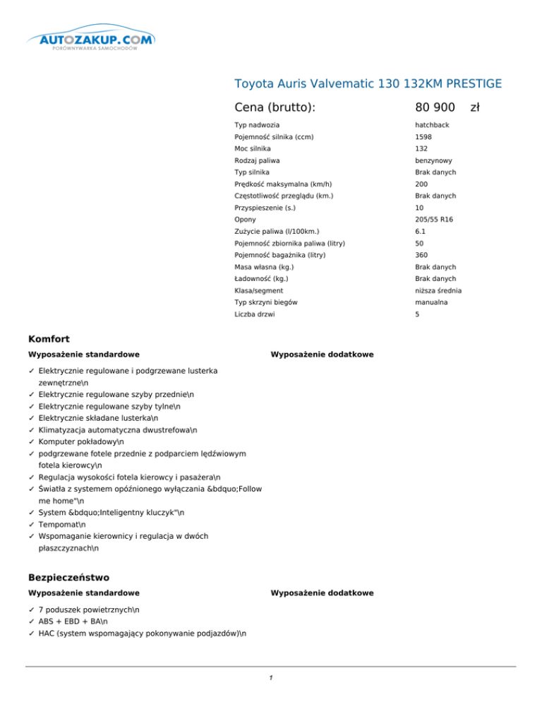 Toyota Auris Valvematic 130 132KM PRESTIGE Cena (brutto): 80 900 Typ nadwozia hatchback Pojemność silnika (ccm) 1598 Moc silnika 132 Rodzaj paliwa benzynowy Typ silnika Brak danych Prędkość maksymalna (km/h) 200 Częstotliwość przeglądu (km.) Brak danych Przyspieszenie (s.) 10 Opony 205/55 R16 Zużycie paliwa (l/100km.) 6.1 Pojemność zbiornika paliwa (litry) 50 Pojemność bagażnika (litry) 360 Masa własna (kg.) Brak danych Ładowność (kg.) Brak danych Klasa/segment niższa średnia Typ skrzyni biegów manualna Liczba drzwi 5 Komfort Wyposażenie standardowe Wyposażenie dodatkowe ✓ Elektrycznie regulowane i podgrzewane lusterka zewnętrzne\n ✓ Elektrycznie regulowane szyby przednie\n ✓ Elektrycznie regulowane szyby tylne\n ✓ Elektrycznie składane lusterka\n ✓ Klimatyzacja automatyczna dwustrefowa\n ✓ Komputer pokładowy\n ✓ podgrzewane fotele przednie z podparciem lędźwiowym fotela kierowcy\n ✓ Regulacja wysokości fotela kierowcy i pasażera\n ✓ Światła z systemem opóźnionego wyłączania „Follow me home"\n ✓ System „Inteligentny kluczyk"\n ✓ Tempomat\n ✓ Wspomaganie kierownicy i regulacja w dwóch płaszczyznach\n Bezpieczeństwo Wyposażenie standardowe Wyposażenie dodatkowe ✓ 7 poduszek powietrznych\n ✓ ABS + EBD + BA\n ✓ HAC (system wspomagający pokonywanie podjazdów)\n 1 zł ✓ ISOFIX na skrajnych tylnych miejscach i wyłącznik poduszki pasażera\n ✓ Lampy przeciwmgielne\n ✓ Sygnalizacja niezapiętych pasów na przednich siedzeniach\n ✓ System stabilizacji toru jazdy i kontroli trakcji VSC + TRC\n Dodatki Wyposażenie standardowe Wyposażenie dodatkowe ✓ Auto High Beam (automatyczne światła drogowe) ✕ Lakier metalik 2300 PLN ✓ Centralny zamek sterowany pilotem ✕ Nawigacja Toyota Touch&Go Plus 3000 PLN ✓ Chromowana końcówka rury wydechowej )Valvematic 130, ✕ Skrzynia Multidrive S(Valvematic 130 w wersji Premium i D-4D 125) wyższych) 5000 PLN ✓ Chromowana listwa na dolnej krawędzi okien\n ✓ Czujniki deszczu i zmierzchu\n ✓ Dzielona (60/40) oraz składana tylna kanapa\n ✓ Felgi aluminiowe, opony 205/ 55/R16\n ✓ Immobilizer\n ✓ Kierunkowskazy w lusterkach\n ✓ Lakierowane klamki i lusterka zewnętrzne\n ✓ Podwójna podłoga bagażnika z systemem składania kanapy Easy Flat\n ✓ Podłokietnik przedni regulowany\n ✓ Podłokietnik tylny z miejscami na napoje\n ✓ Port USB/Aux-In\n ✓ Przyciski na kierownicy do sterowania systemem audio/telefonem\n ✓ Radio RDS+CD+MP3 6 głośników\n ✓ Skórzana kierownica i gałka dźwigni zmiany biegów\n ✓ skrętne lampy biksenonowe\n ✓ Światła do jazdy dziennej typu LED\n ✓ System automatycznego parkowania (SIPA) z czujnikami z przodui z tyłu oraz centralnym wyświetlaczem na desce rozdzielczej\n ✓ System multimedialny Toyota Touch z funkcją Bluetooth i kamerą cofania\n ✓ Tapicerka materiałowa + skórzane boczki\n ✓ Tylny spojler\n ✓ Wewnętrzne lusterko elektrochromatyczne\n ✓ Zestaw naprawczy\n Doprecyzowanie oferty ✕ Pakiet JBL - 6000 PLN Nawigacja Toyota Touch&Go Plus system audio JBL(wzmacniacz + 9 głośników) 2 ✕ Pakiet Executive - 7500 PLN 17" felgi aluminiowe dach panoramiczny Skyview z elektryczną roletą Przyciemniane szyby tylne skórzane fotele Kontakt: Nazwa użytkownika: admin Nazwa firmy: qqq Adres: qqq 12, 41-706 qqq1, NIP: 954 REGON: 1 Telefon: 123, 1 Fax: 1 Email: 1 www: 3