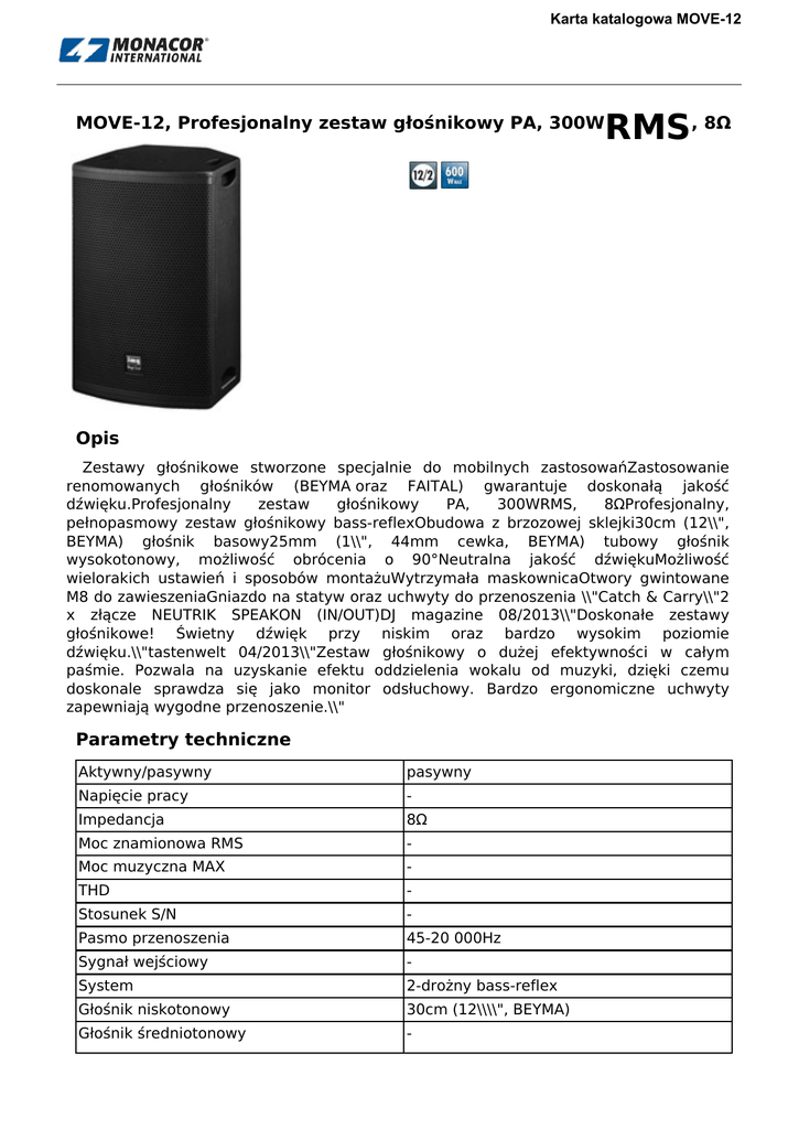 Karta katalogowa MOVE-12 RMS, 8Ω MOVE-12, Profesjonalny zestaw głośnikowy PA, 300W Opis Zestawy głośnikowe stworzone specjalnie do mobilnych zastosowańZastosowanie renomowanych głośników (BEYMA oraz FAITAL) gwarantuje doskonałą jakość dźwięku.Profesjonalny zestaw głośnikowy PA, 300WRMS, 8ΩProfesjonalny, pełnopasmowy zestaw głośnikowy bass-reflexObudowa z brzozowej sklejki30cm (12\\", BEYMA) głośnik basowy25mm (1\\", 44mm cewka, BEYMA) tubowy głośnik wysokotonowy, możliwość obrócenia o 90°Neutralna jakość dźwiękuMożliwość wielorakich ustawień i sposobów montażuWytrzymała maskownicaOtwory gwintowane M8 do zawieszeniaGniazdo na statyw oraz uchwyty do przenoszenia \\"Catch & Carry\\"2 x złącze NEUTRIK SPEAKON (IN/OUT)DJ magazine 08/2013\\"Doskonałe zestawy głośnikowe! Świetny dźwięk przy niskim oraz bardzo wysokim poziomie dźwięku.\\"tastenwelt 04/2013\\"Zestaw głośnikowy o dużej efektywności w całym paśmie. Pozwala na uzyskanie efektu oddzielenia wokalu od muzyki, dzięki czemu doskonale sprawdza się jako monitor odsłuchowy. Bardzo ergonomiczne uchwyty zapewniają wygodne przenoszenie.\\" Parametry techniczne Aktywny/pasywny pasywny Napięcie pracy - Impedancja 8Ω Moc znamionowa RMS - Moc muzyczna MAX - THD - Stosunek S/N - Pasmo przenoszenia 45-20 000Hz Sygnał wejściowy - System 2-drożny bass-reflex Głośnik niskotonowy 30cm (12\\\\", BEYMA) Głośnik średniotonowy - Karta katalogowa MOVE-12 Głośnik wysokotonowy 25mm (1\\\\") dyn. głośnikśrednio-wysokotonowy(44mm cewka, BEYMA) Liczba głośników 2 Kąt promieniowania - Moc znamionowa RMS 300W Moc muzyczna MAX 600W Czułość 97dB Max SPL 124dB Sposób montażu - Dopuszcz. temp. otoczenia 0-40 °C Zasilanie - Wymiary 350x612x382mm Szerokość 350mm Wysokość 612mm Głębokość 382mm Waga 19.5kg Wejścia 1 x NEUTRIK SPEAKON Wyjścia 1 x NEUTRIK SPEAKON zrówn. in/out Inne cechy - 2/2 Powered by TCPDF (www.tcpdf.org)