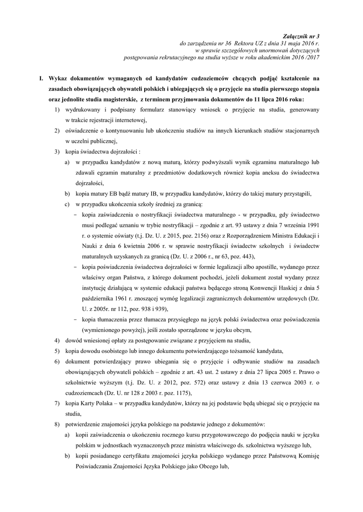 Załącznik nr 3 do zarządzenia nr 36 Rektora UZ z dnia 31 maja 2016 r. w sprawie szczegółowych unormowań dotyczących postępowania rekrutacyjnego na studia wyższe w roku akademickim 2016 /2017 I. Wykaz dokumentów wymaganych od kandydatów cudzoziemców chcących podjąć kształcenie na zasadach obowiązujących obywateli polskich i ubiegających się o przyjęcie na studia pierwszego stopnia oraz jednolite studia magisterskie, z terminem przyjmowania dokumentów do 11 lipca 2016 roku: 1) wydrukowany i podpisany formularz stanowiący wniosek o przyjęcie na studia, generowany w trakcie rejestracji internetowej, 2) oświadczenie o kontynuowaniu lub ukończeniu studiów na innych kierunkach studiów stacjonarnych w uczelni publicznej, 3) kopia świadectwa dojrzałości : a) w przypadku kandydatów z nową maturą, którzy podwyższali wynik egzaminu maturalnego lub zdawali egzamin maturalny z przedmiotów dodatkowych również kopia aneksu do świadectwa dojrzałości, b) kopia matury EB bądź matury IB, w przypadku kandydatów, którzy do takiej matury przystąpili, c) w przypadku ukończenia szkoły średniej za granicą: - kopia zaświadczenia o nostryfikacji świadectwa maturalnego - w przypadku, gdy świadectwo musi podlegać uznaniu w trybie nostryfikacji – zgodnie z art. 93 ustawy z dnia 7 września 1991 r. o systemie oświaty (t.j. Dz. U. z 2015, poz. 2156) oraz z Rozporządzeniem Ministra Edukacji i Nauki z dnia 6 kwietnia 2006 r. w sprawie nostryfikacji świadectw szkolnych i świadectw maturalnych uzyskanych za granicą (Dz. U. z 2006 r., nr 63, poz. 443), - kopia poświadczenia świadectwa dojrzałości w formie legalizacji albo apostille, wydanego przez właściwy organ Państwa, z którego dokument pochodzi, jeżeli dokument został wydany przez instytucję działającą w systemie edukacji państwa będącego stroną Konwencji Haskiej z dnia 5 października 1961 r. znoszącej wymóg legalizacji zagranicznych dokumentów urzędowych (Dz. U. z 2005r. nr 112, poz. 938 i 939), - kopia tłumaczenia przez tłumacza przysięgłego na język polski świadectwa oraz poświadczenia (wymienionego powyżej), jeśli zostało sporządzone w języku obcym, 4) dowód wniesionej opłaty za postępowanie związane z przyjęciem na studia, 5) kopia dowodu osobistego lub innego dokumentu potwierdzającego tożsamość kandydata, 6) dokument potwierdzający prawo ubiegania się o przyjęcie i odbywanie studiów na zasadach obowiązujących obywateli polskich – zgodnie z art. 43 ust. 2 ustawy z dnia 27 lipca 2005 r. Prawo o szkolnictwie wyższym (t.j. Dz. U. z 2012, poz. 572) oraz ustawy z dnia 13 czerwca 2003 r. o cudzoziemcach (Dz. U. nr 128 z 2003 r. poz. 1175), 7) kopia Karty Polaka – w przypadku kandydatów, którzy na jej podstawie będą ubiegać się o przyjęcie na studia, 8) potwierdzenie znajomości języka polskiego na podstawie jednego z dokumentów: a) kopii zaświadczenia o ukończeniu rocznego kursu przygotowawczego do podjęcia nauki w języku polskim w jednostkach wyznaczonych przez ministra właściwego ds. szkolnictwa wyższego lub, b) kopii posiadanego certyfikatu znajomości języka polskiego wydanego przez Państwową Komisję Poświadczania Znajomości Języka Polskiego jako Obcego lub, c) potwierdzenia w formie pisemnej przez wydziałową komisję rekrutacyjną wydziału prowadzącego studia w języku polskim, że przygotowanie oraz stopień znajomości języka polskiego przez kandydata, pozwalają na podjęcie przez niego studiów w języku polskim, 9) potwierdzenie znajomości języka angielskiego – dotyczy wyłącznie kandydatów podejmujących kształcenie na studiach prowadzonych w język angielskim w postaci dokumentu potwierdzającego ukończenie za granica szkoły ponadpodstawowej, w której zajęcia prowadzone były w języku angielskim i są to świadectwa, dyplomy oraz inne dokumenty, wymienione w załączniku nr 2 do rozporządzenia Prezesa Rady Ministrów z dnia 24 stycznia 2007 r. w sprawie sposobu przeprowadzania postepowania kwalifikacyjnego w służbie cywilnej (Dz. U. rr 13, poz. 82 i i nr 249, poz. 1857 oraz z 2008 r., nr. 93, poz. 587), 10) kopia potwierdzenia legalizacji pobytu: wiza lub karta czasowego pobytu (zezwolenie na zamieszkanie na czas oznaczony), lub karta stałego pobytu (zezwolenie na osiedlenie się), lub inny dokument uprawniający do pobytu na terytorium Rzeczpospolitej Polskiej, 11) zaświadczenie lekarskie, stwierdzające brak przeciwwskazań do podjęcia kształcenia na obranym kierunku studiów i formie kształcenia, 12) kopia polisy ubezpieczeniowej na wypadek choroby lub następstw nieszczęśliwych wypadków na okres kształcenia w Polsce albo kopia Europejskiej Karty Ubezpieczenia Zdrowotnego (w przypadku braku – należy przystąpić do ubezpieczenia w Narodowym Funduszu Zdrowia). 13) dodatkowe dokumenty: a) kopia zaświadczenia wydanego przez komitet organizacyjny danej olimpiady - dotyczy wyłącznie kandydatów będących laureatami albo finalistami olimpiad stopnia centralnego, b) oświadczenie, iż na maturze z języka polskiego kandydat nie korzystał z preferencji przewidzianych dla osób z dysortografią i innymi podobnymi dysfunkcjami - dotyczy wyłącznie kandydatów deklarujących we wniosku o przyjęcia na kierunek pedagogika specjalności: edukacja elementarna i terapia pedagogiczna, edukacja elementarna i wczesna edukacja artystyczna, edukacja elementarna i wczesne nauczanie języka obcego, c) kopia odpowiedniego certyfikatu - dotyczy wyłącznie kandydatów ubiegających się o przyjęcie na kierunki: filologia, filologia rosyjska z dodatkowym językiem angielskim oraz pedagogika, specjalność edukacja elementarna i wczesne nauczanie języka obcego, na podstawie certyfikatu, II. Wykaz dokumentów wymaganych od kandydatów cudzoziemców chcących podjąć kształcenie na zasadach obowiązujących obywateli polskich i zakwalifikowanych do przyjęcia na studia pierwszego stopnia oraz jednolite st