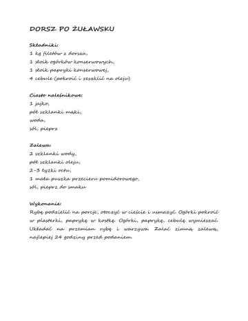 DORSZ PO ŻUŁAWSKU Składniki: 1 kg filetów z dorsza, 1 słoik ogórków konserwowych, 1 słoik papryki konserwowej, 4 cebule (pokroić i zeszklić na oleju) Ciasto naleśnikowe: 1 jajko, pół szklanki mąki, woda, sól, pieprz Zalewa: 2 szklanki wody, pół szklanki oleju, 2-3 łyżki octu, 1 mała puszka przecieru pomidorowego, sól, pieprz do smaku Wykonanie: Rybę podzielić na porcje, otoczyć w cieście i usmażyć. Ogórki pokroić w plasterki, paprykę w kostkę. Ogórki, paprykę, cebulę wymieszać. Układać na przemian rybę i warzywa. Zalać zimną najlepiej 24 godziny przed podaniem. zalewą,